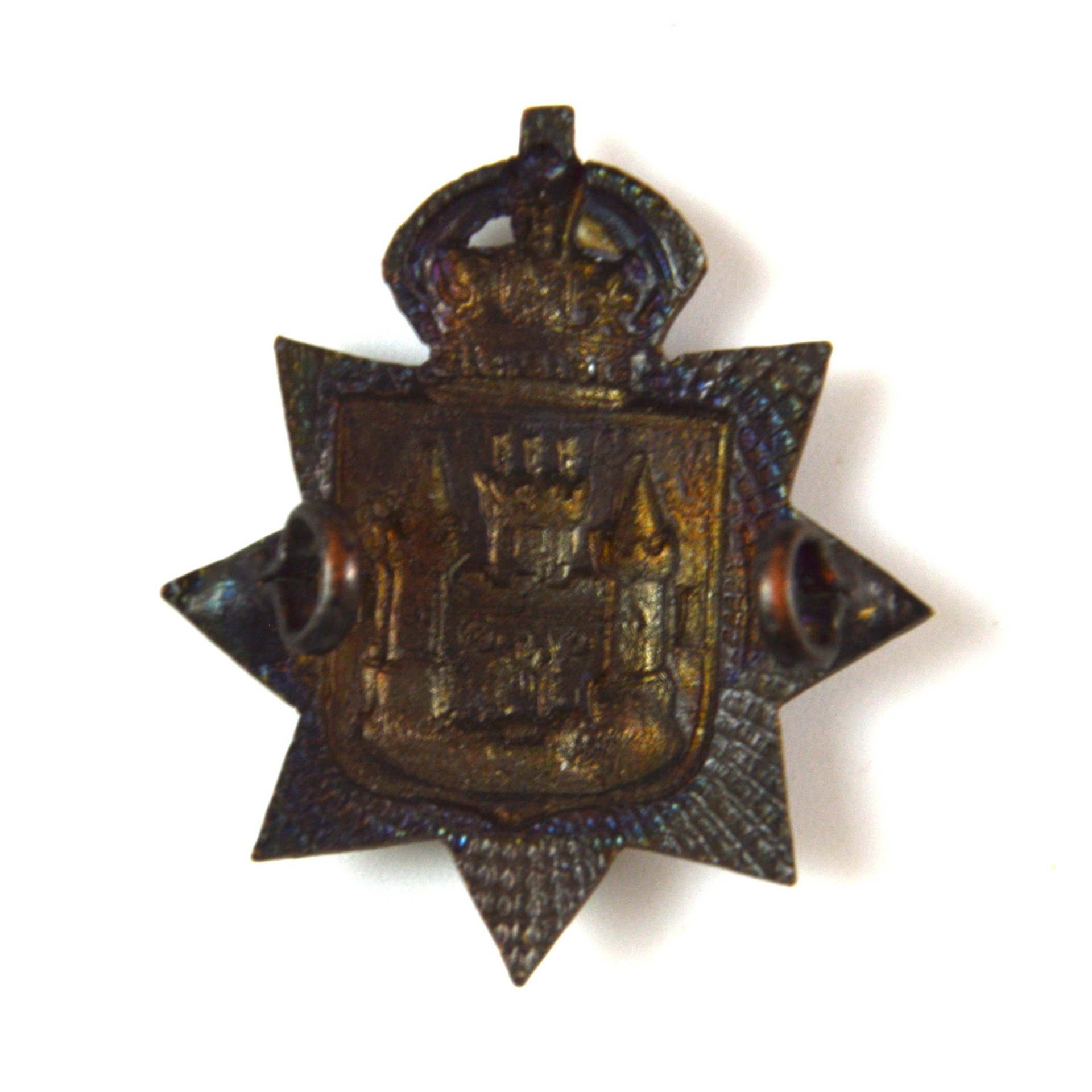 This collar badge displays the regiment’s distinctive insignia, featuring: