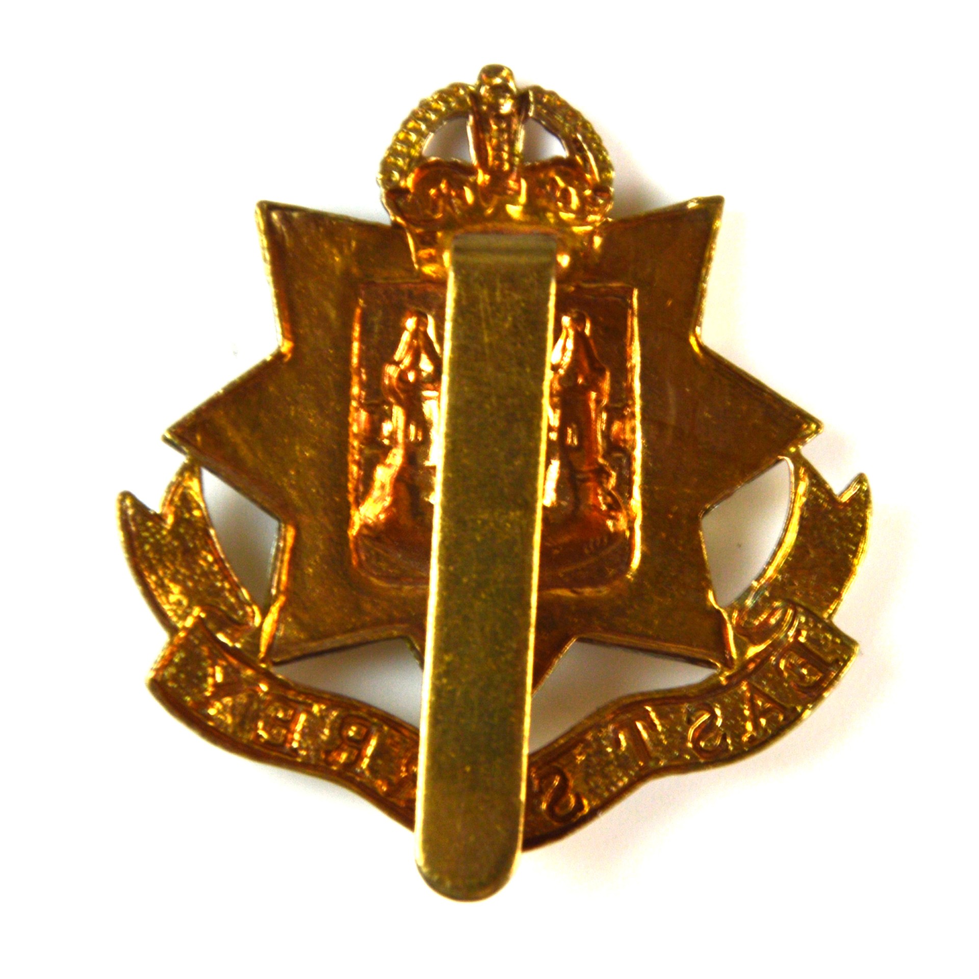 Manufactured in bi-metal, with a white metal star and castle device and gilding metal crown, shield and scroll, this restrike example provides a sharply defined representation of the traditional regimental pattern. East Surrey Regiment cap badges are collected as examples of Edwardian and mid-twentieth century British Army infantry militaria, regimental insignia of the Home Counties, and historic uniform hardware of the county regiment era.