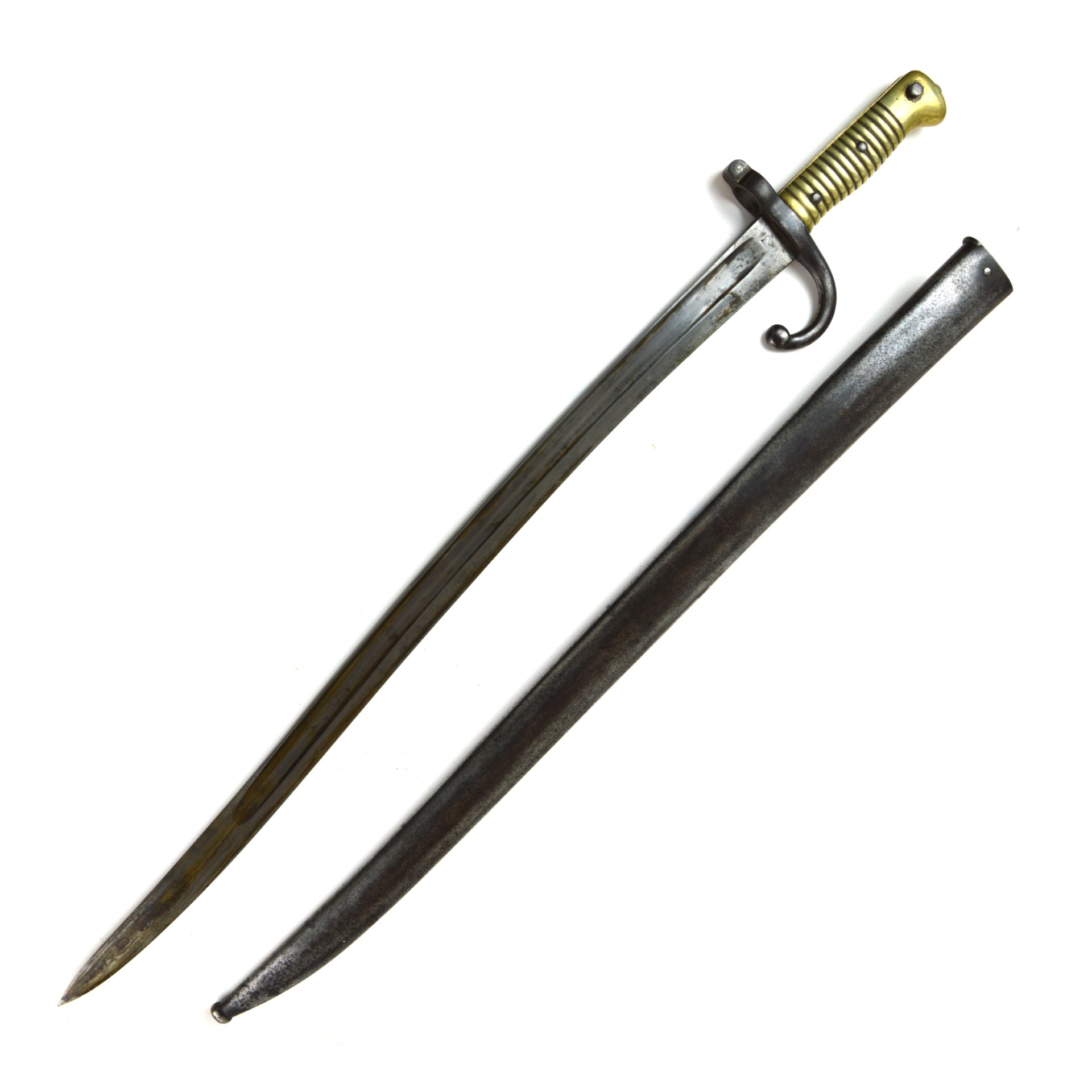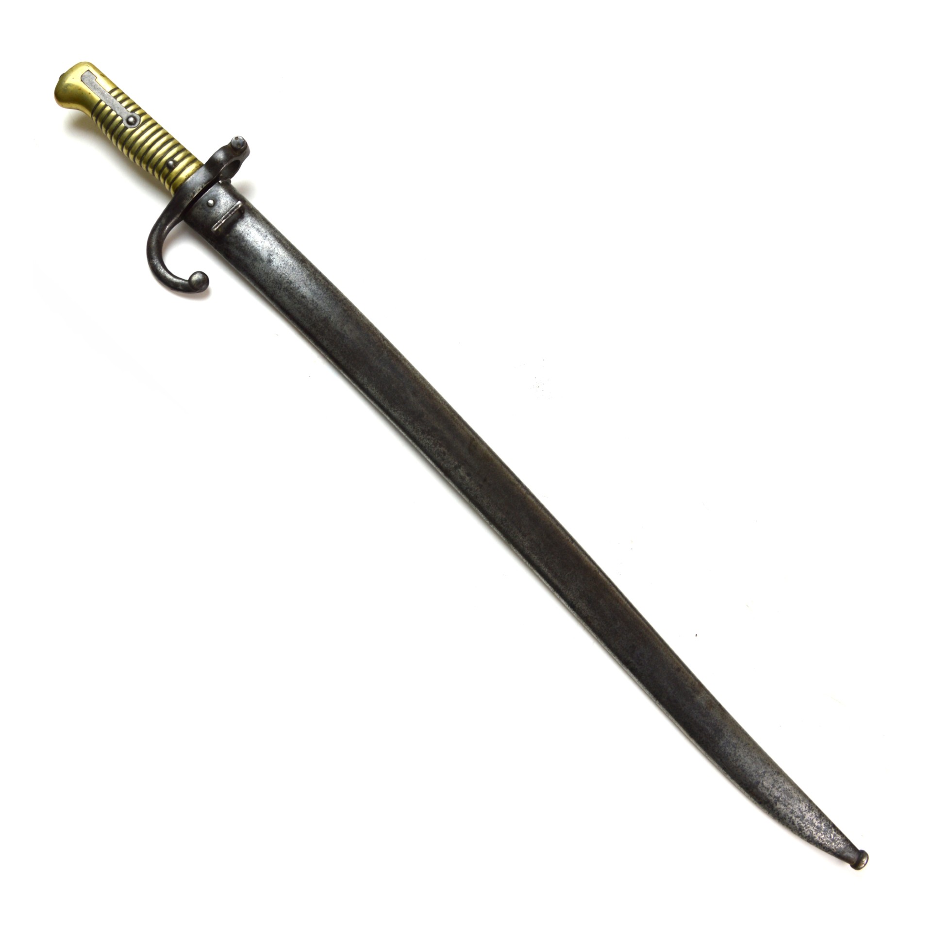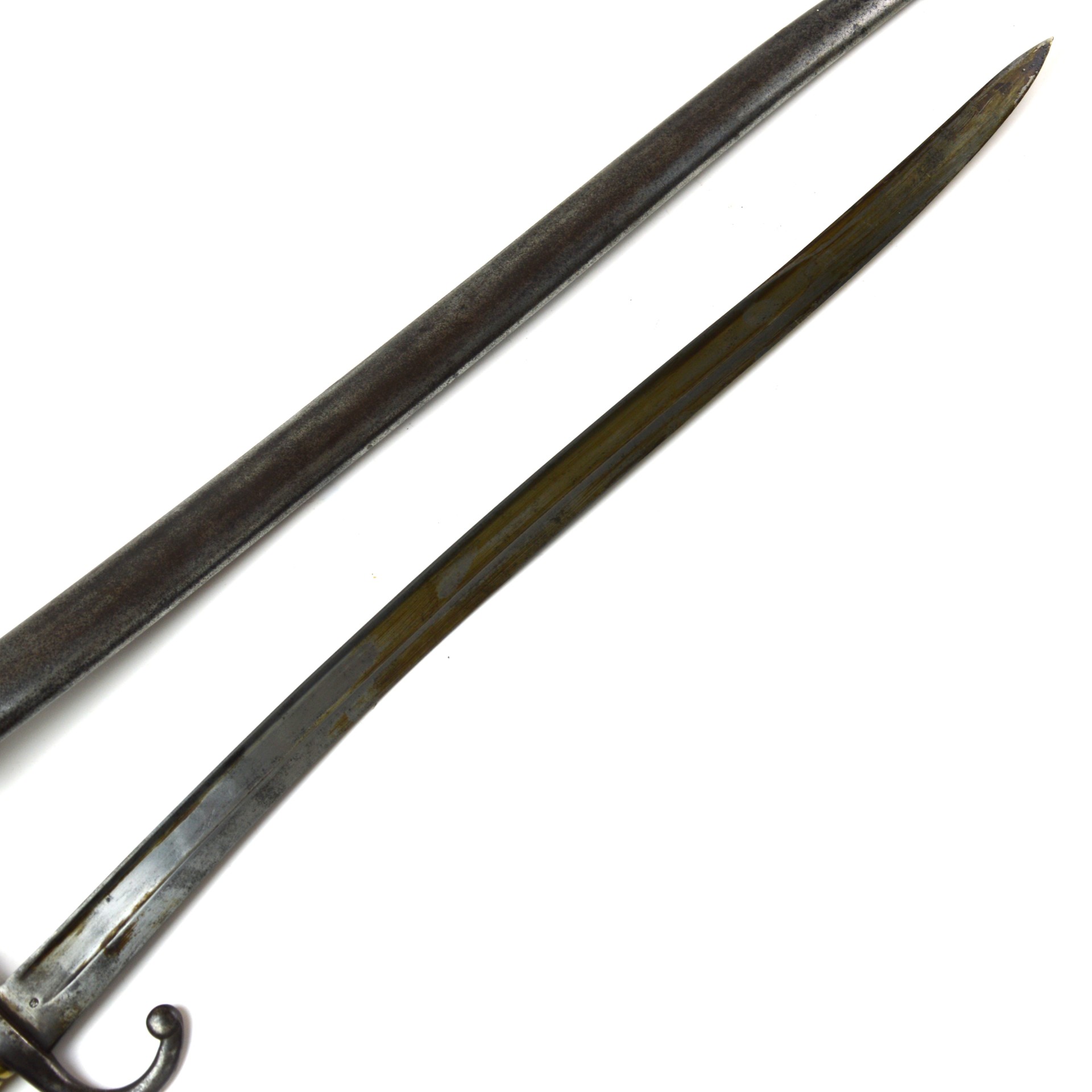 Egyptian M1869 Remington Rolling Block Bayonet, designed to fit the Remington rolling block rifles adopted by Egypt in the second half of the 19th century, manufactured by Weyersberg, Kirschbaum & Co., Solingen, Germany. The piece reflects the period export production supplied to Egyptian arsenals and colonial contract requirements. Based on the M1866 Chassepot Bayonet, the blade form is of the long, yataghan fullered type with spear point profile, and the socket is formed to engage the Remington rolling-block muzzle and lock securely with the locking catch onto the rifle’s bayonet bar. The bayonet is contained within a steel scabbard with a steel loop for wear within a frog