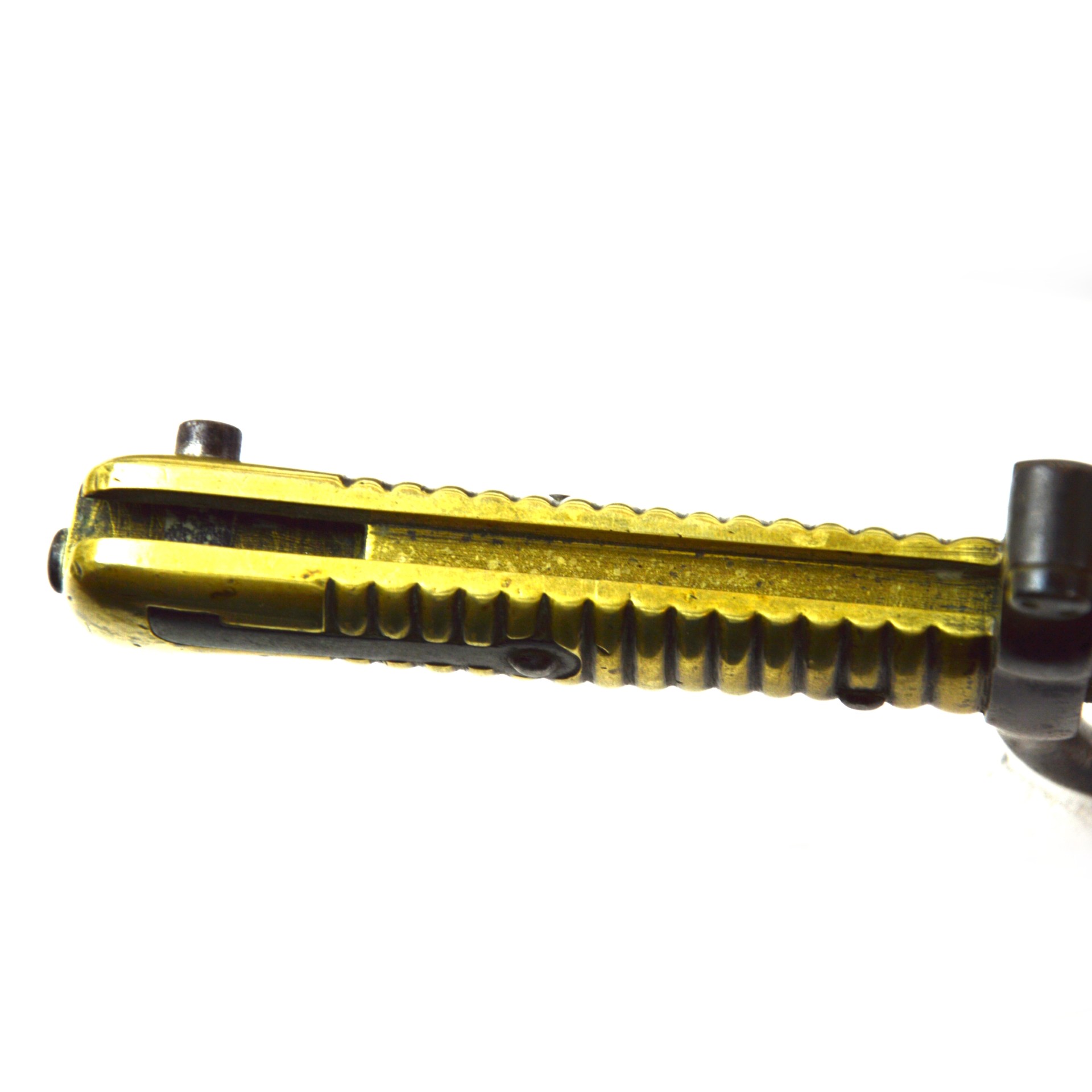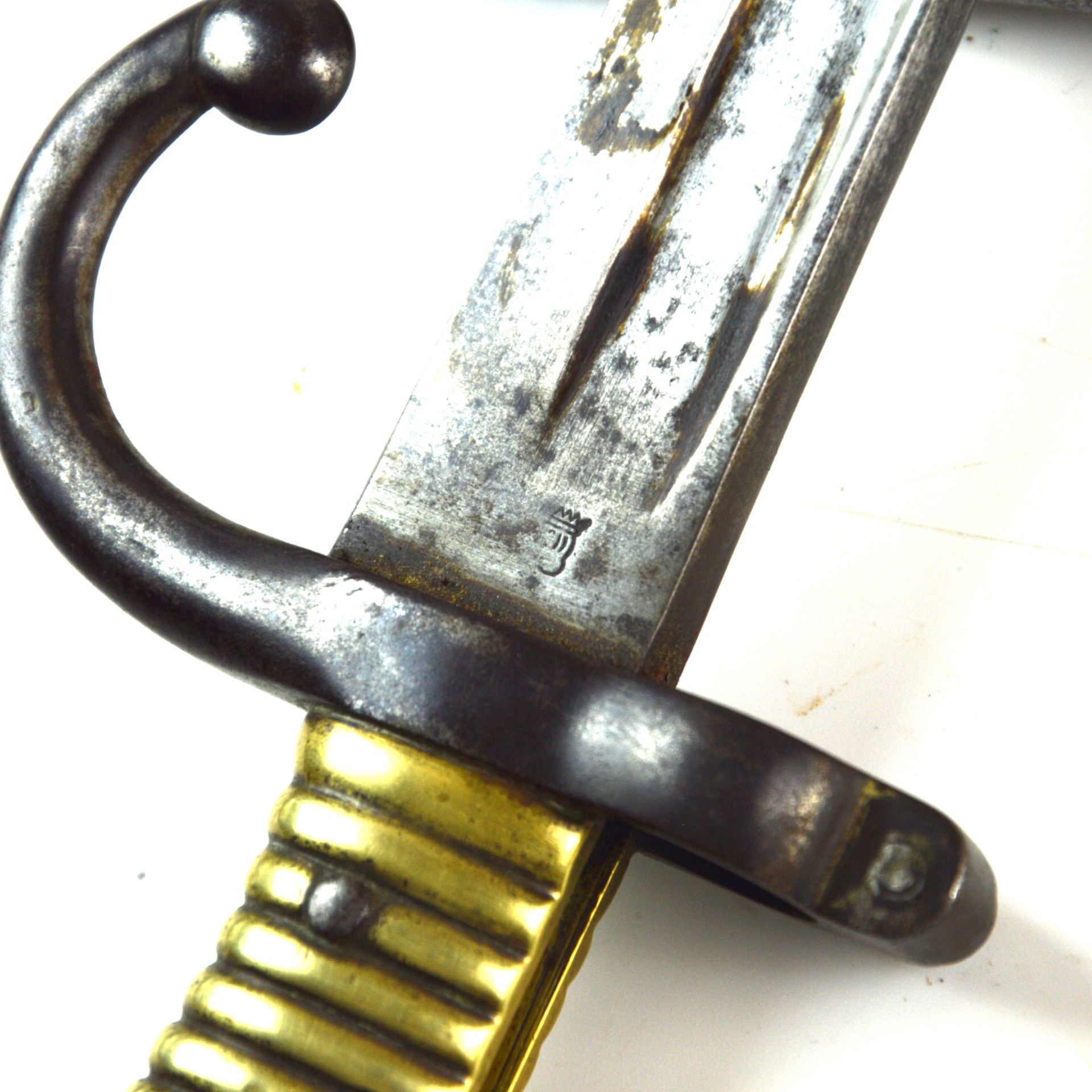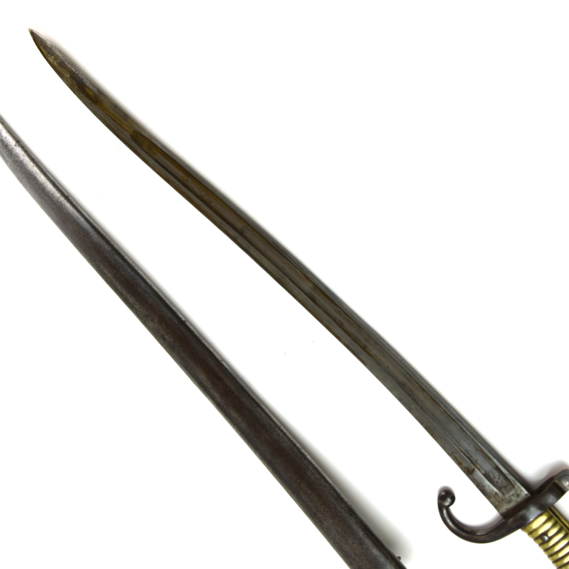 Good. The blade shows even age patina with light surface staining; fullers remain crisp, and the maker’s stamp is still mostly visible. The socket and locking catch are sound and functional. The brass grips are secure with period wear and intact rivets. No major bends or repairs noted. The scabbard is in reasonable condition with expected wear.