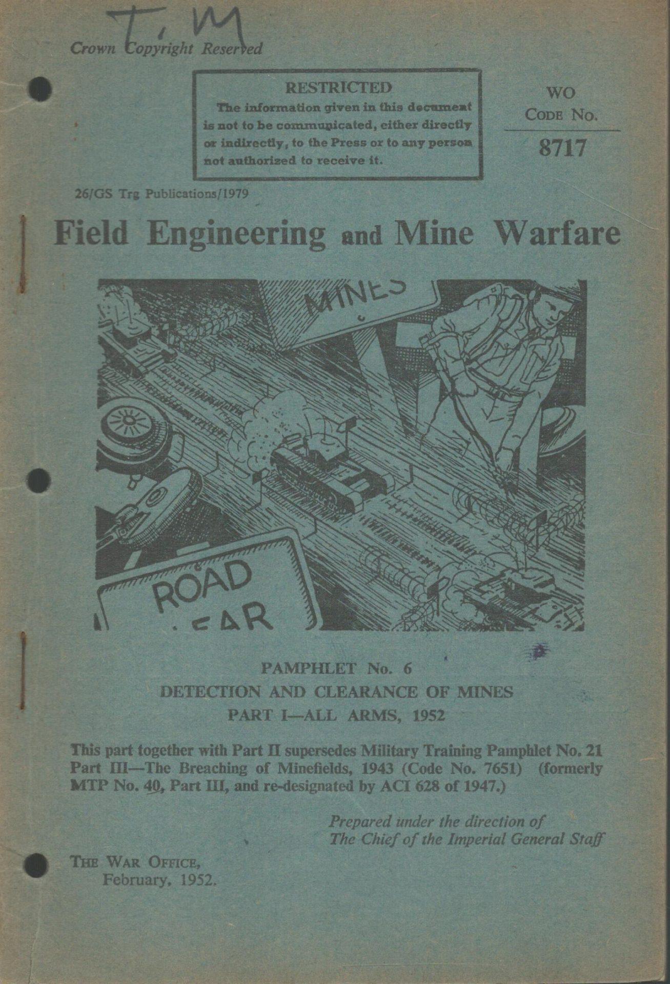 A military training manual title covering Field Engineering and Mine Warfare, Pamphlet No.6 Detection and Clearance of Mines Part 1 (All Arms) . 1952 1954. Essential reading for the military book collector.