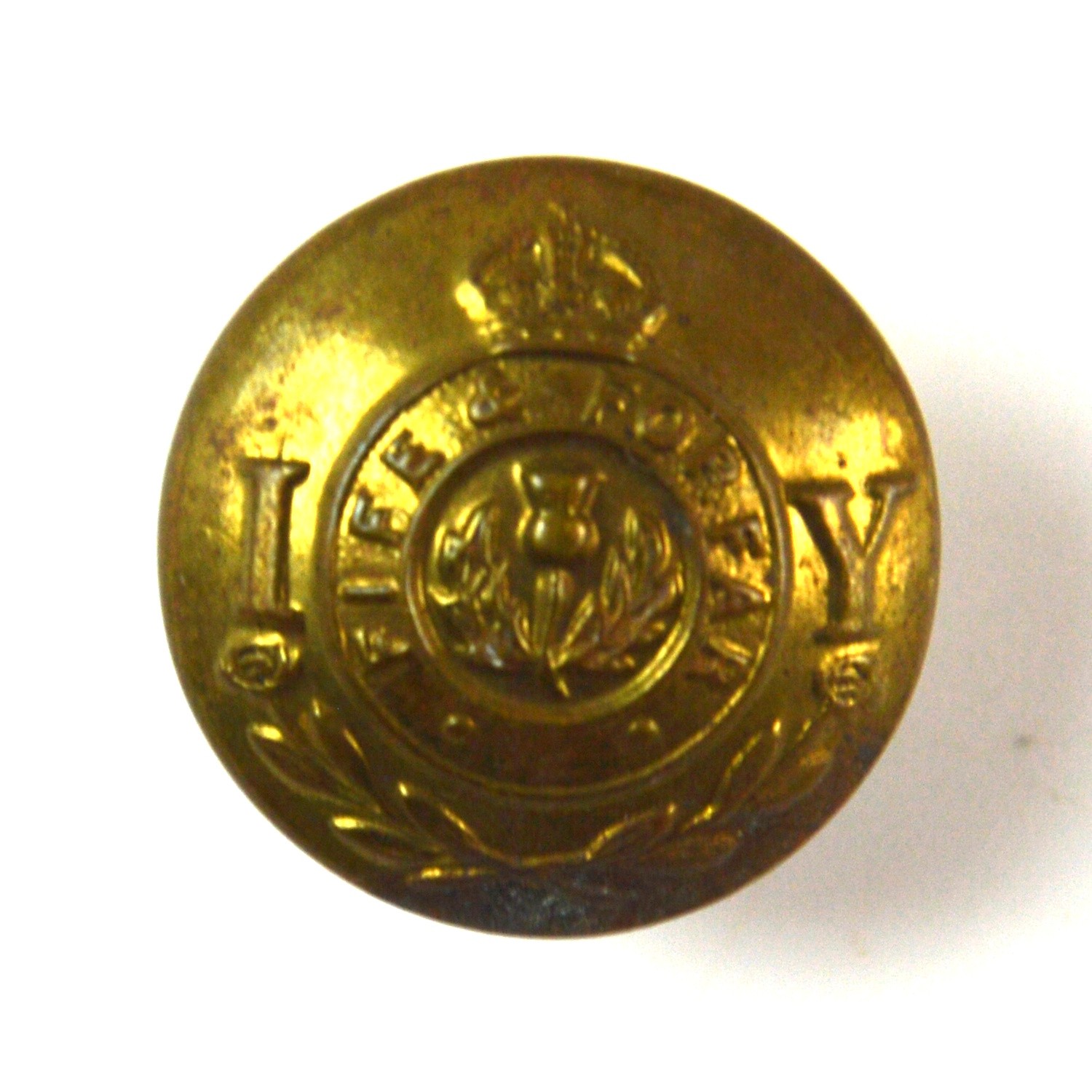 Brass uniform button of the Fife and Forfar Imperial Yeomanry, produced to the short-lived 1901–1908 pattern introduced following the coronation of Edward VII. The Imperial Yeomanry was formed in 1901, and buttons of this type were worn on full dress and service uniforms during the early Edwardian period, prior to the regiment’s reorganisation into the Territorial Force in 1908.