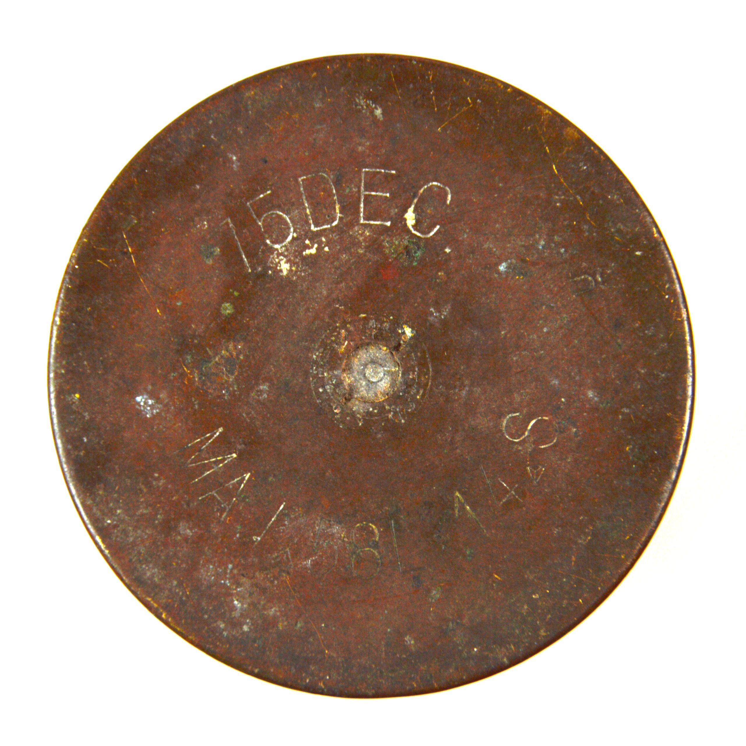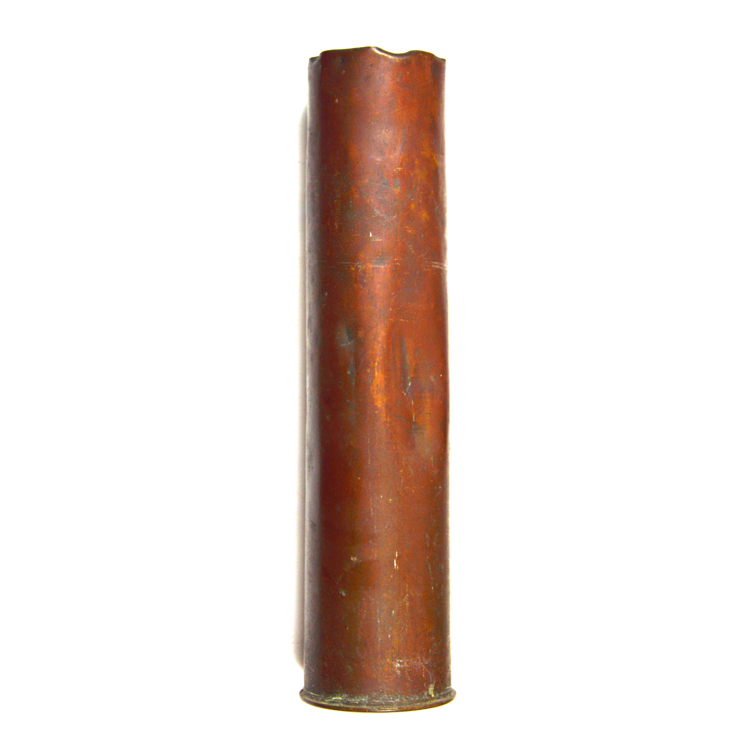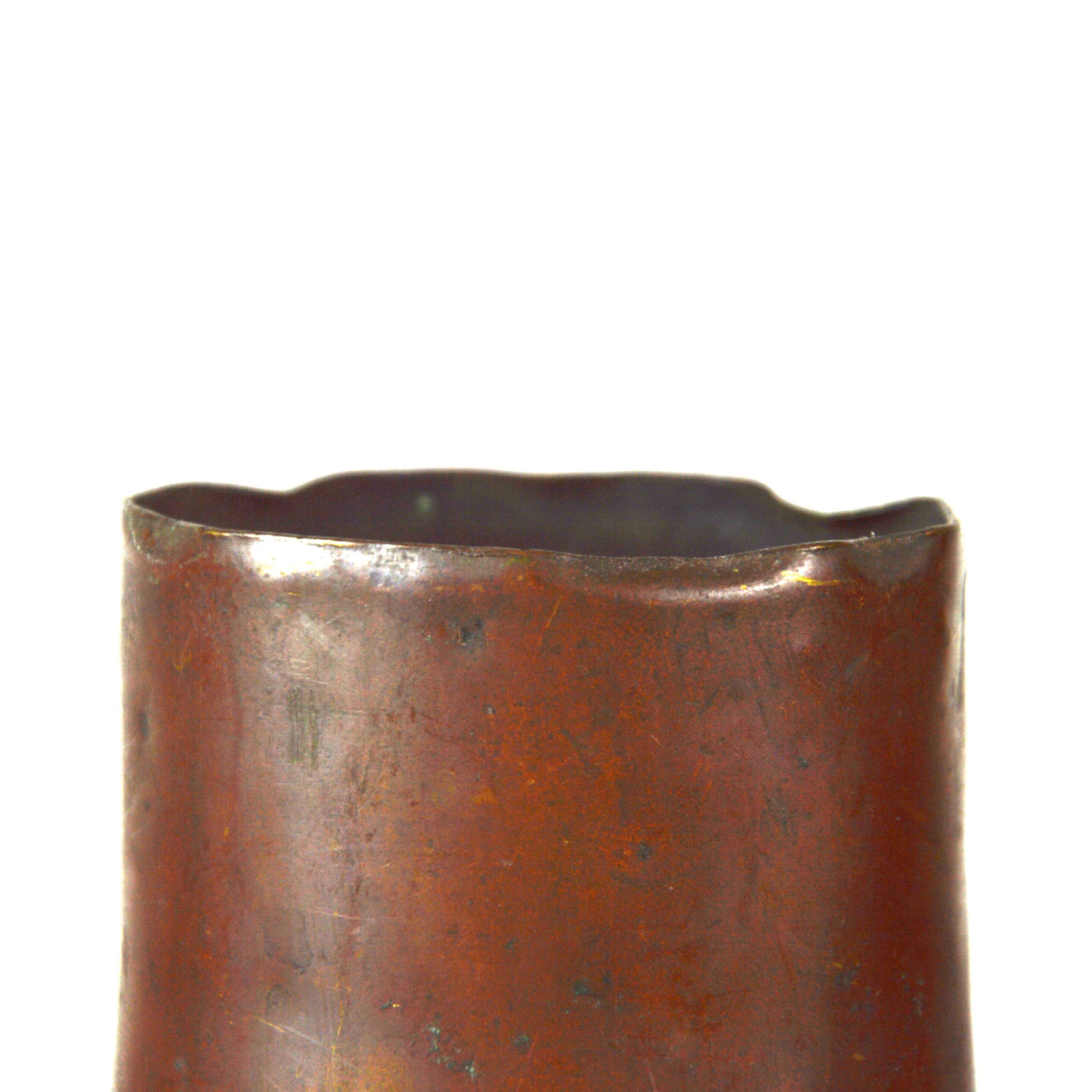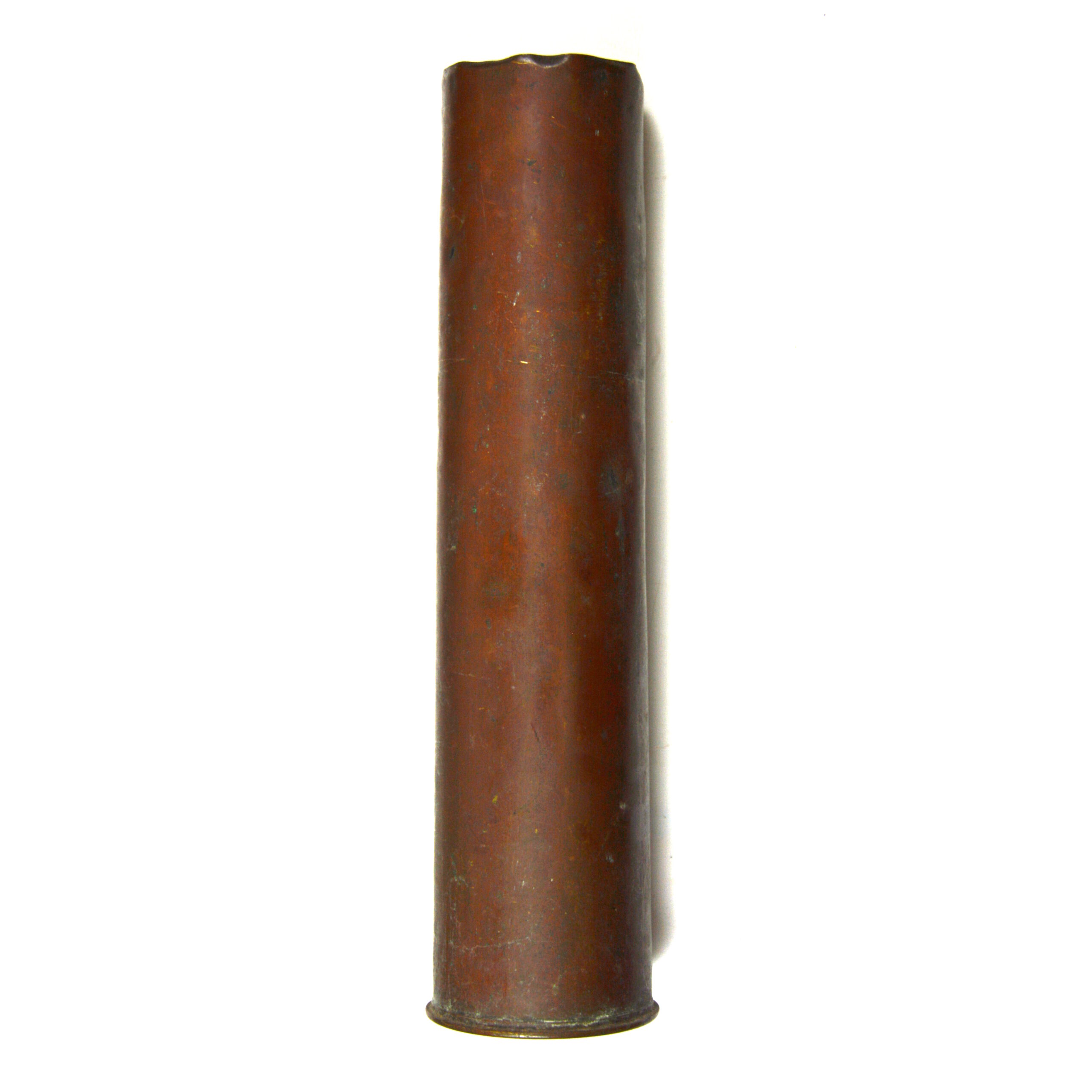 Good. The shell case is empty and inert for display. Brass exhibits an even-aged patina with toning and a deep dent on one side from firing. The headstamps mostly remain clear and legible. The rim of the case’s mouth is distorted with no splits or major dents noted. Other surface dings are present, typical of a First World War-dated artillery case, but structurally sound for mounting or cabinet display.