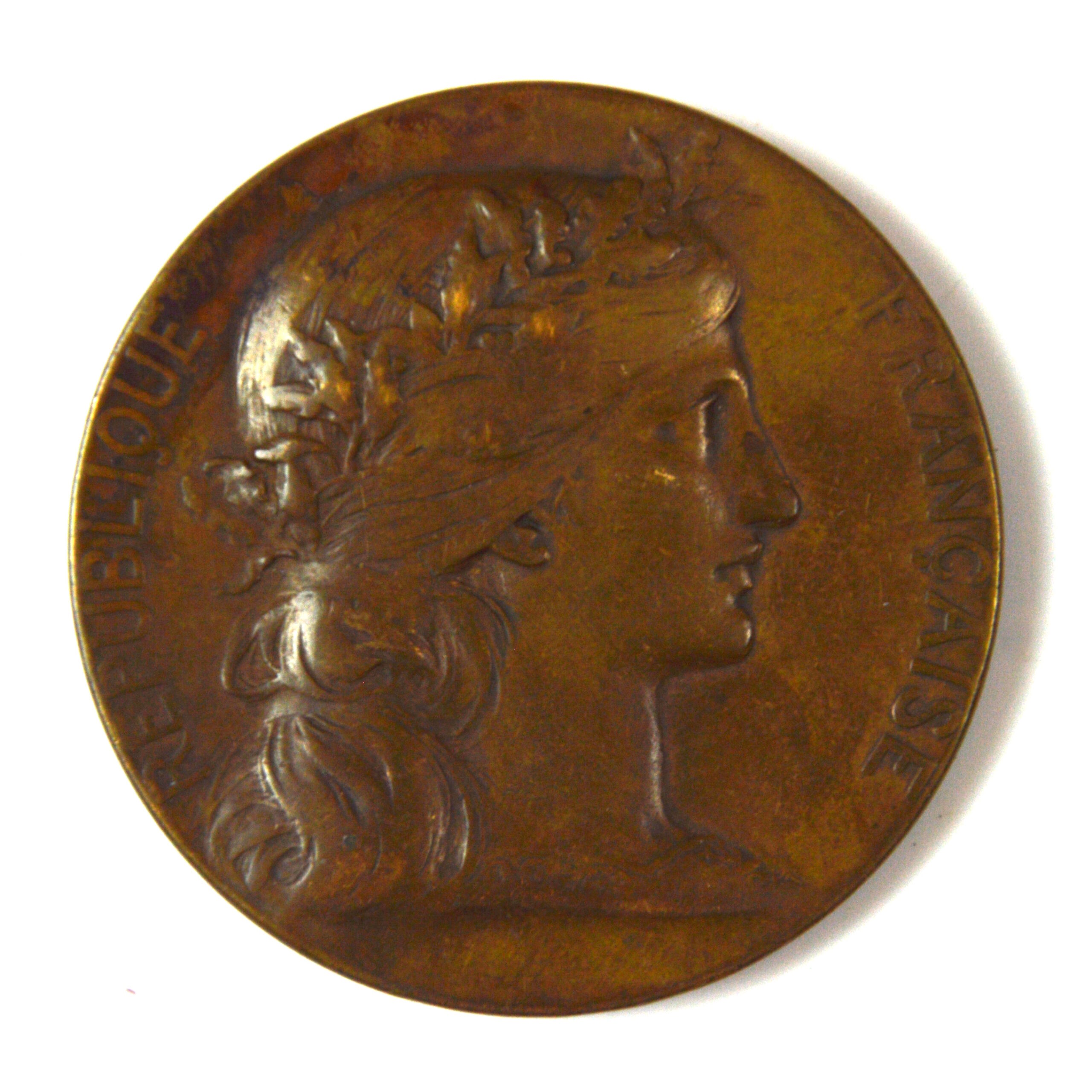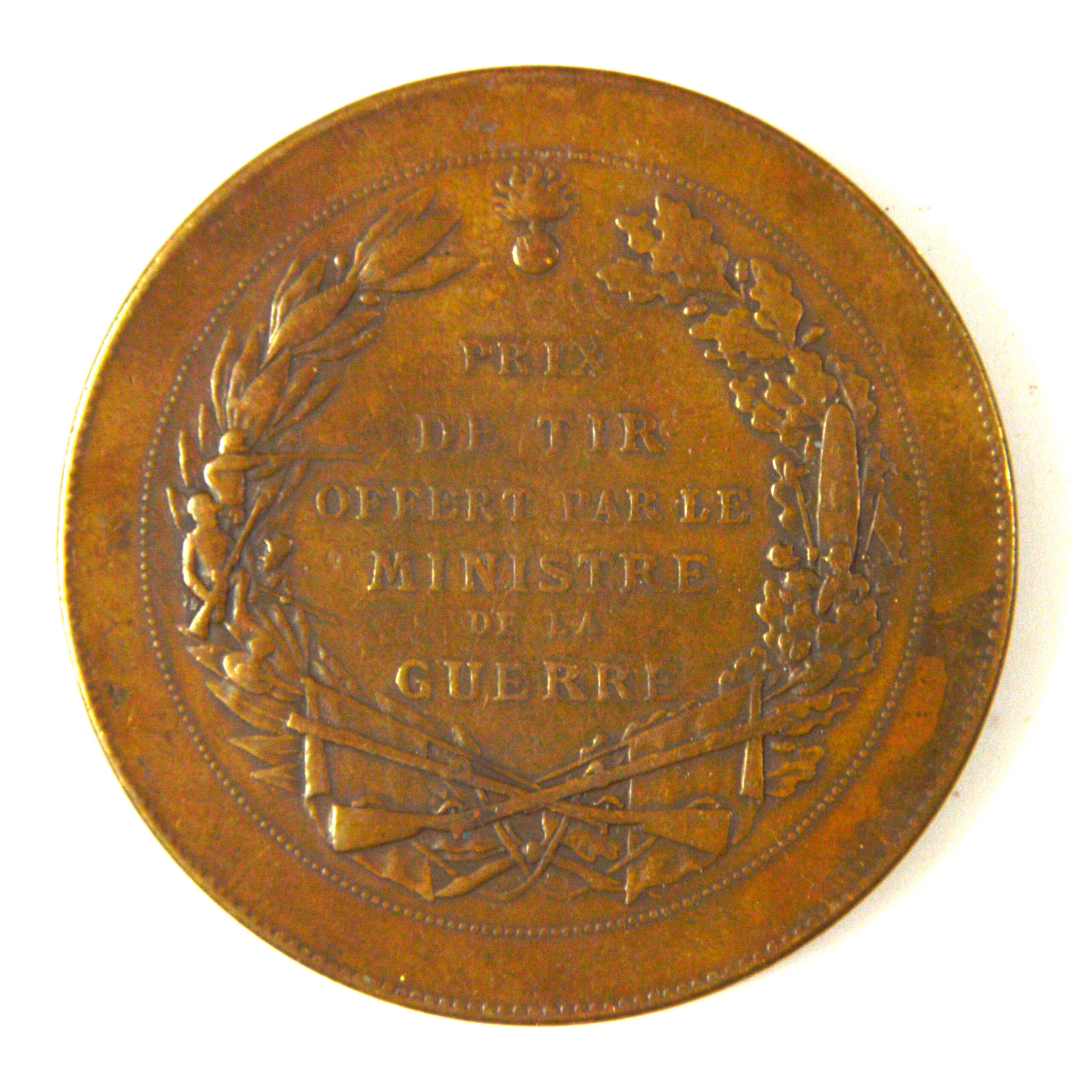 The design features allegorical or national motifs in relief, including representations of the French Republic such as Marianne on the obverse with the surrounding text reading “RÉPUBLIQUE FRANÇAISE”, with the reverse bearing the military symbols and inscription “PRÉPARATION / MILITAIRE / PRIX OFFERT / PAR LE MINISTRE / DE LA / GUERRE”. The bronze construction provides a durable and traditional finish consistent with official medallions of the period. The rim is marked “BRONZE”.