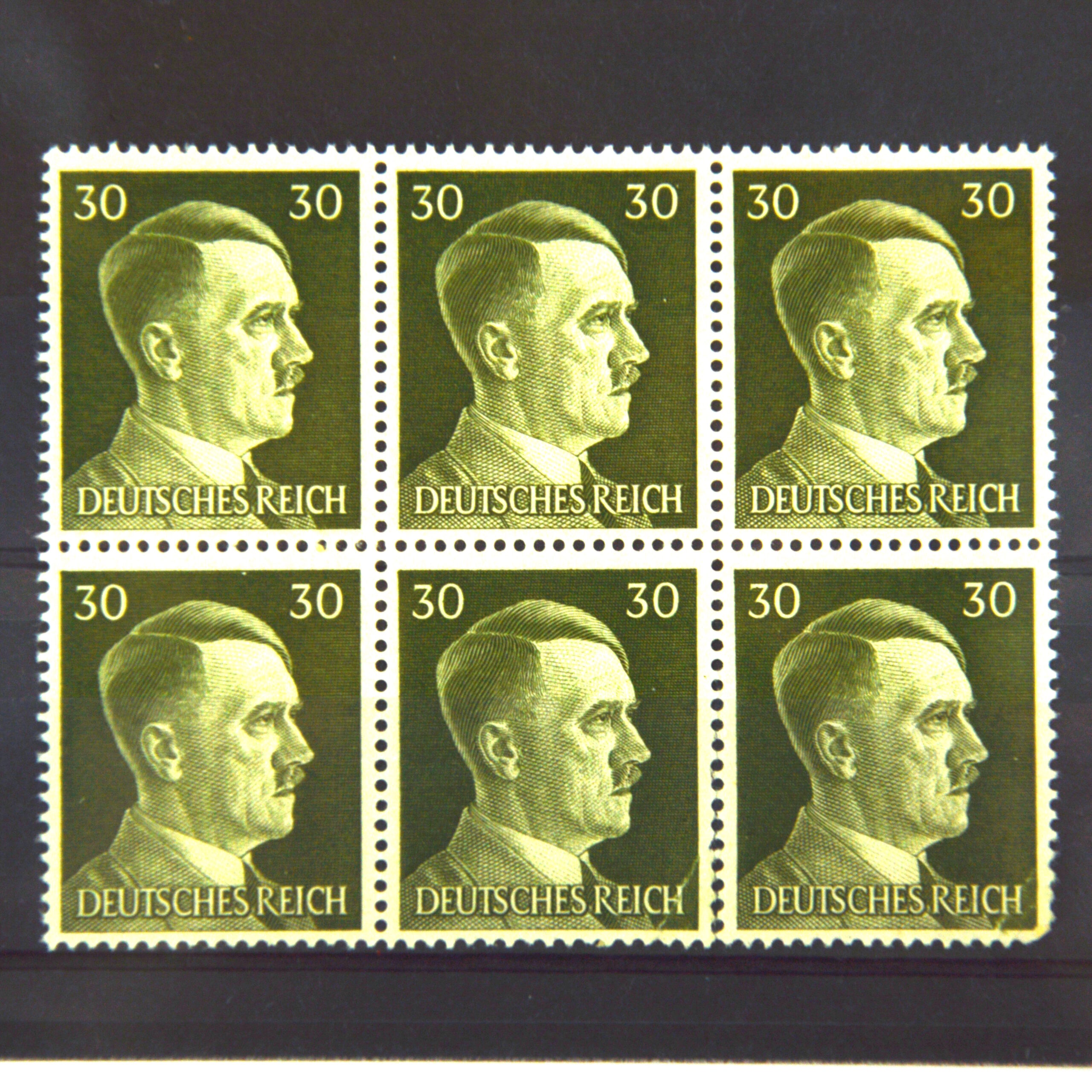 German Third Reich “Hitler Head” 30 Pfennig postage stamp (set of 6), a group of mid-20th-century issues from the period of National Socialist Germany, featuring the portrait of Adolf Hitler as the central design. These stamps formed part of the standard definitive series in circulation during the regime’s later years.