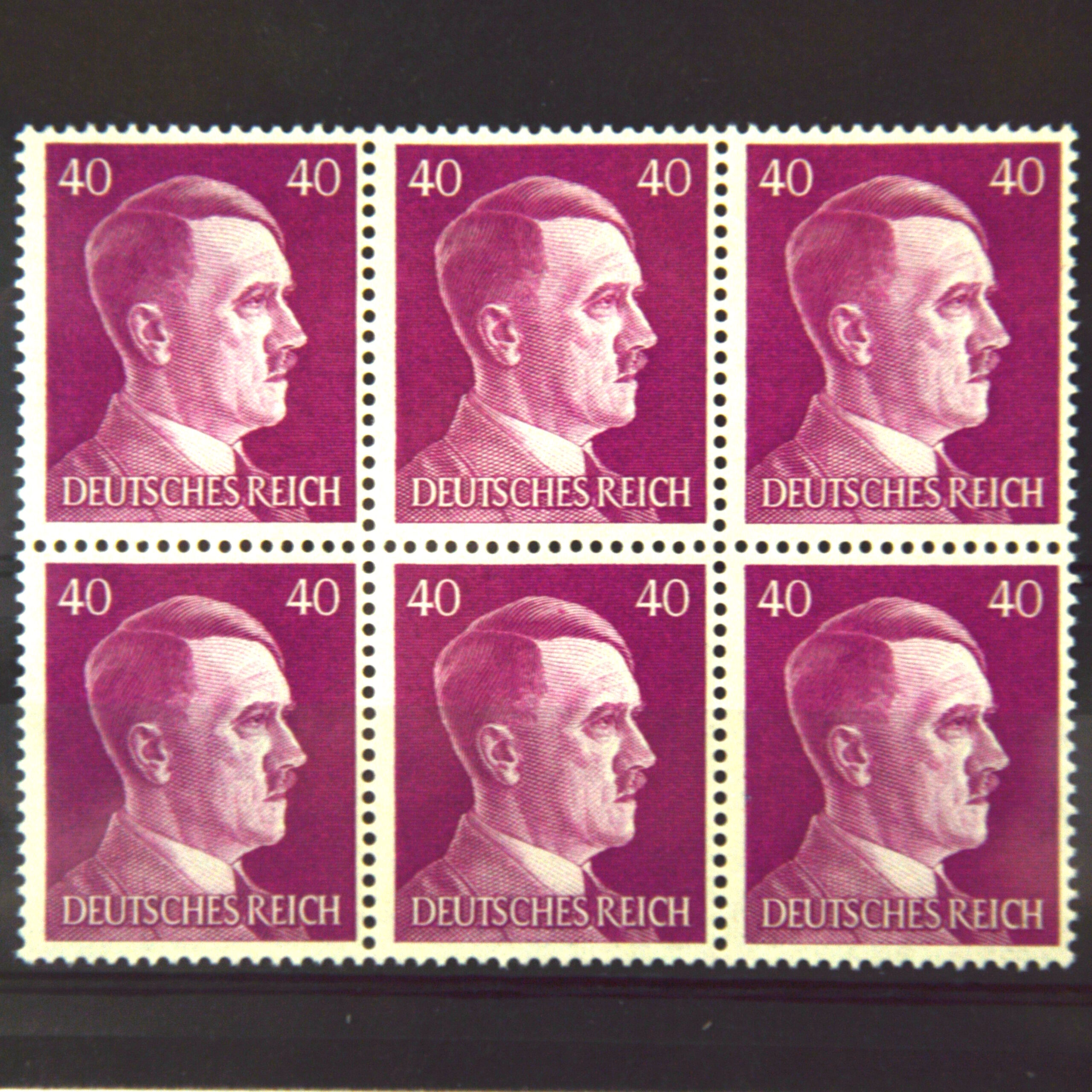 German Third Reich “Hitler Head” 40 Pfennig postage stamp (set of 6), a group of mid-20th-century issues from the period of National Socialist Germany, featuring the portrait of Adolf Hitler as the central design. These stamps formed part of the standard definitive series in circulation during the regime’s later years.
