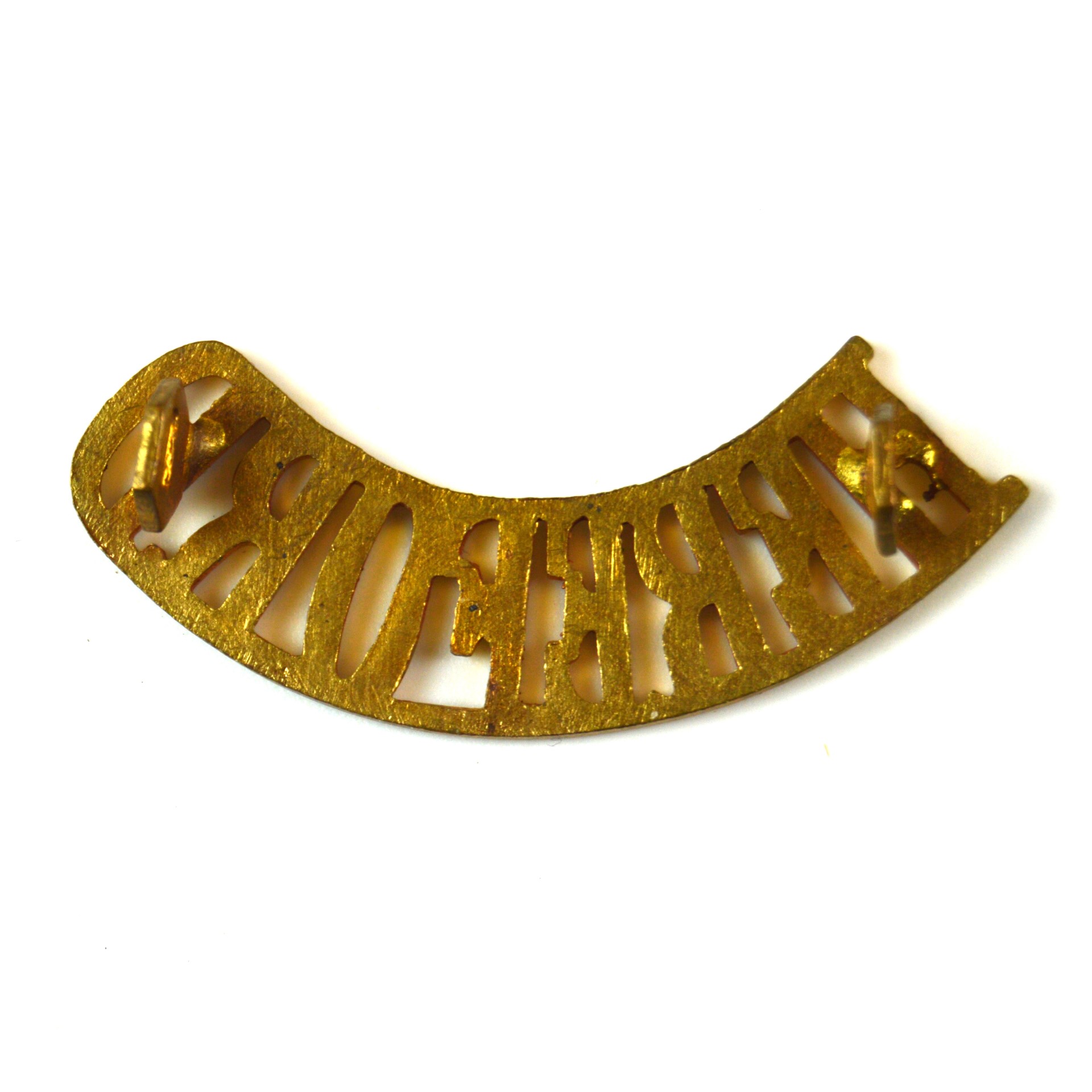 This is a curved brass shoulder title of the Herefordshire Light Infantry, produced to the 1908–1967 pattern bearing the abbreviated title “HEREFORD”. Introduced following the establishment of the Territorial Force in 1908, this shoulder title was worn on service dress and battledress uniforms throughout the First World War, the inter-war years, and into the post-war period until the regiment’s eventual amalgamation. The simple curved form is typical of Territorial infantry titles of the period.