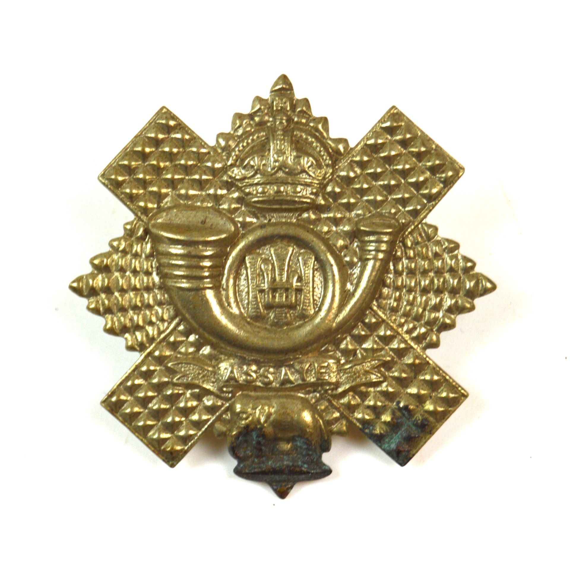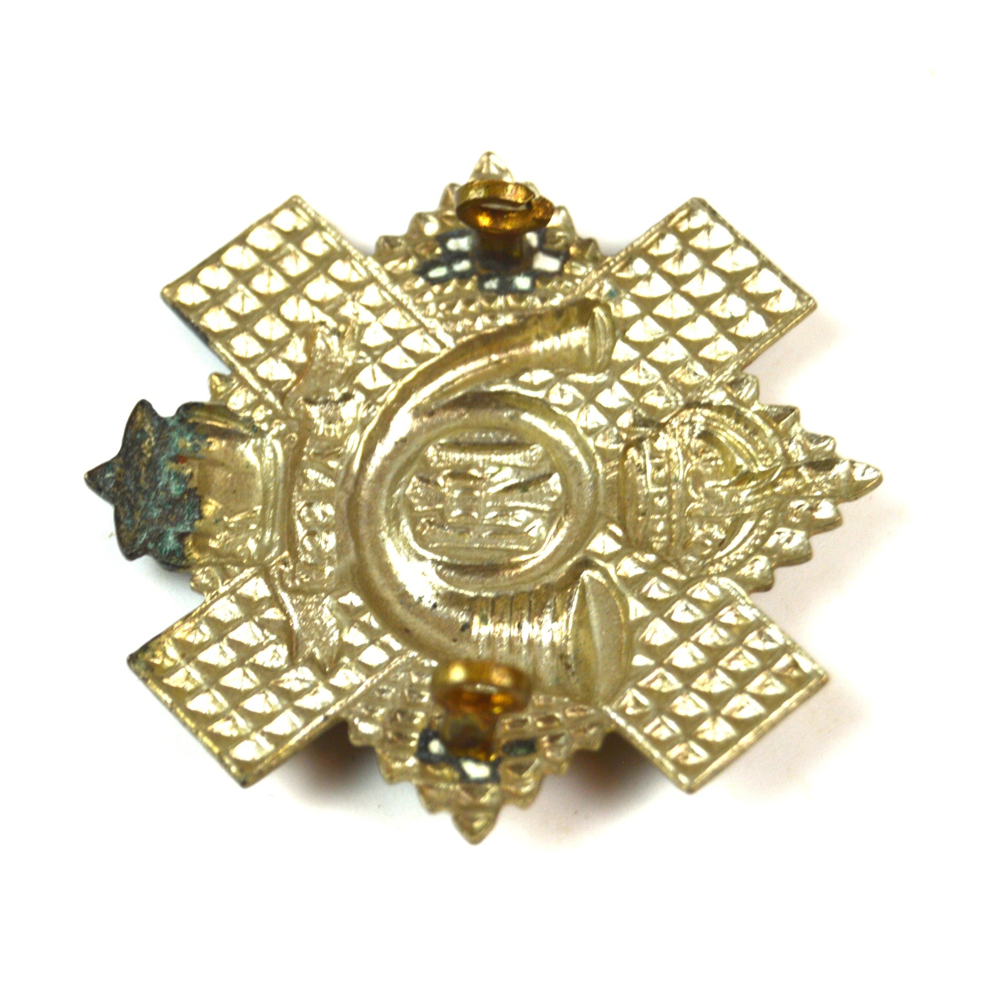 An original Highland Light Infantry glengarry badge of King’s Crown pattern, dating to the WWII era. The badge displays the regiment’s crowned monogram set within the traditional light infantry bugle and star design associated with the HLI, produced to wartime standards with characteristic stamped brass lugs. This pattern would have been worn by HLI personnel on a glengarry head-dress during the years surrounding the Second World War, making it a desirable period example for collectors of Scottish regimental insignia.