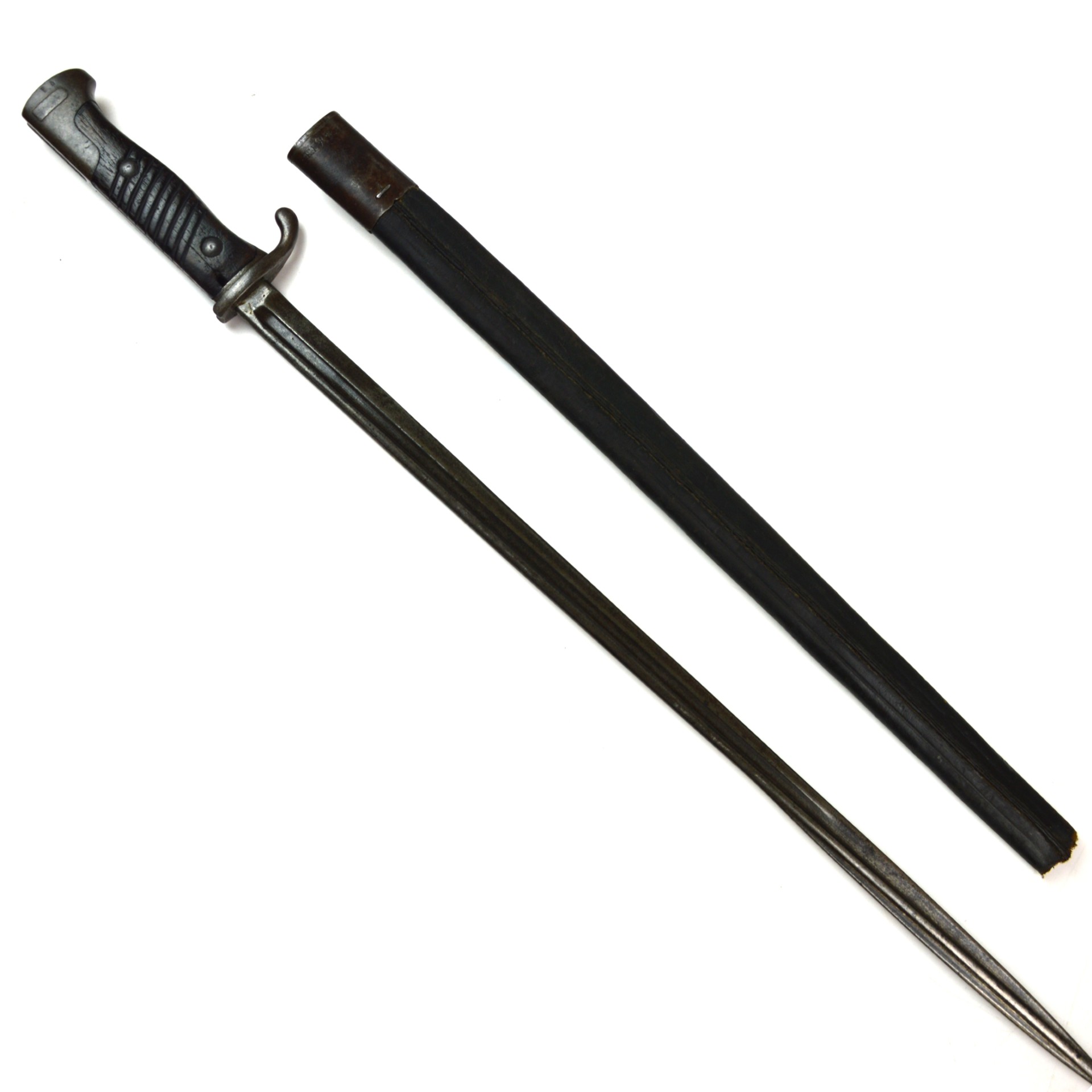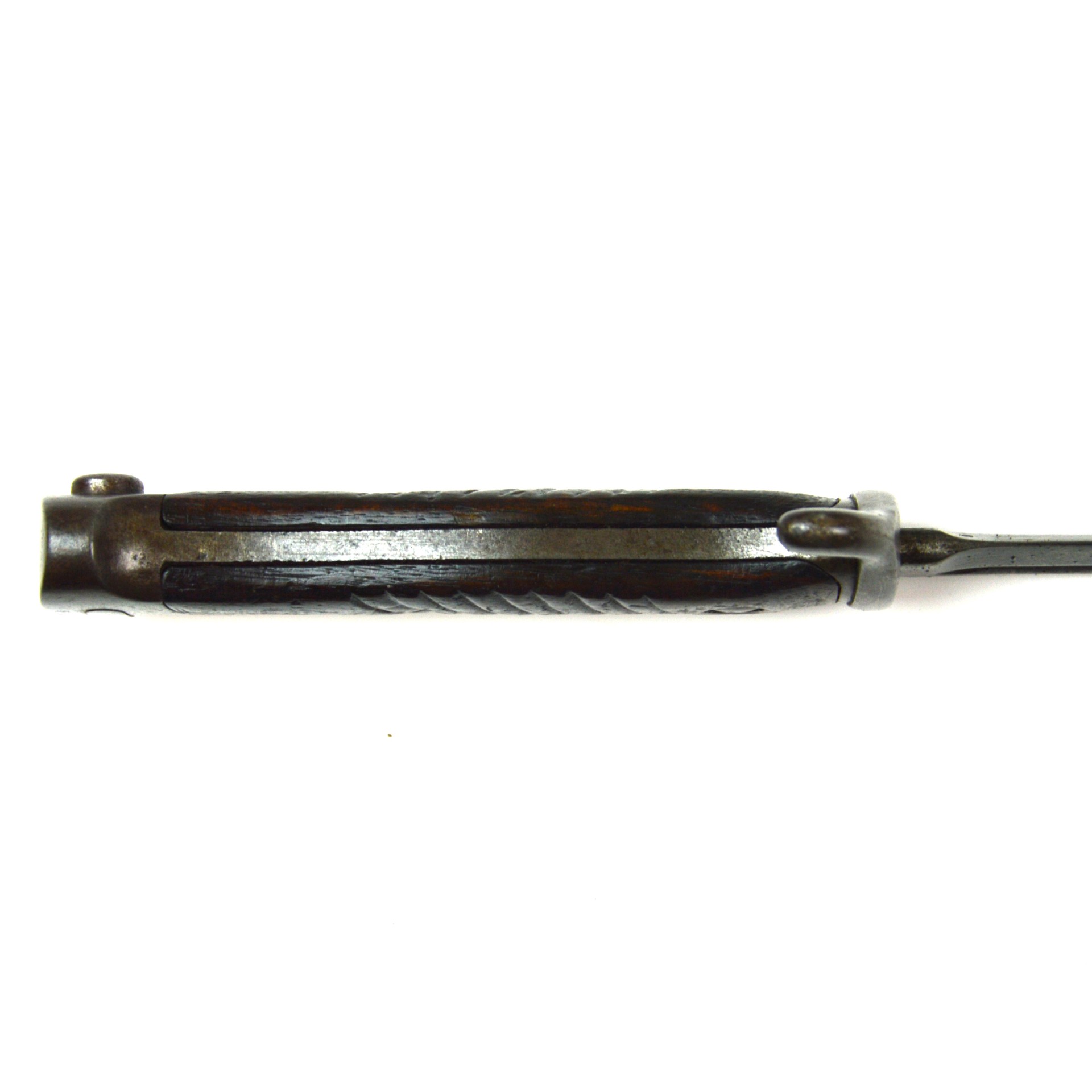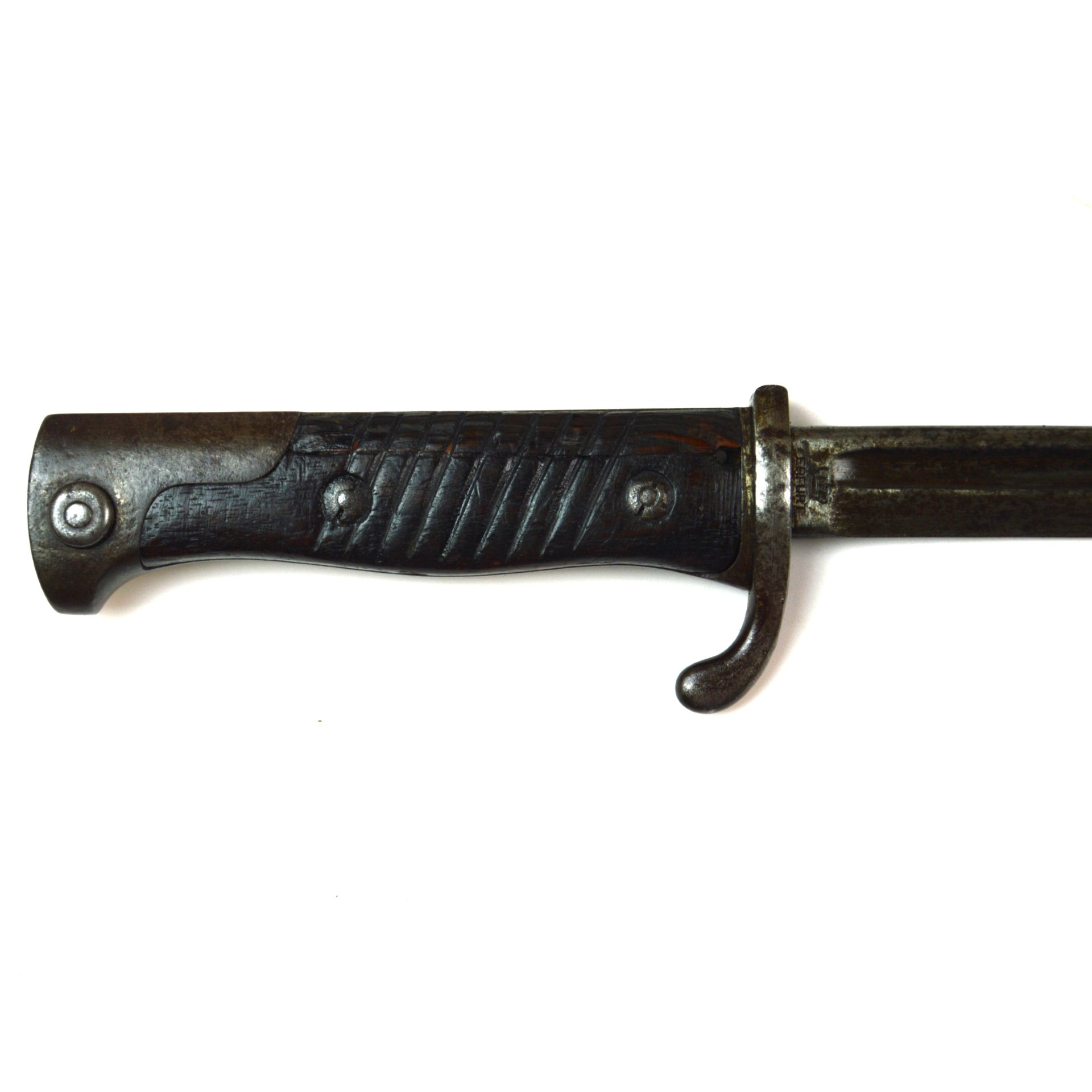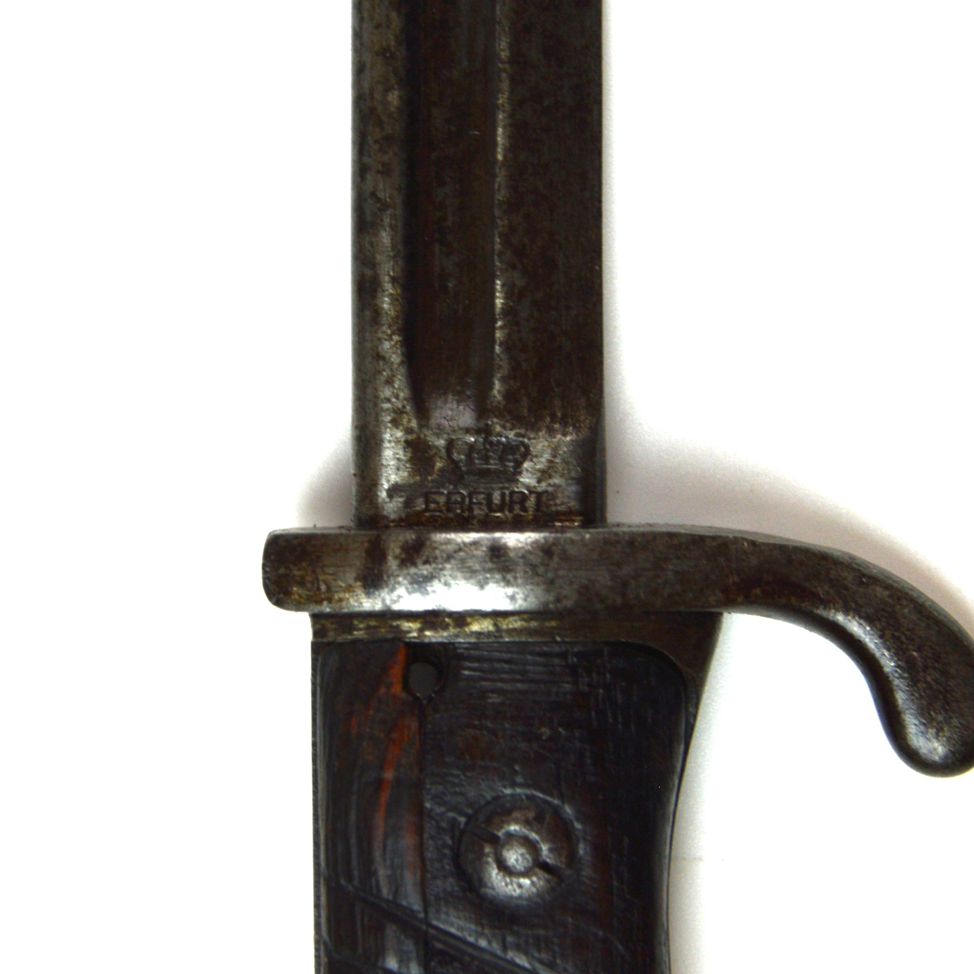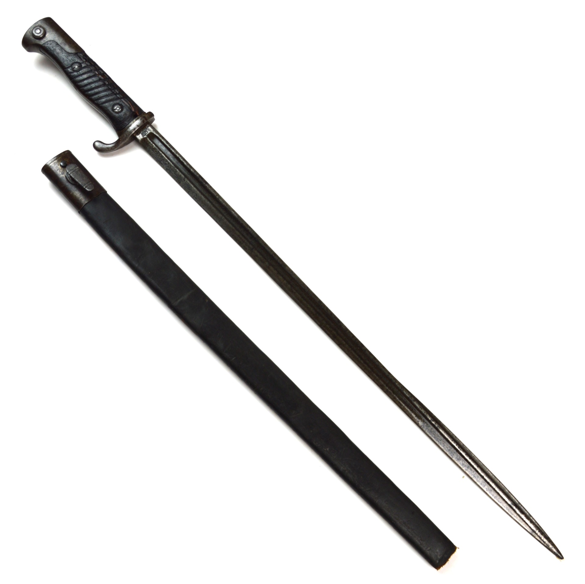 An original Imperial German Seitengewehr 1898 neuer Art (new pattern) long bayonet, manufactured at Erfurt in 1905. Designed for use with the Gewehr 98 rifle, this updated version of the earlier a/A featured a better grip design. The bayonet is fitted with a long, single-edged, fullered blade with spear point, steel crossguard with swept quillon and open muzzle ring, and grooved wooden grips secured by rivets. The steel pommel incorporates the standard push-button release catch.