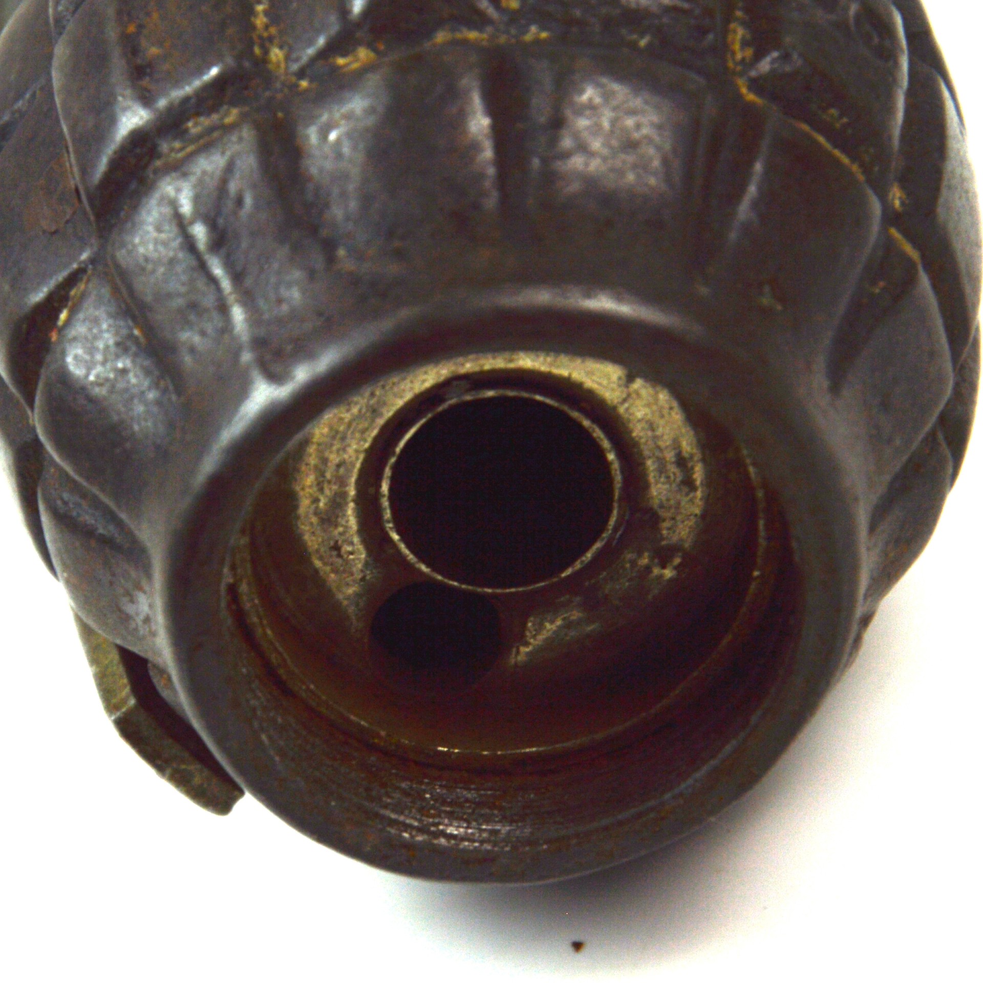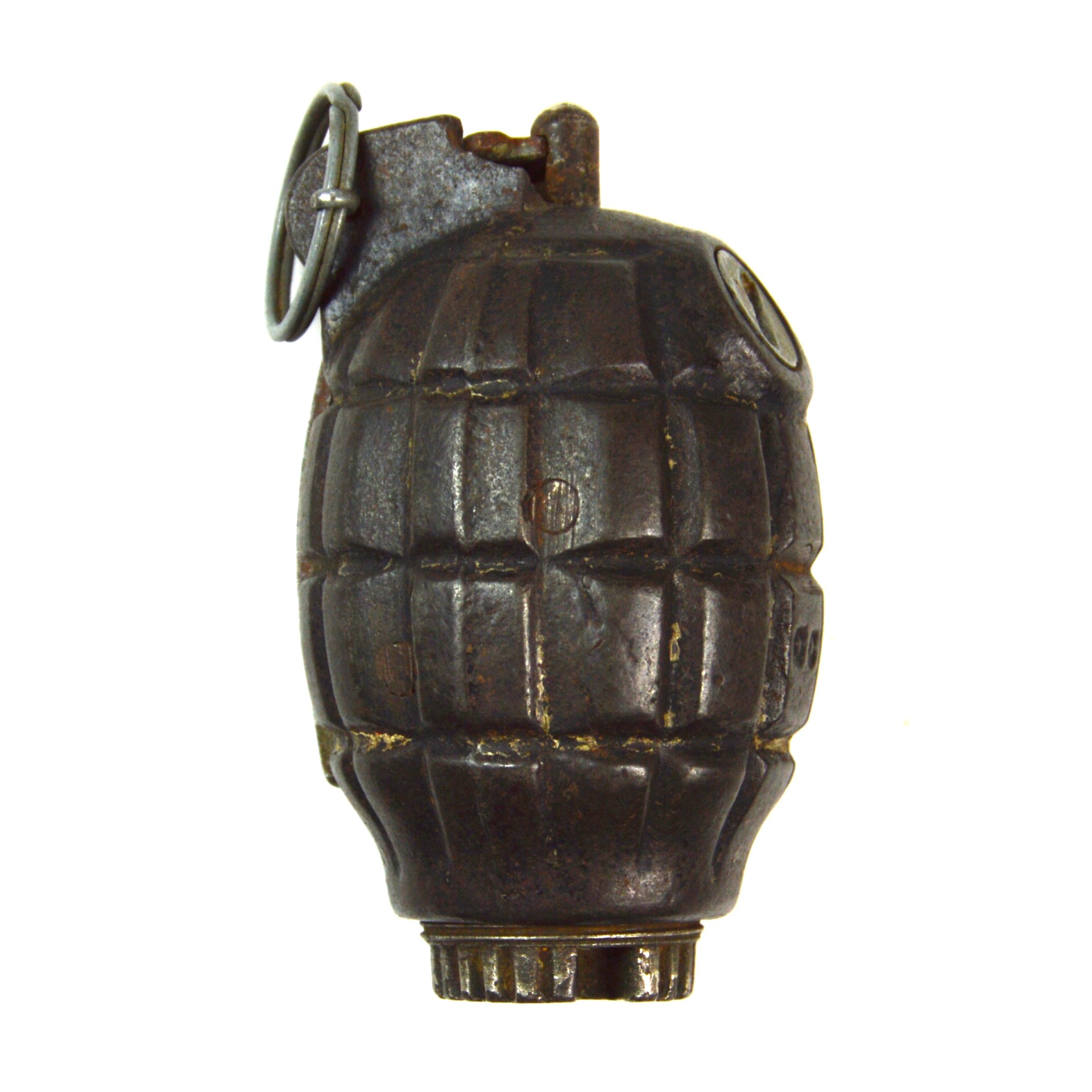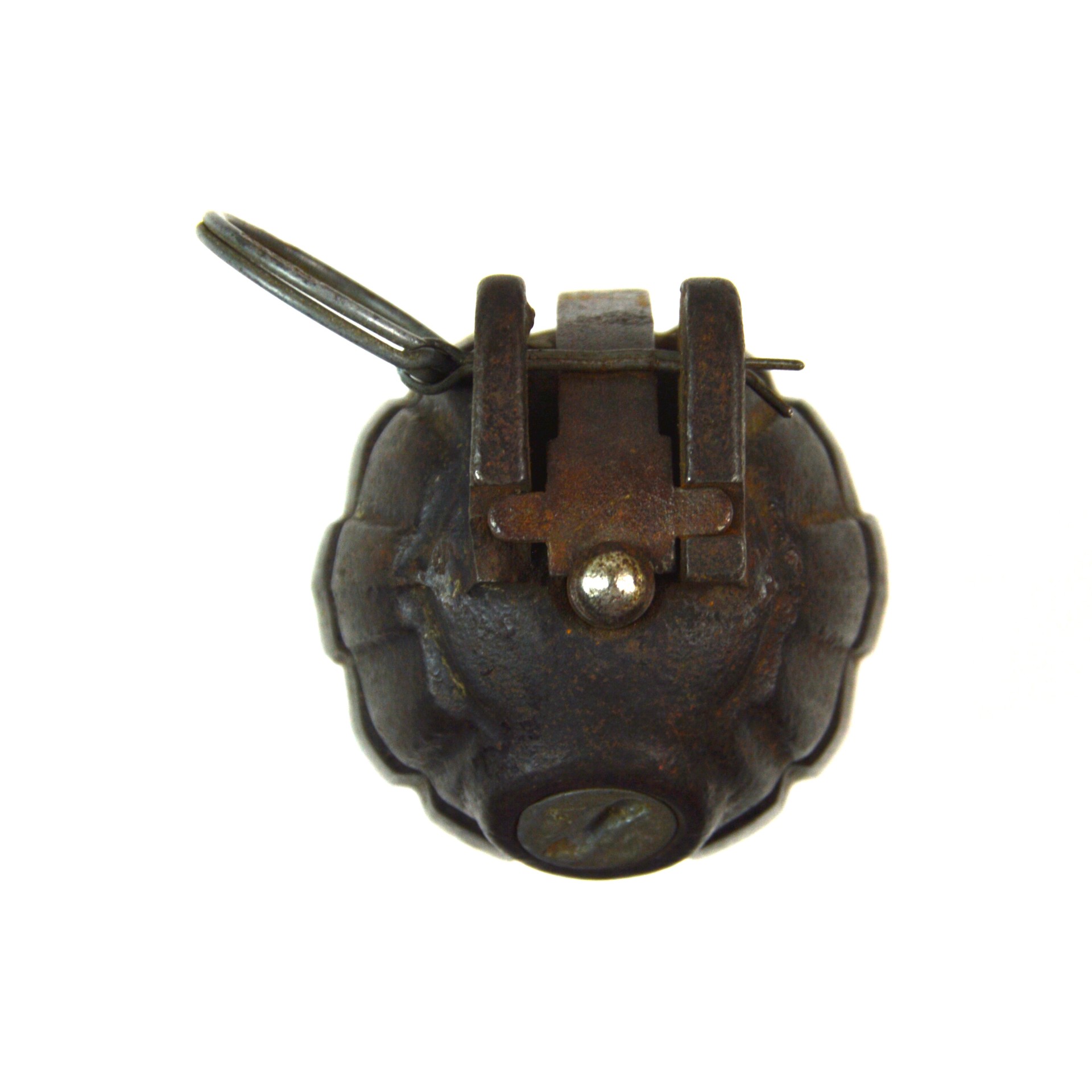 No. 36 Mk. 1 grenade was introduced in the Great War and remained in use in the British military until 1932. The No. 36 grenade featured a traditional cast-iron, grooved pineapple design. It had a central striker held by a closed-hand lever and secured by a pin. Upon detonation, the segmented body produced uniform fragments, a characteristic also found in several other grenade types.
