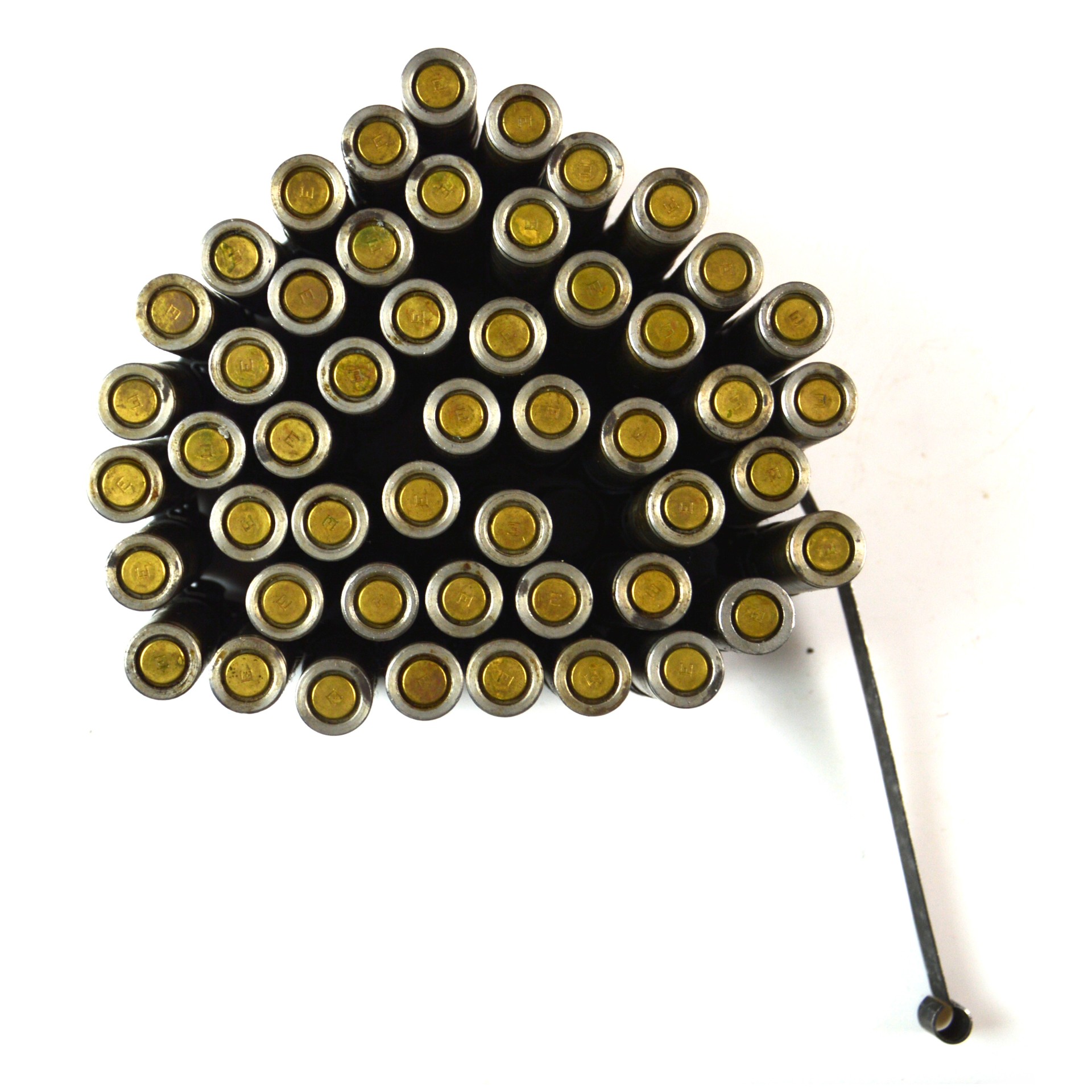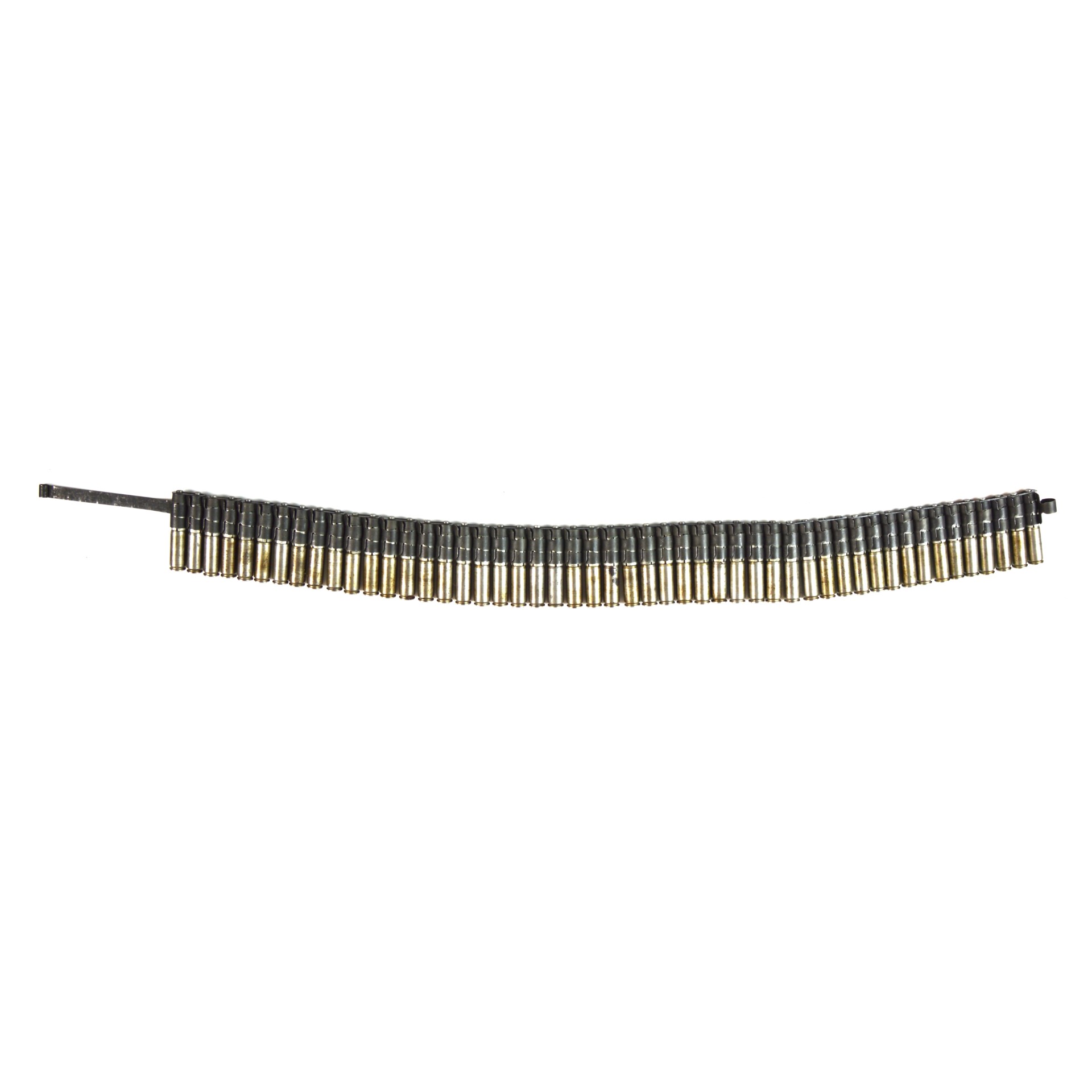 The belt consists of linked, disintegrating metal links and adaptors holding inert or training .22 calibre cartridges, arranged to replicate the feed and operation of standard .30-06 service belts. Such systems were commonly used with sub-calibre training devices fitted to machine guns like the Browning series, enabling realistic drills in loading, feeding, and stoppage handling without the cost and recoil of full-power ammunition.
