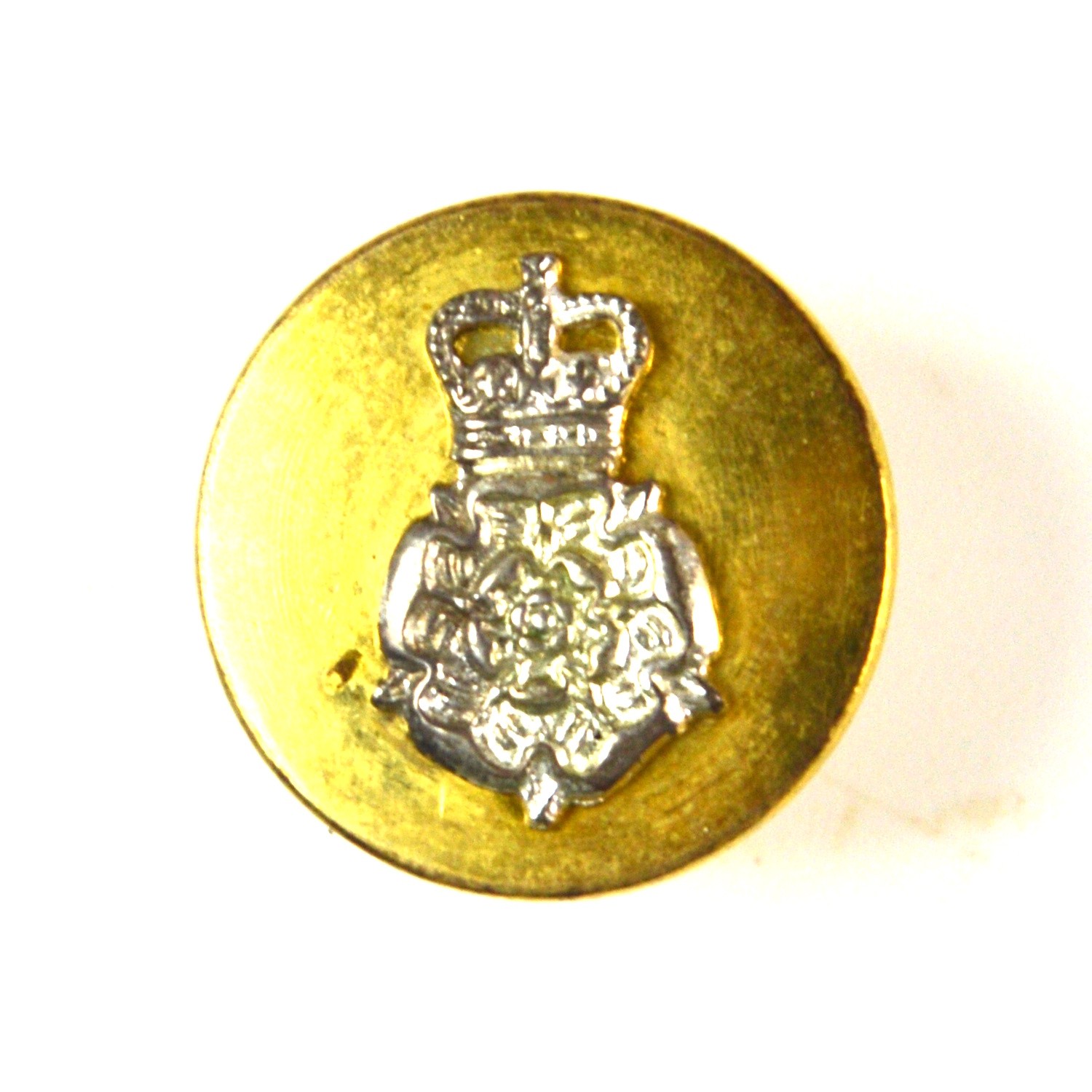 Intelligence Corps blazer button of the pattern worn by members of the Intelligence Corps of the British Army. This small-format button displays the recognised insignia of the corps in miniature relief, incorporating the English rose as the central device, a long-standing emblem associated with military intelligence. The device is surmounted by the Queen’s Crown, reflecting the post-1953 period, and is arranged in a compact circular form suitable for blazer or mess dress wear.