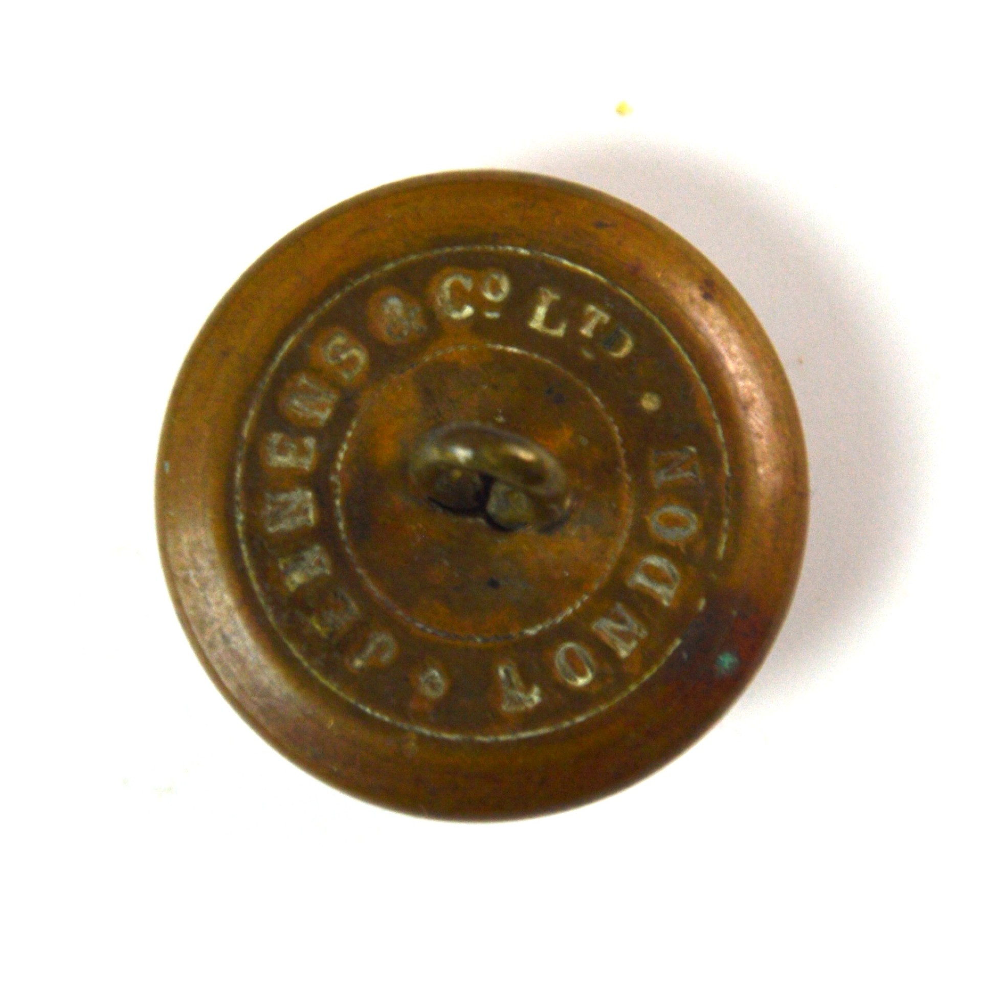 25mm brass button from King Edward’s Horse (The King’s Overseas Dominions Regiment), worn during the period 1901–1924. This volunteer cavalry regiment, composed largely of men from Britain’s overseas Dominions, served with distinction during the First World War, particularly on the Western Front, where it operated as both mounted troops and dismounted infantry as required.