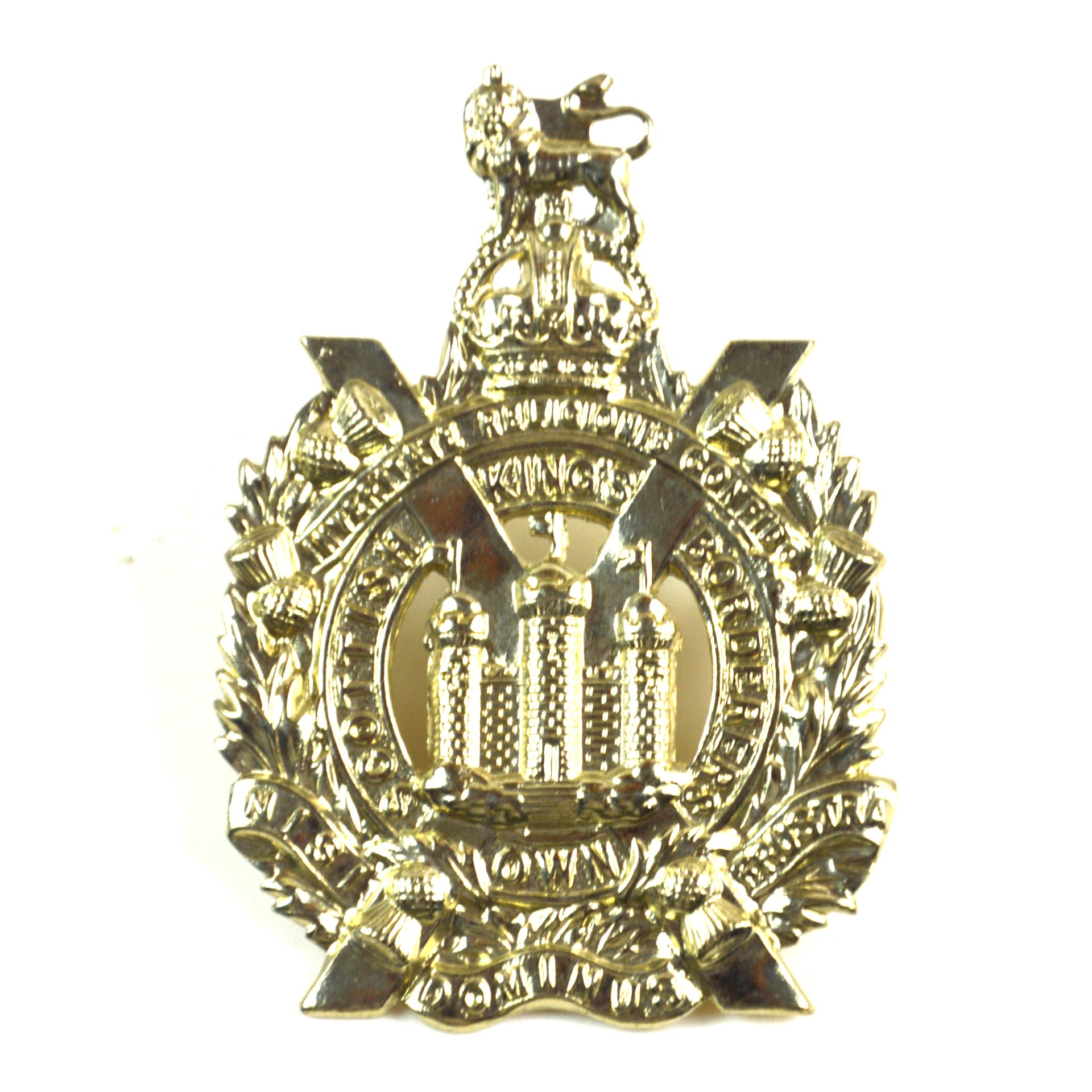 Manufactured in white metal consistent with Highland and Lowland Scottish headdress insignia, this restrike example provides a sharply defined representation of the original King’s Crown era pattern. King’s Own Scottish Borderers Glengarry badges are collected as examples of Scottish regimental militaria, British Army infantry insignia, and historic uniform hardware.