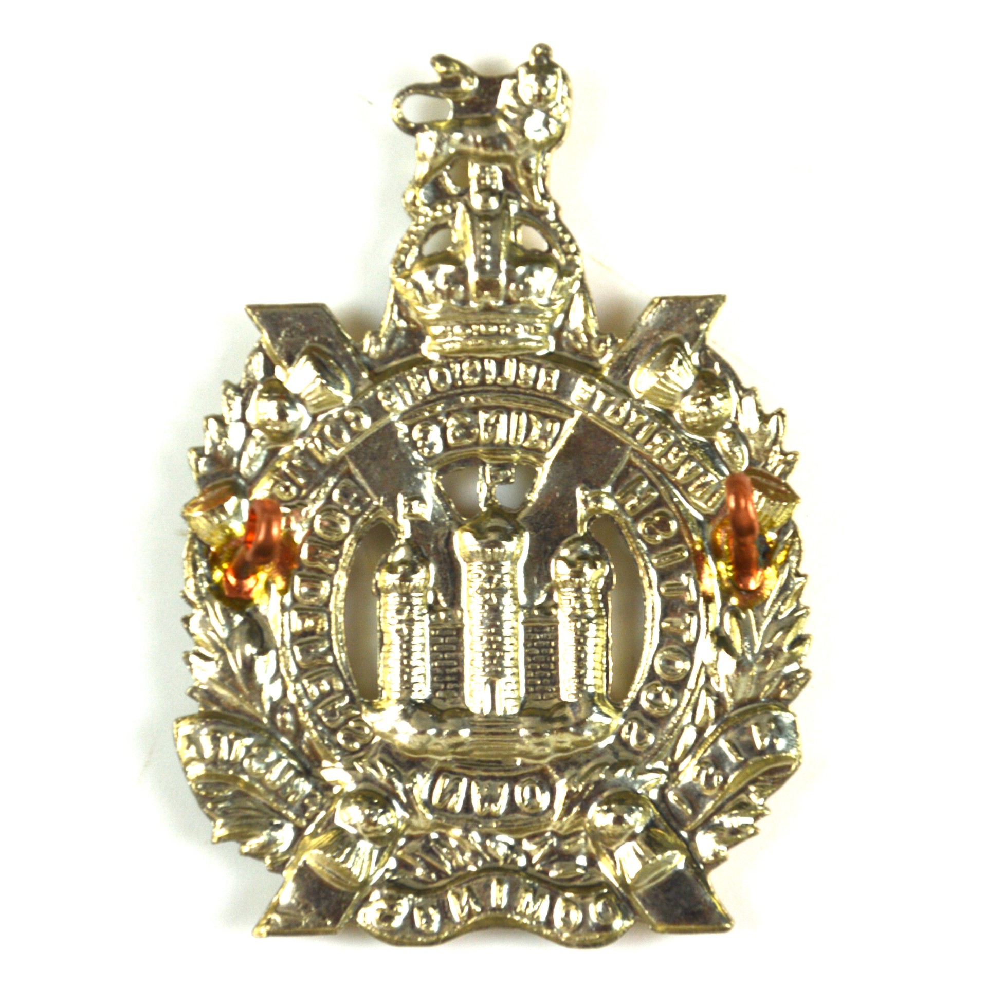 King’s Own Scottish Borderers (KOSB) Glengarry cap badge produced as a restrike of the pattern worn between 1902 and 1953 by the King’s Own Scottish Borderers of the British Army. This British Army Scottish infantry headdress badge displays the recognised insignia of the regiment in clear relief, incorporating the distinctive Saltire and castle in a wreath, surrounded by a circlet bearing the regimental motto and flanked below and above with the motto “In Veritate Religionis Confido” (I put my trust in the truth of religion) and “Nisi Dominus Frustra” (Without the Lord, everything is in vain)”. The composition is surmounted by the King’s Crown, reflecting the pattern worn during the reigns of King Edward VII, King George V, and King George VI.