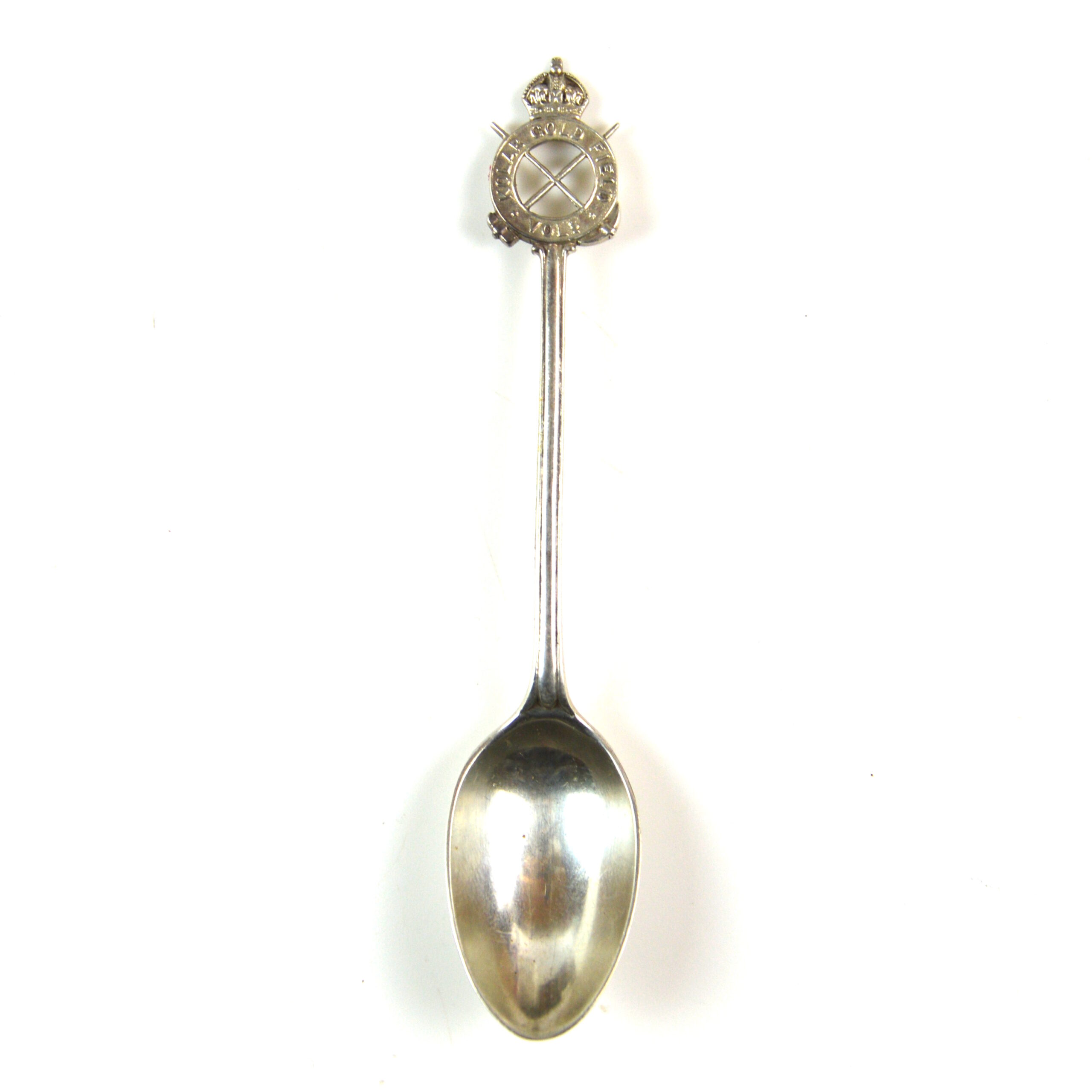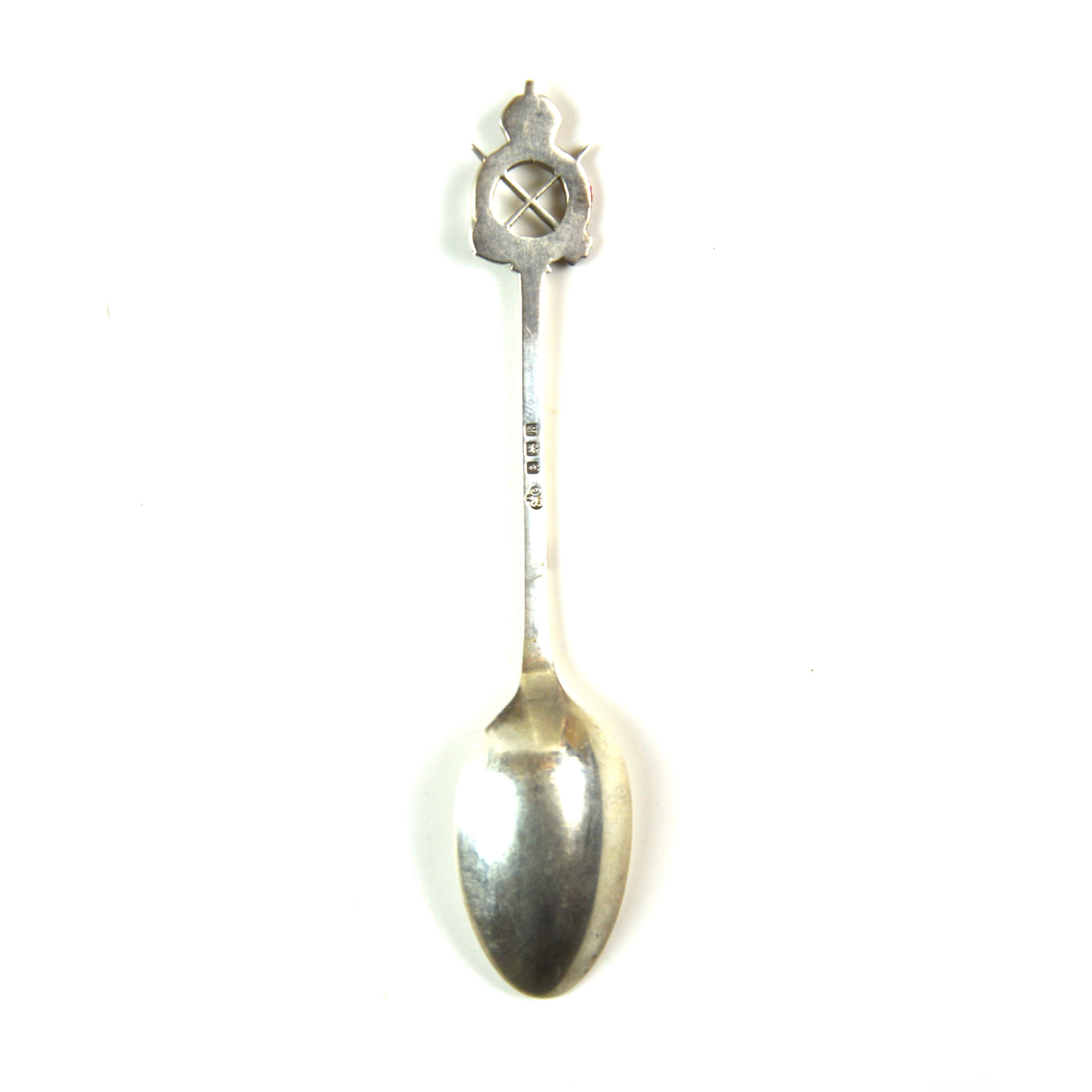 Manufactured in sterling silver, this example provides a well-defined representation of early twentieth-century commemorative silverware. Such teaspoons are collected as examples of British colonial memorabilia, military volunteer history, and antique silver by noted makers.