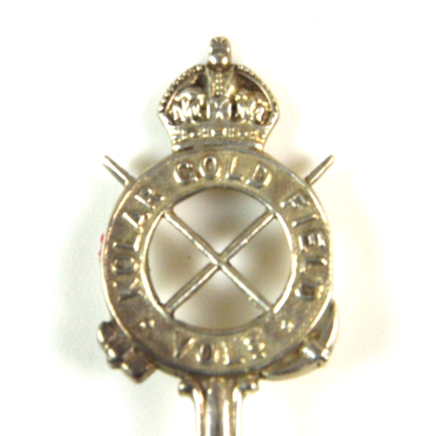 The Kolar Gold Fields, located in Kolar Gold Fields, were a major centre of gold mining under British colonial administration. Volunteer units such as the Kolar Gold Field Volunteers were raised for local defence and support roles, reflecting the wider structure of colonial auxiliary forces. Commemorative and presentation items such as this teaspoonwere often produced to mark service, membership, or association with such units.