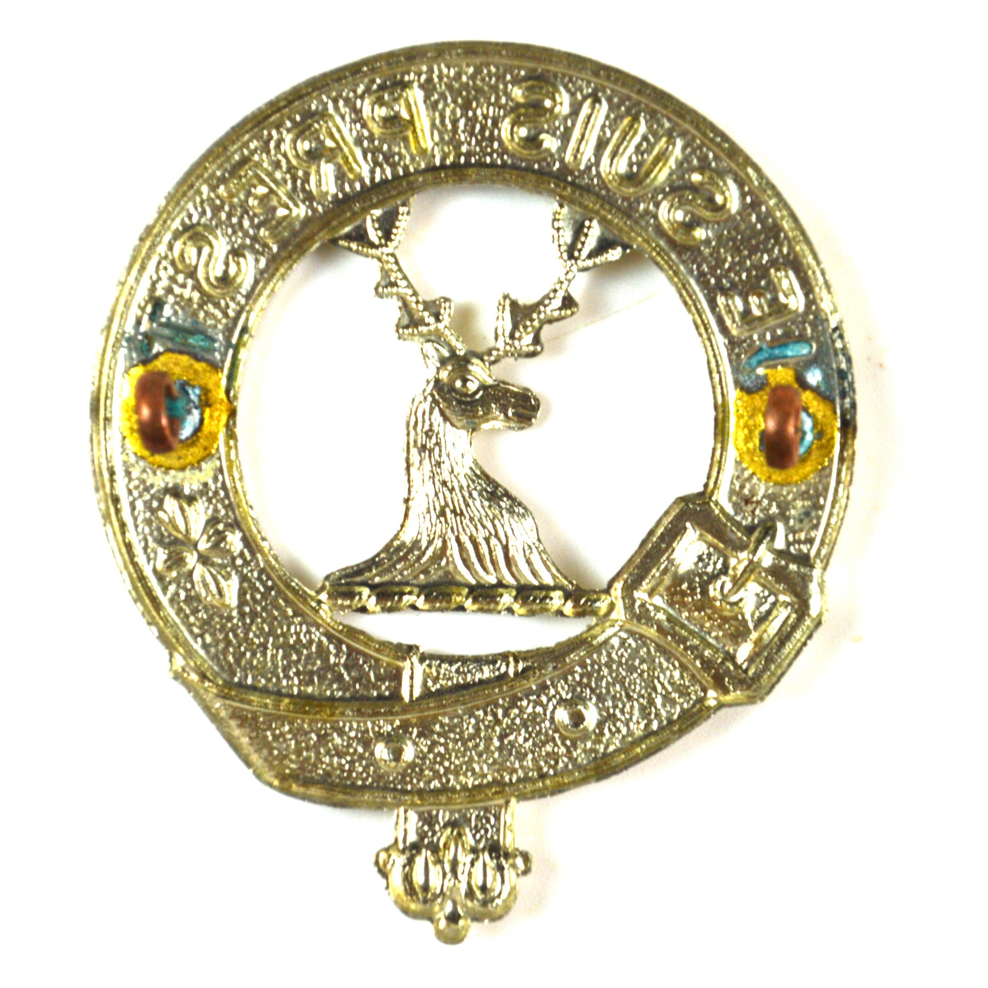 Lovat Scouts glengarry-balmoral cap badge, an original example of the pattern worn from 1922 by the Lovat Scouts of the British Army. This Scottish Highland yeomanry cap badge displays the recognised regimental insignia in clear relief, incorporating a stag’s head caboshed as the central device, facing left, mounted on a torse, and encircled by a garter strap bearing the motto “Je Suis Prest” (French: “I Am Ready”). The composition reflects the heraldic traditions of the Frasers of Lovat, from whose clan arms the badge device is directly derived, and the fieldcraft heritage of the regiment.