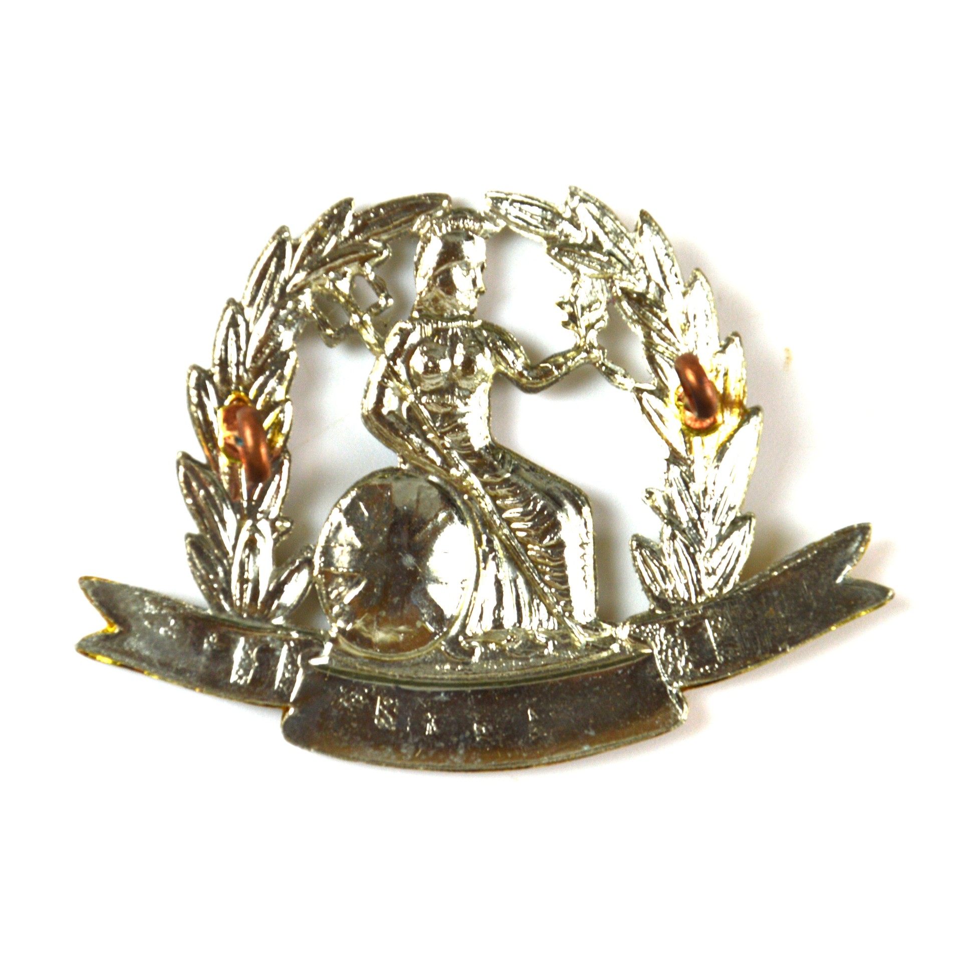Norfolk Regiment cap badge, a restrike following the 1898–1935 pattern worn by the regiment during the late Victorian and early interwar periods. Constructed in gilding metal and white metal, this piece features the figure of Britannia seated facing left, holding a trident and palm branch, encircled by a laurel wreath, all above a scroll inscribed “THE NORFOLK REGT.”