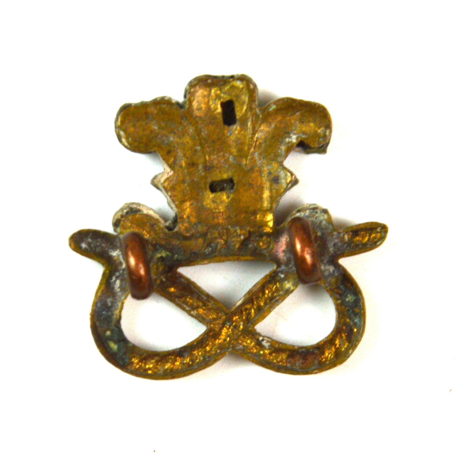 North Staffordshire Regiment (The Prince of Wales’s) original collar badge, 1901–1959 pattern. The design incorporates the Prince of Wales’s plumes above a scroll inscribed Ich Dien, set over the Stafford Knot. This pattern was introduced following the change from the previous design, remaining in use until the regiment’s amalgamation in 1959 into the Staffordshire Regiment. Struck in bimetal for the service dress of other ranks, these badges were worn in pairs on the tunic collars. Reverse fitted with lugs for attachment.