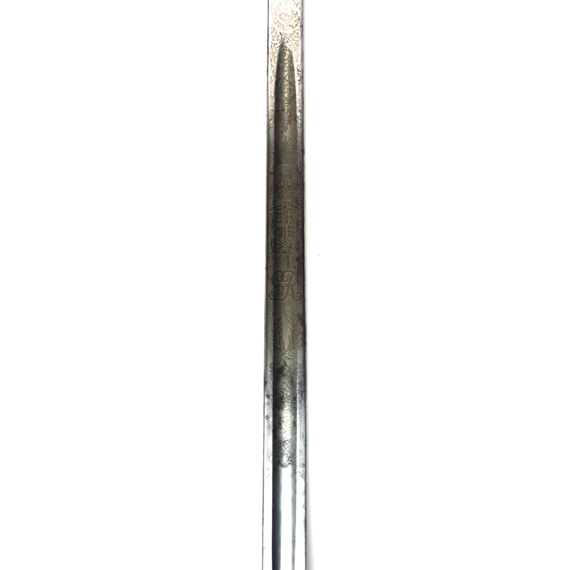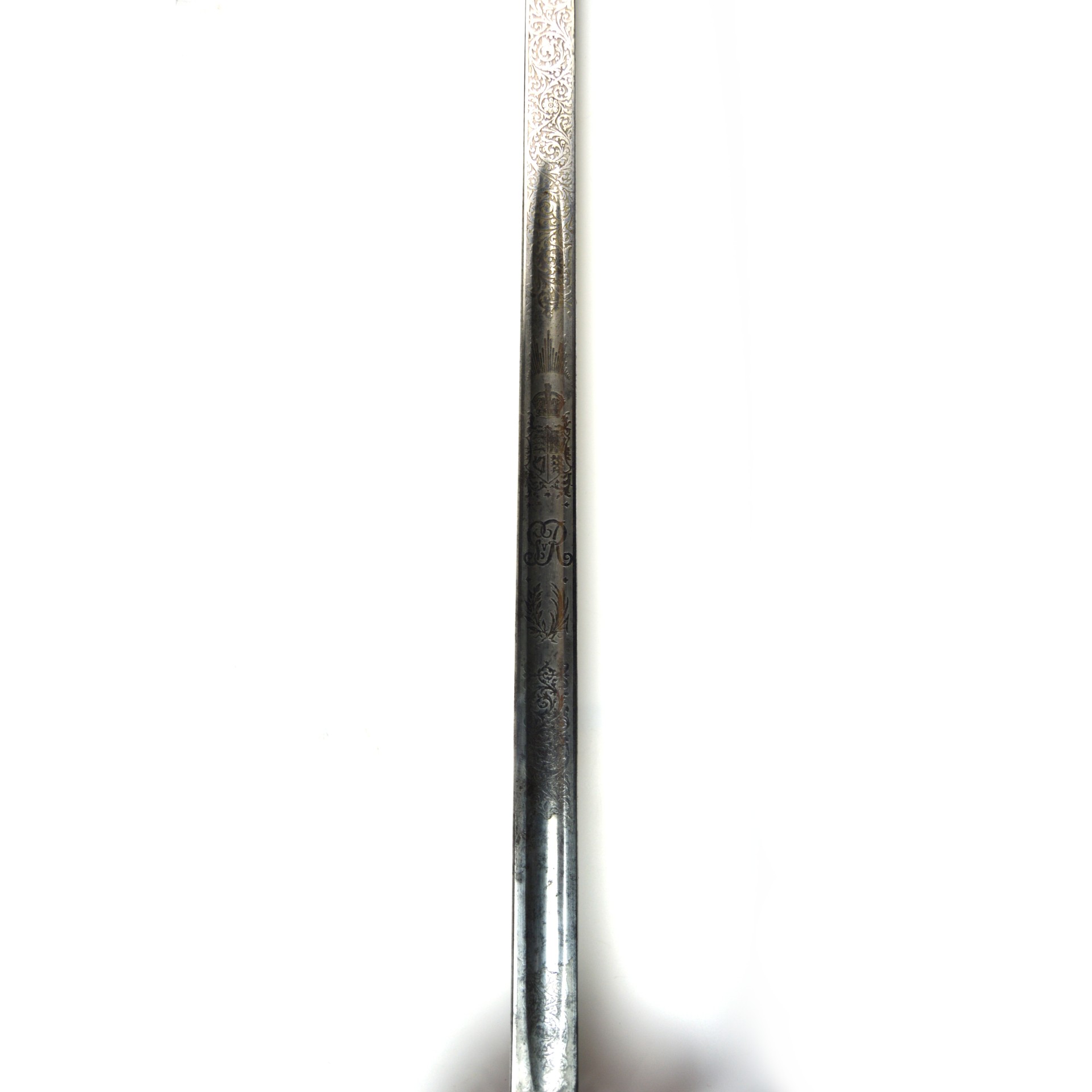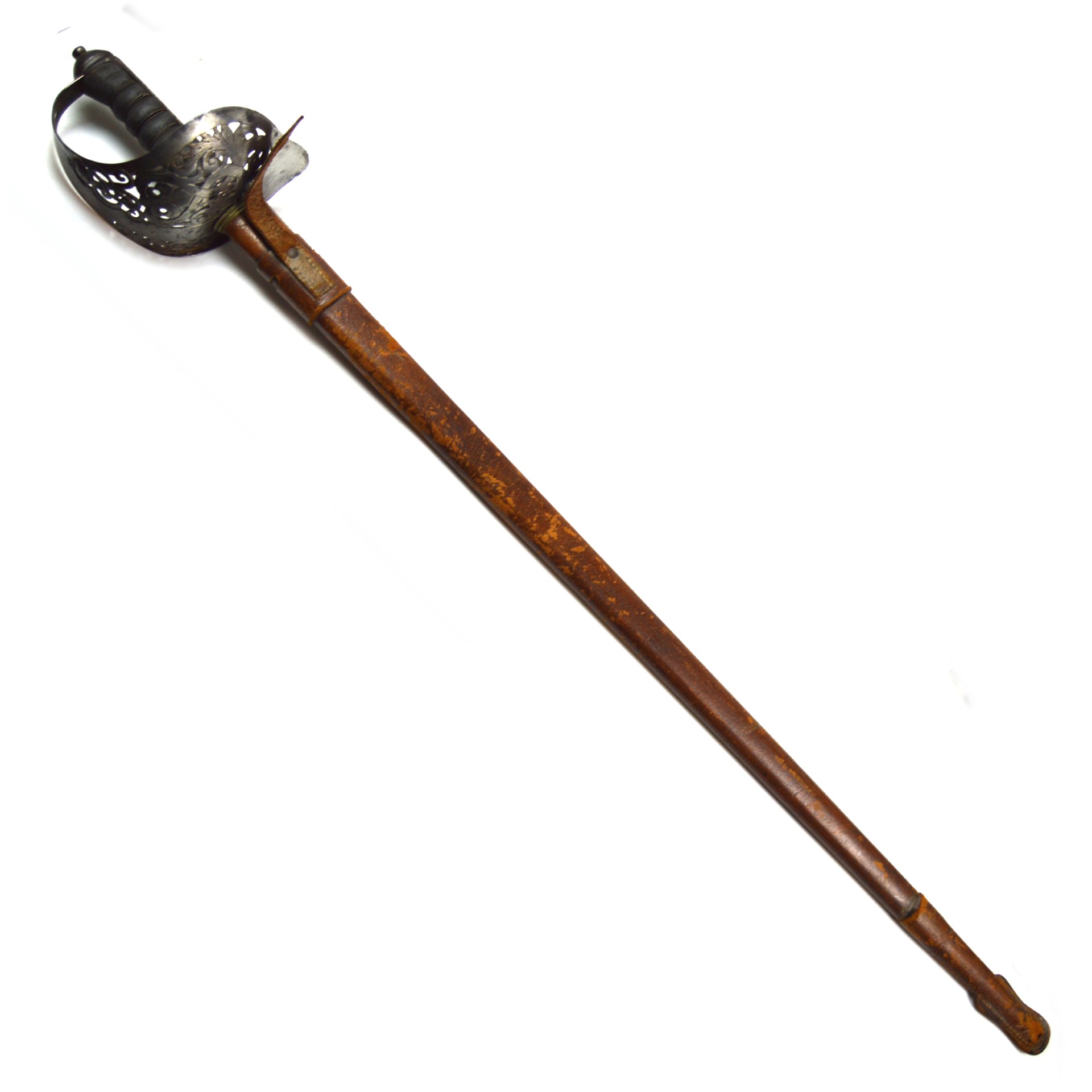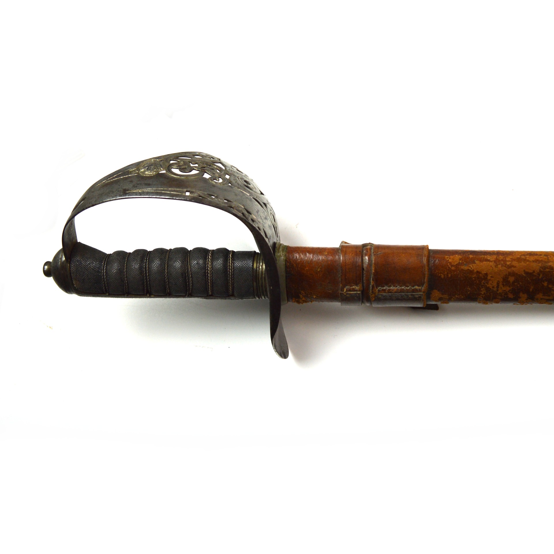 An original and fine example of the British Pattern 1897 Infantry Officer’s Sword, bearing the Royal Cypher of King George V (GRV), indicating manufacture and service between 1910 and 1936. This regulation sword was standard issue for infantry officers in the British Army from 1897 to the present day. The blade is full-length and etched with the GRV cypher, surrounded by intricate floral scrollwork and British military motifs, showing clear detail and age-related patina. The guard is the classic pierced steel bowl hilt, also bearing the GRV monogram, with a shagreen grip bound in twisted wire, all intact and in good condition. A Sam Browne brown leather scabbard is present and fits well, as issued for field use.