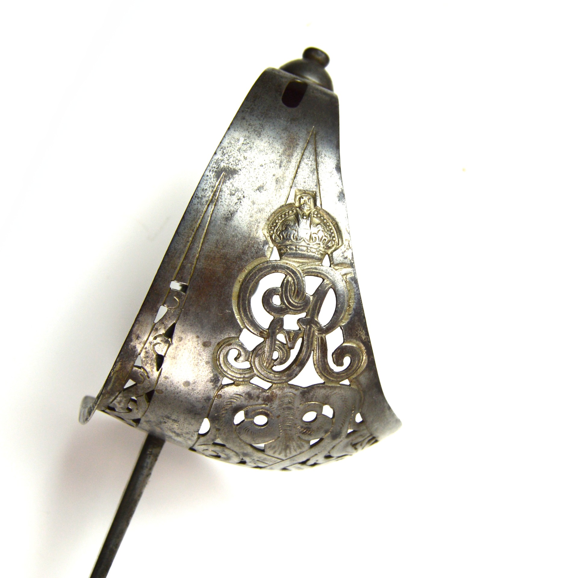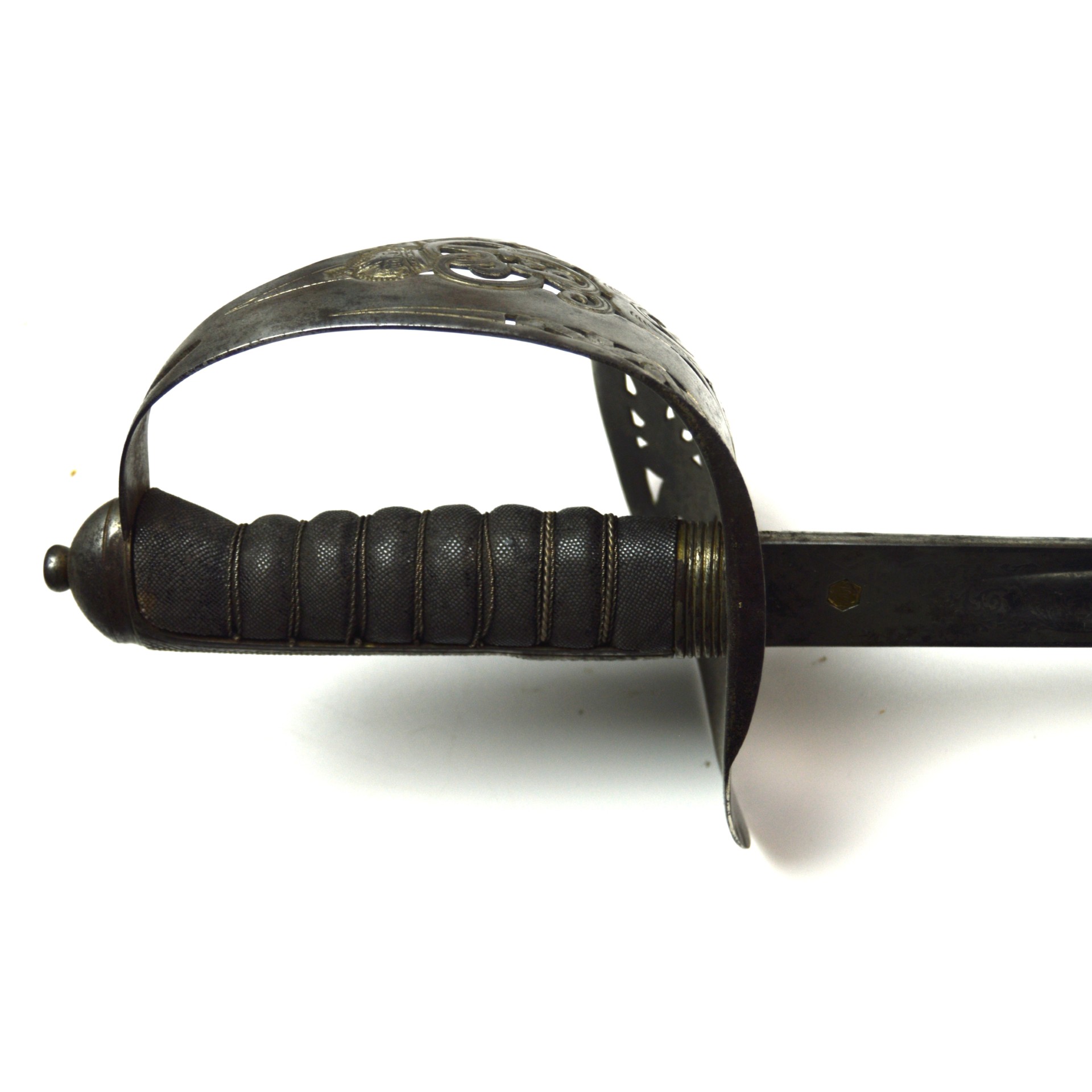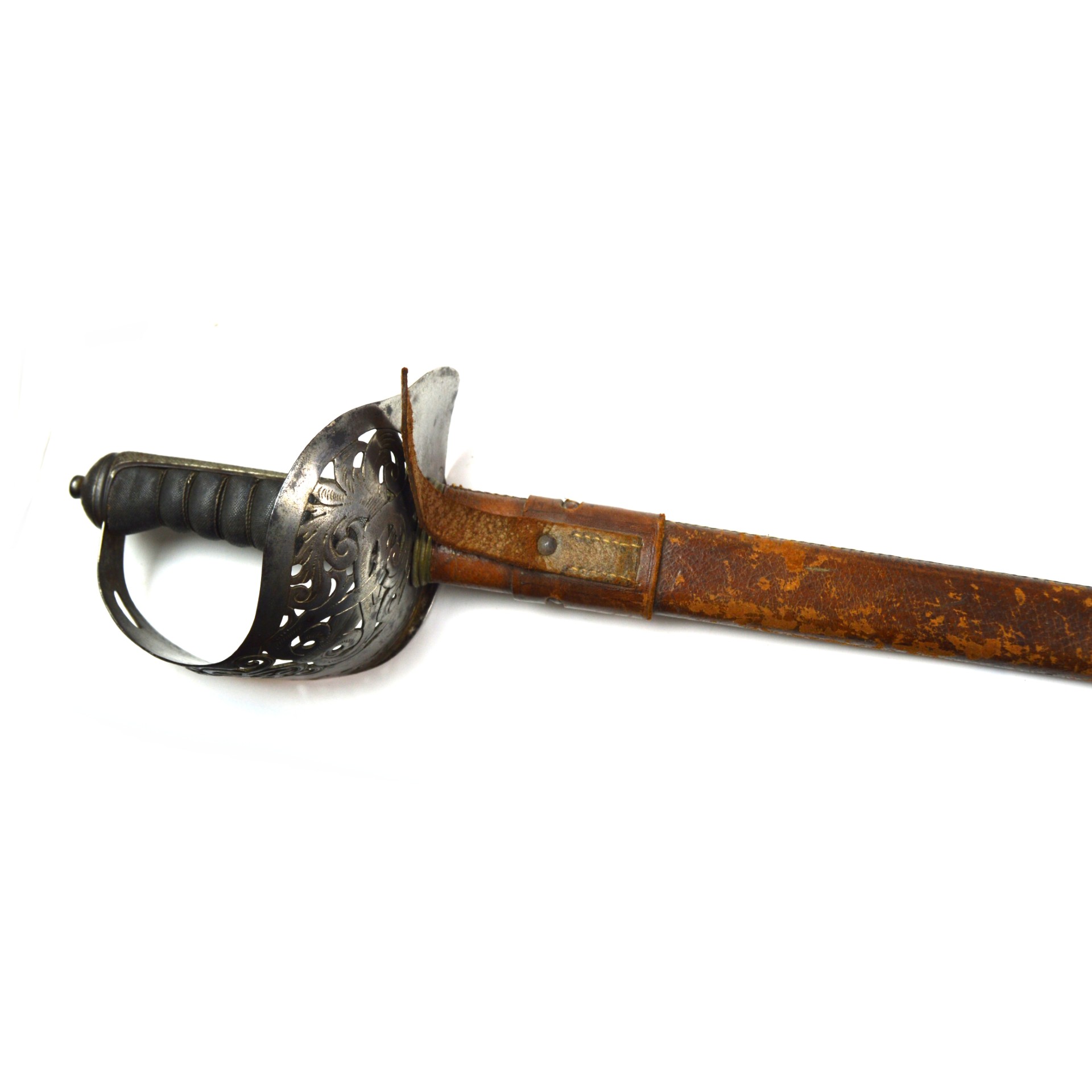 An original and fine example of the British Pattern 1897 Infantry Officer’s Sword, bearing the Royal Cypher of King George V (GRV), indicating manufacture and service between 1910 and 1936. This regulation sword was standard issue for infantry officers in the British Army from 1897 to the present day. The blade is full-length and etched with the GRV cypher, surrounded by intricate floral scrollwork and British military motifs, showing clear detail and age-related patina. The guard is the classic pierced steel bowl hilt, also bearing the GRV monogram, with a shagreen grip bound in twisted wire, all intact and in good condition. A Sam Browne brown leather scabbard is present and fits well, as issued for field use.