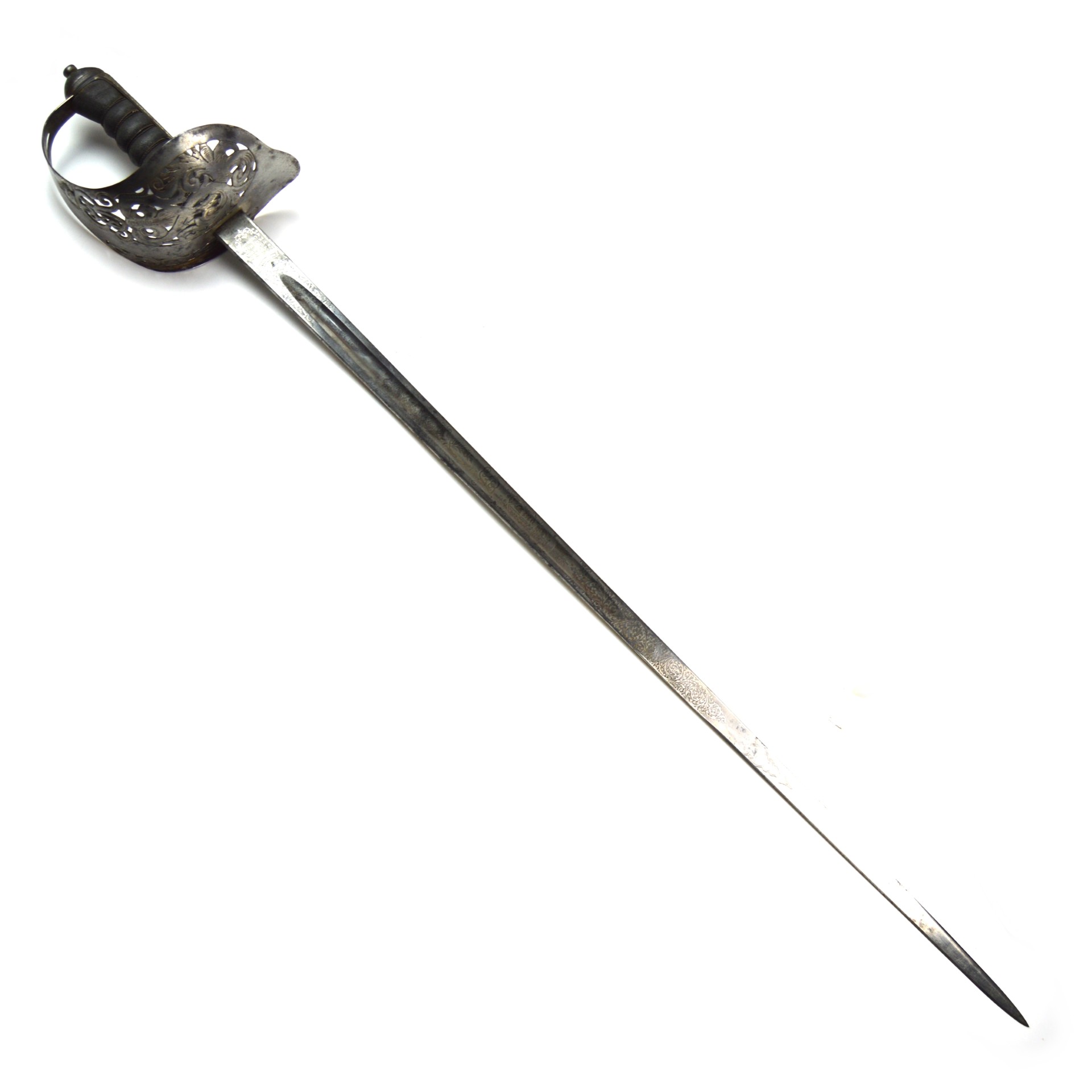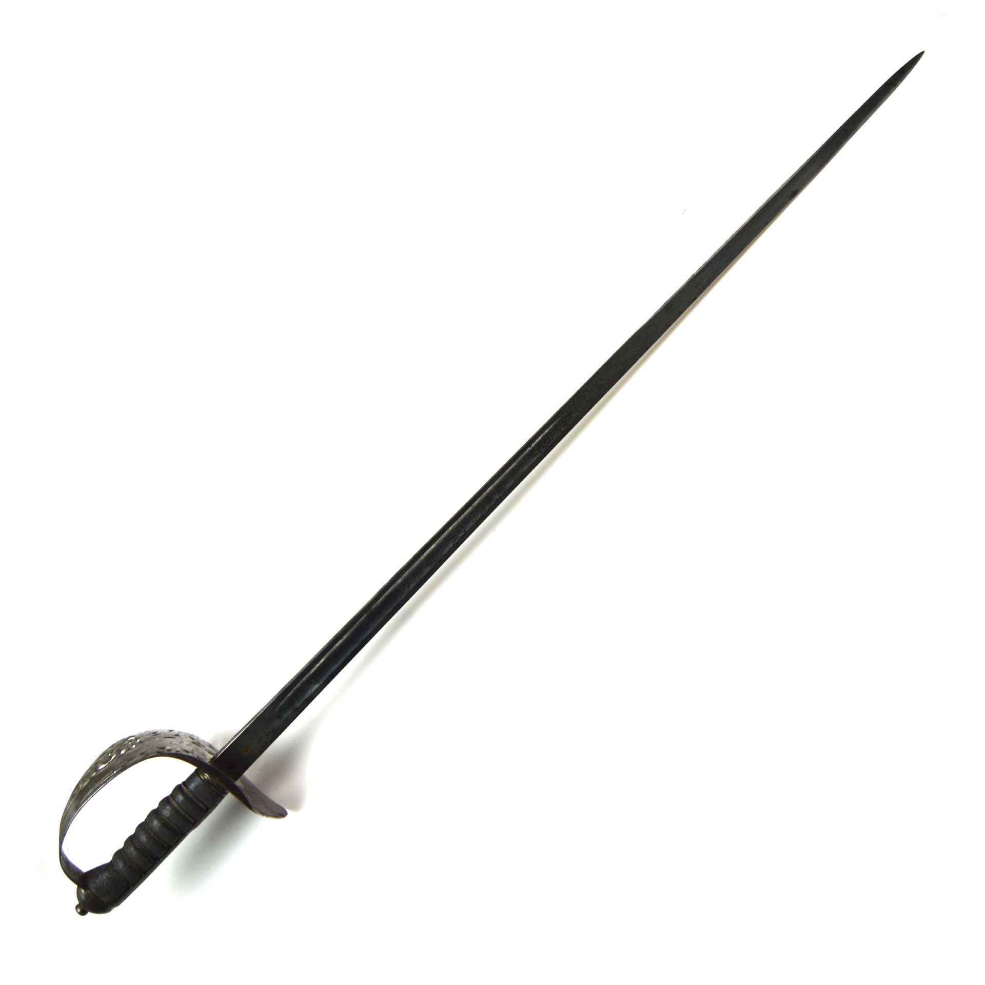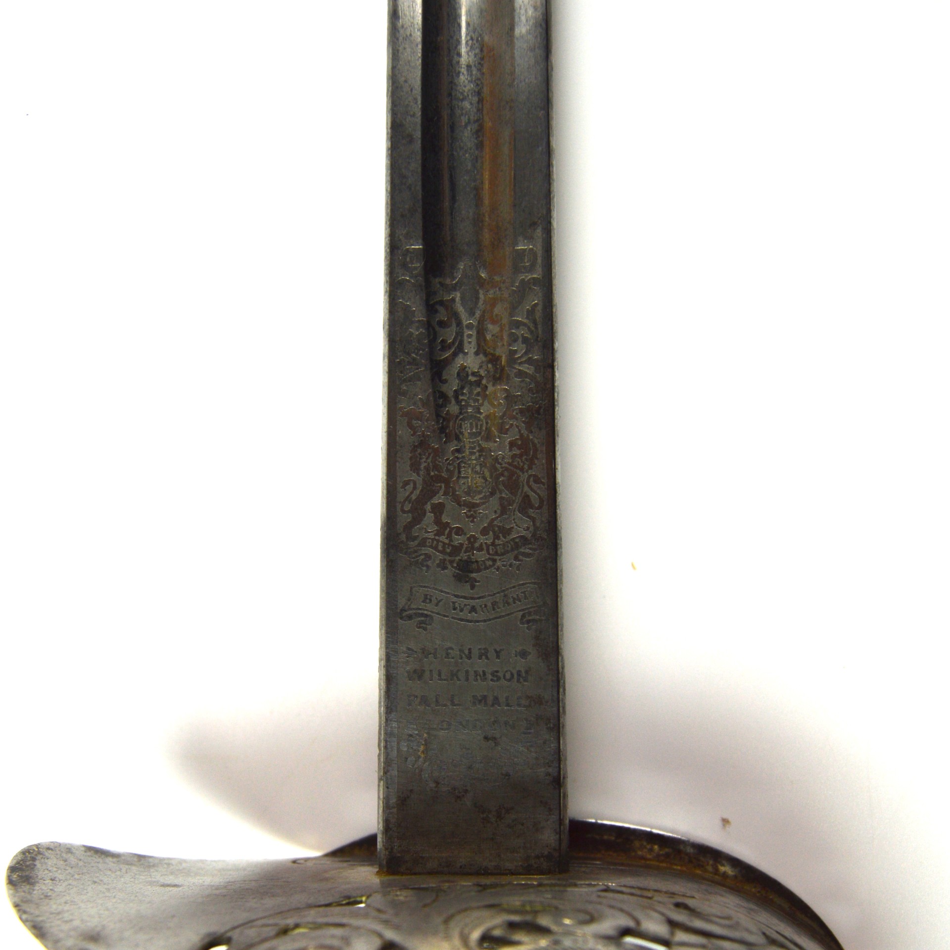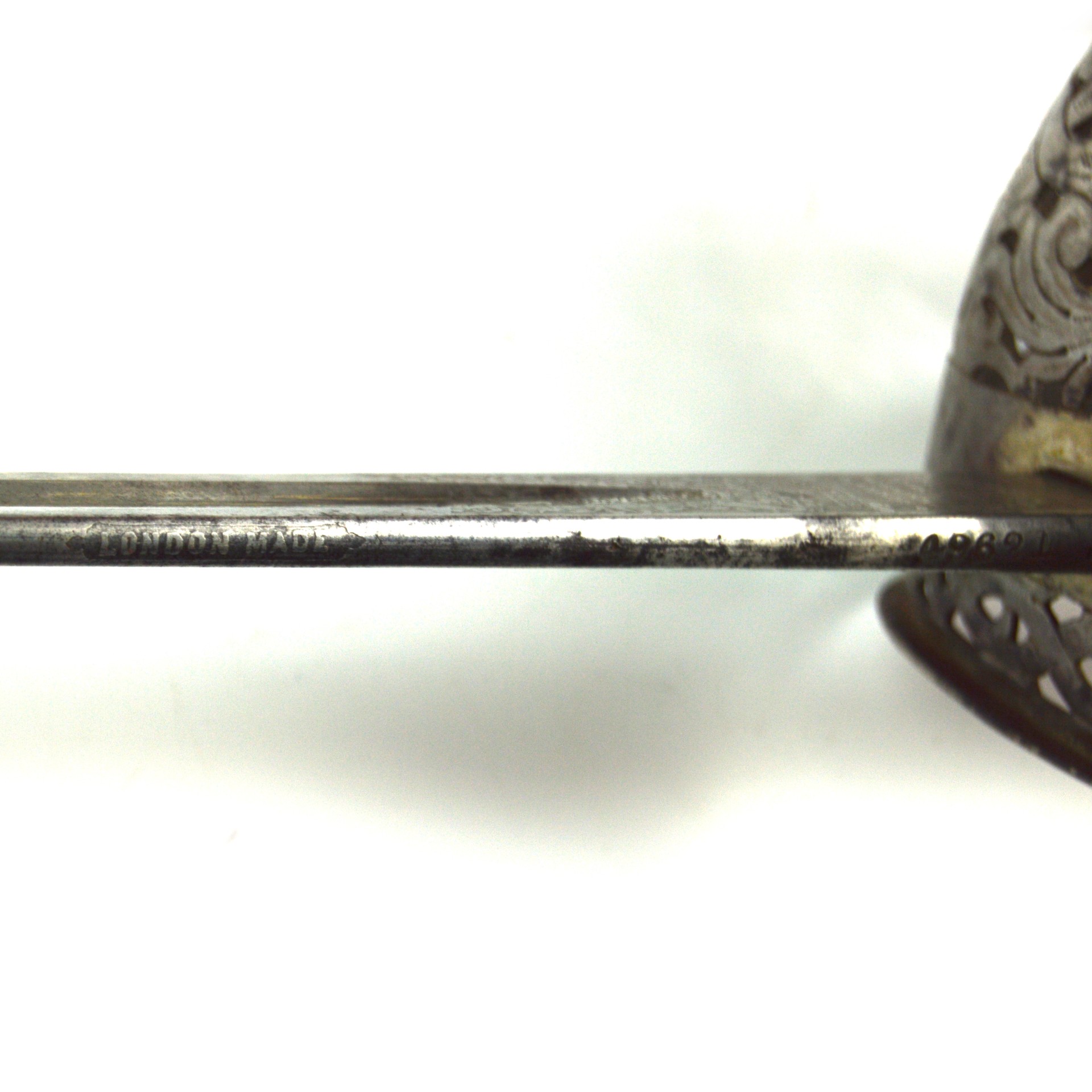 An original and fine example of the British Pattern 1897 Infantry Officer’s Sword, bearing the Royal Cypher of King George V (GRV), indicating manufacture and service between 1910 and 1936. This regulation sword was standard issue for infantry officers in the British Army from 1897 to the present day. The blade is full-length and etched with the GRV cypher, surrounded by intricate floral scrollwork and British military motifs, showing clear detail and age-related patina. The guard is the classic pierced steel bowl hilt, also bearing the GRV monogram, with a shagreen grip bound in twisted wire, all intact and in good condition. A Sam Browne brown leather scabbard is present and fits well, as issued for field use.