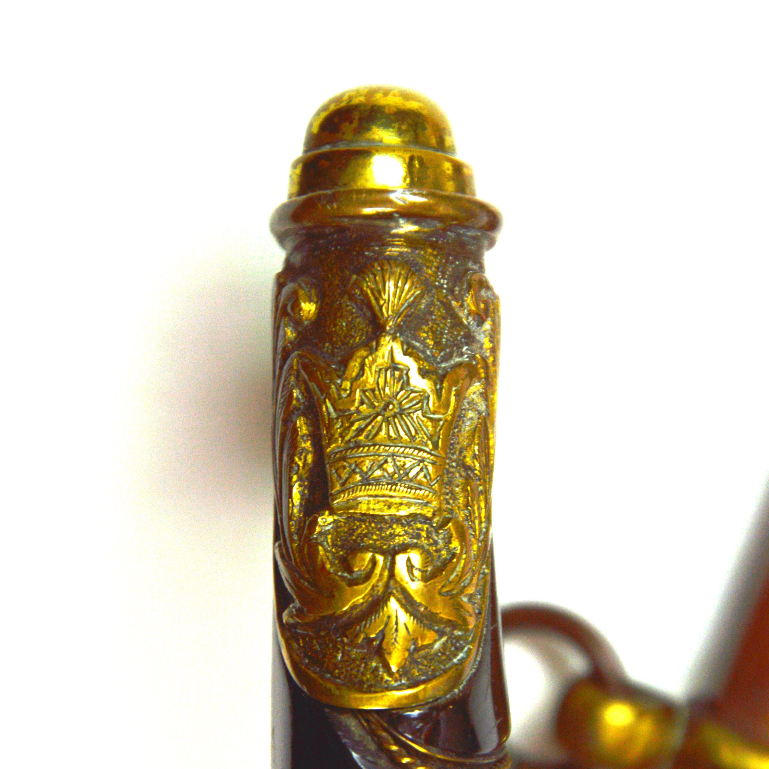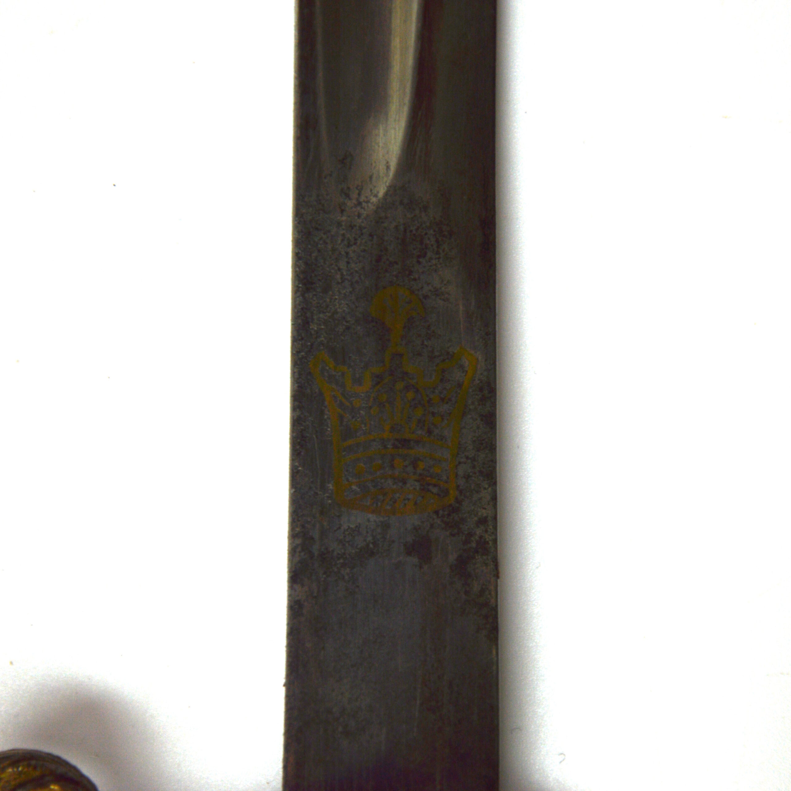 The sword features a straight single-edged blade with a fuller and is decorated with a gilt Pahlavi imperial crown on the ricasso, indicating it is from the early Pahlavi era of Iran. This sword shows European influence in blade form and decoration, in particular the types of infantry officer sword worn by French, German and Russian forces. The hilt, also decorated with the Pahlavi crown, incorporates a guard with a quillon incorporating a loop. The guard is of a knuckle-bow design, paired with a shiny black grip material bound with brass wire. The pommel is a rounded nut, allowing for the handle to be removed in its entirety.