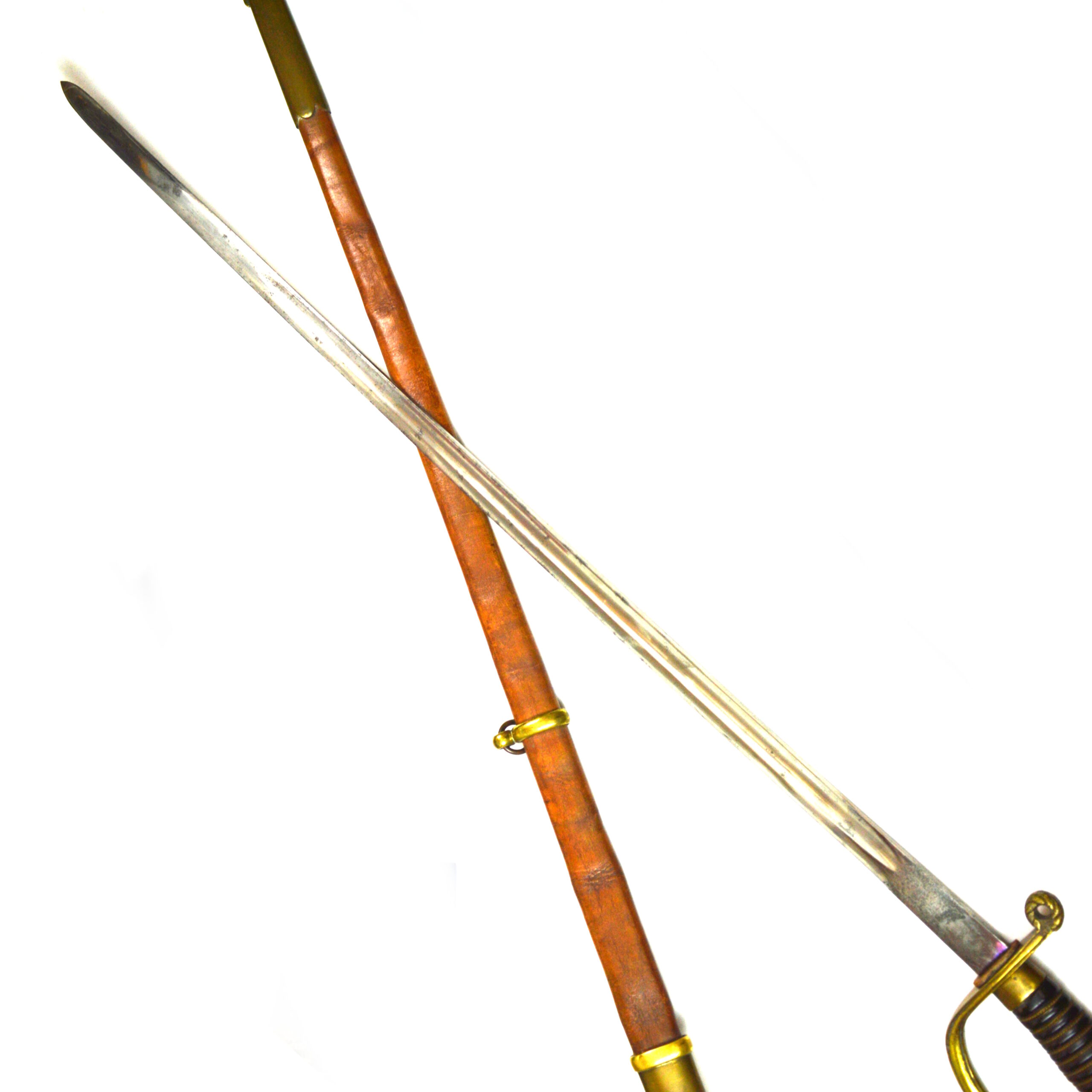 This example is accompanied by its scabbard, constructed from brown leather with brass mounts, designed to protect the blade and complete the set for wear. Together, they provide a representative example of Persian military edged weapons from a period of transition and adaptation.