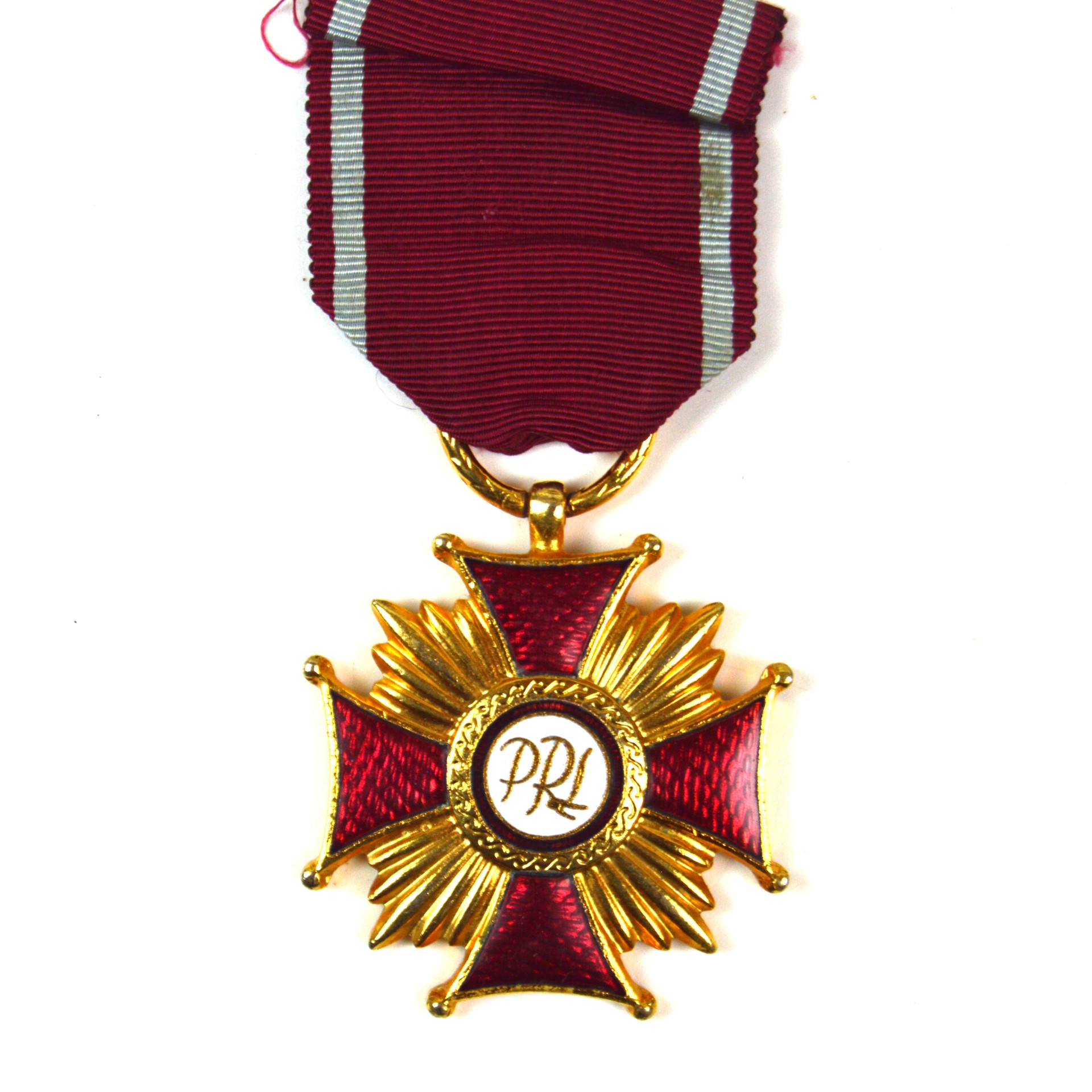 The Cold War-era Order features a red enamel Maltese cross edged in gilt, with a central white enamel medallion that reads “PRL”. The Gold Class is the highest grade within this version of the Order of Merit, signifying distinguished contribution at a national or international level.