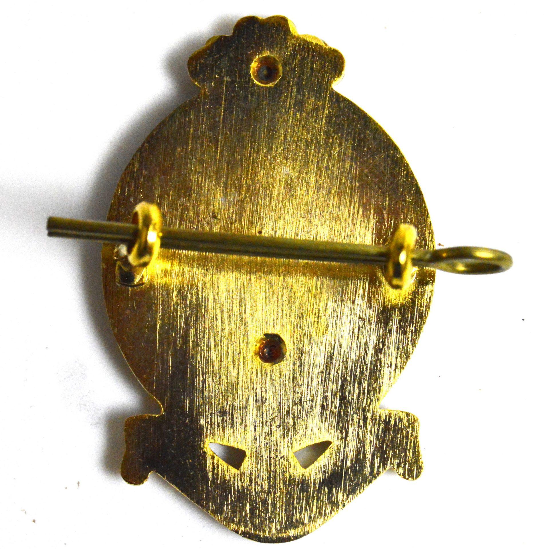 Gilt and Silver plate cap/beret badge with scarlet enamel background and blue enamel with east-west eyed-shank fitting.