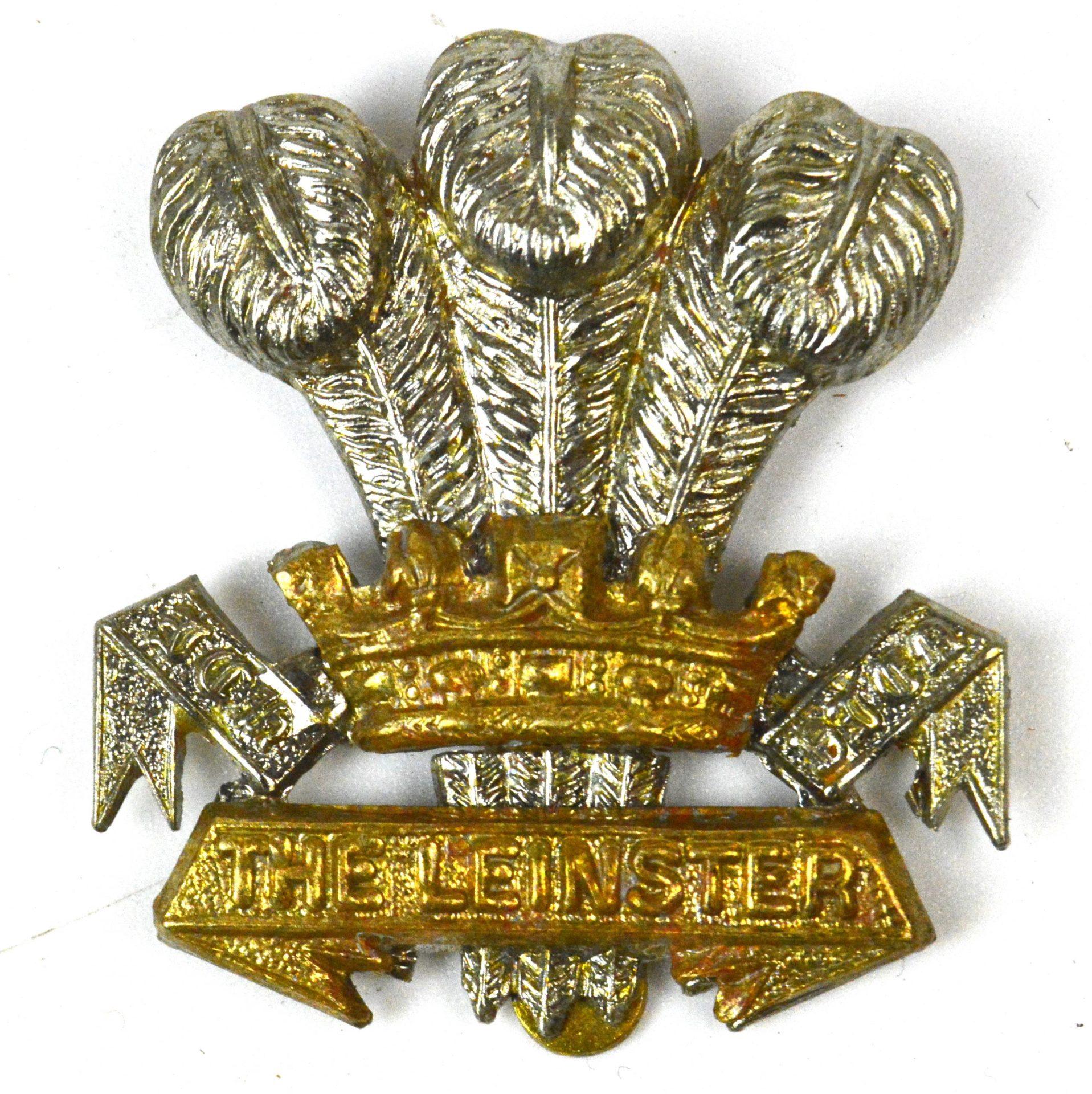 A restrike cap badge of the Prince of Wales’s Leinster Regiment (Royal Canadians), produced in the style of the original British Army pattern worn before the regiment’s disbandment in 1922. This British and Irish military cap badge displays the recognised Leinster Regiment insignia in defined relief, incorporating characteristic elements such as the Prince of Wales’s feathers. Executed in bimetal (white metal and gilding metal) with clear detailing, it is suitable as a collectable display example, reference piece, or for completion of non-original collections of Irish regiment insignia, British Army cap badges, and First World War era military memorabilia. The reverse is fitted with a standard hook slider for secure attachment.