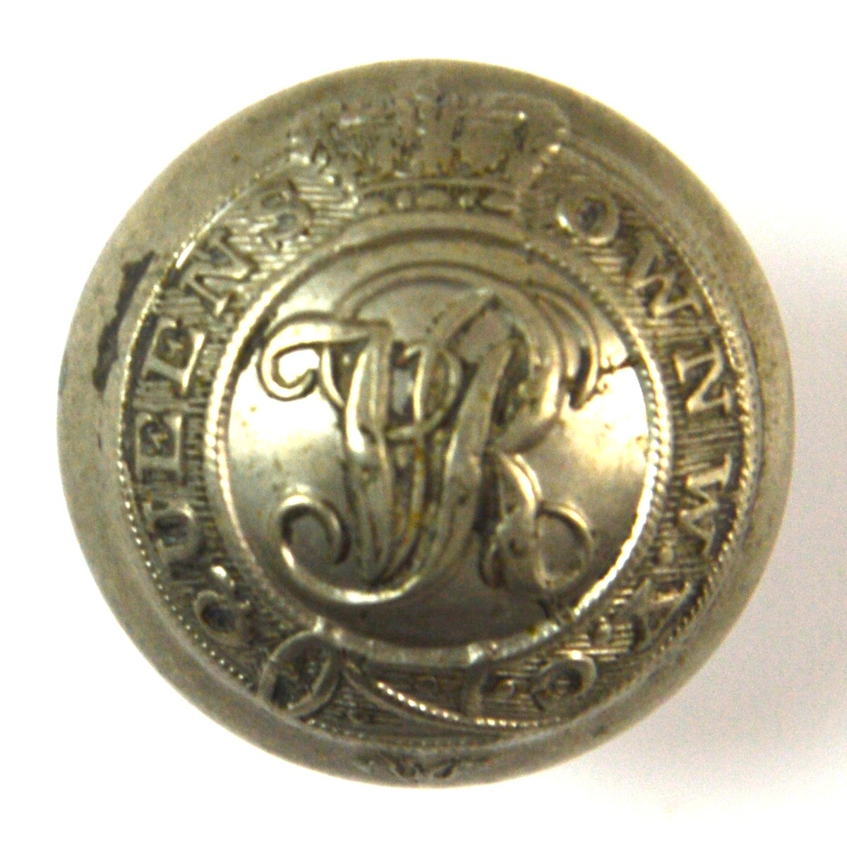 Victorian-period button of the Queen’s Own Worcestershire Yeomanry Cavalry, produced to the long-serving 1837–1887 pattern, before being renamed the “Queen’s Own Worcestershire Hussars”. The design features the regiment’s distinctive crowned centre, encircled by the text “QUEEN’S OWN WYC”. Worn on full dress and service garments, buttons of this pattern were standard throughout much of the regiment’s 19th-century existence.