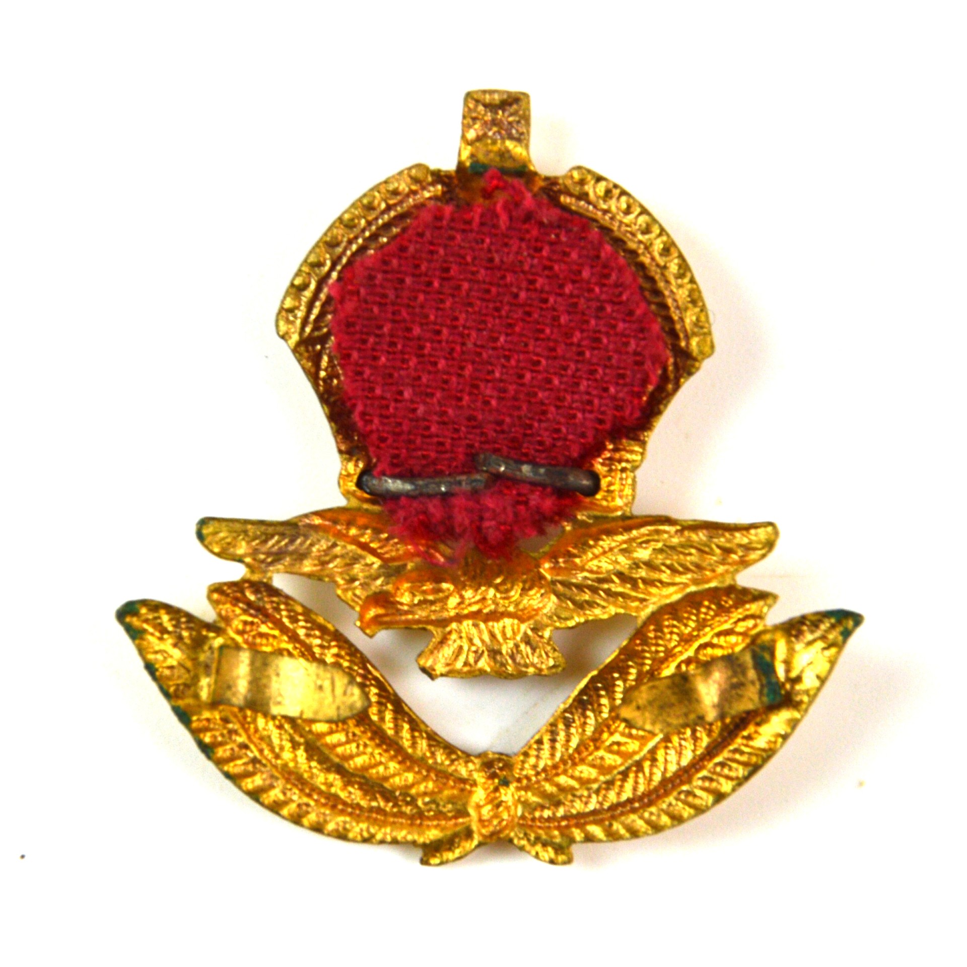 Royal Air Force officers’ beret badge produced in gilt metal in the King’s Crown pattern, worn until 1952 by commissioned officers of the Royal Air Force. This British military air force officer’s headdress badge displays the recognised RAF device in gilt, incorporating an eagle volant affronté with head lowered and turned to the sinister as the central device, surmounting a double-wreath, the whole ensigned by an Imperial King’s Crown with a velvet cushion detail. The beret badge is the smaller field dress pattern of the officer’s badge, distinguished from the full-size service dress cap badge worn on the peaked cap.