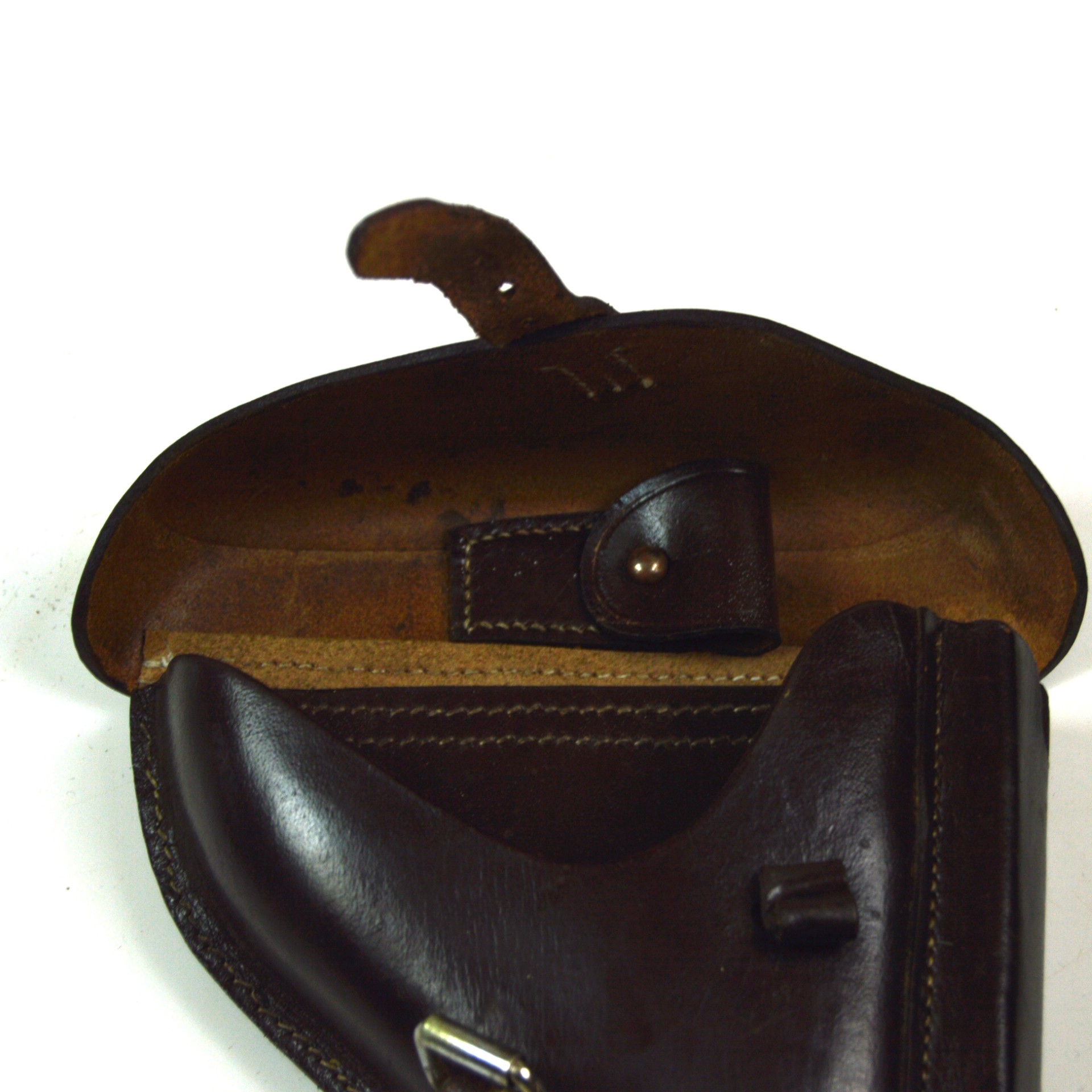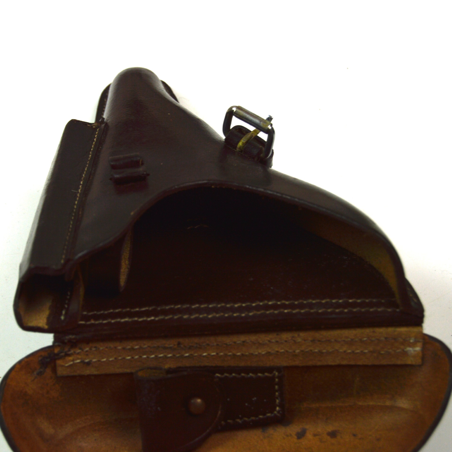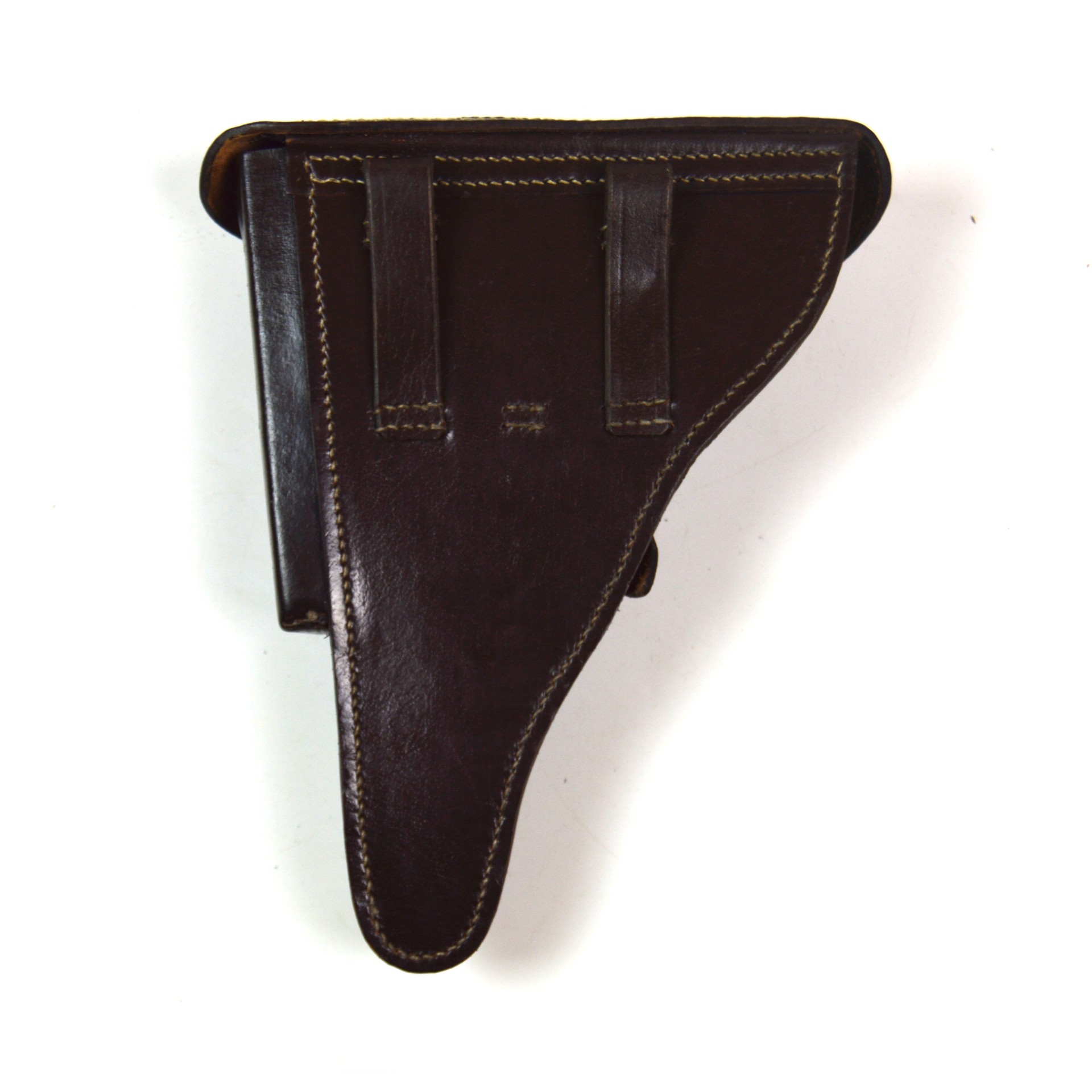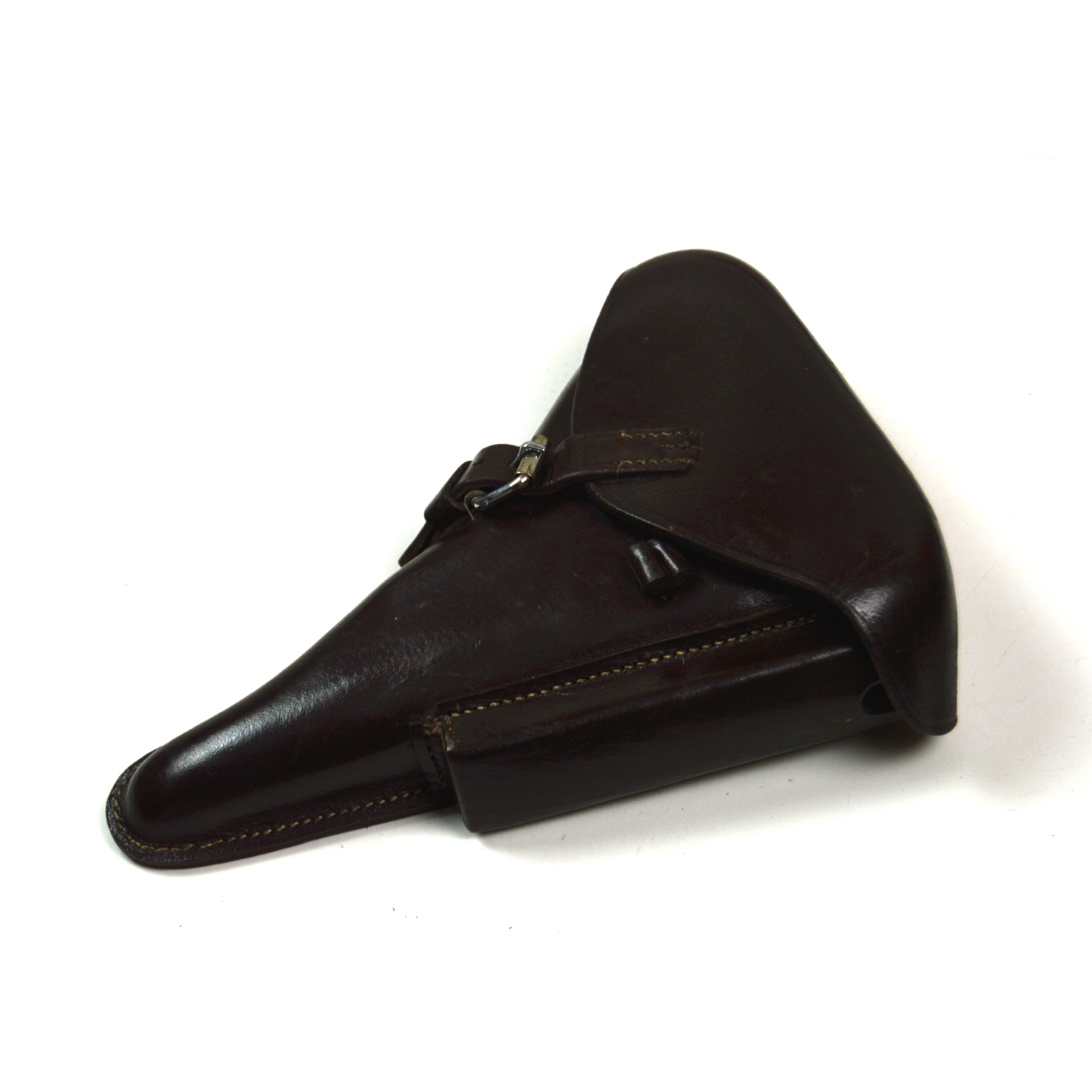 Reproduction German P08 Luger Hard Dark Brown Leather Shell Holster. Typical of the design used by the German Army in the First and Second World Wars worn by officers, machine gunners and motorcycle crews.