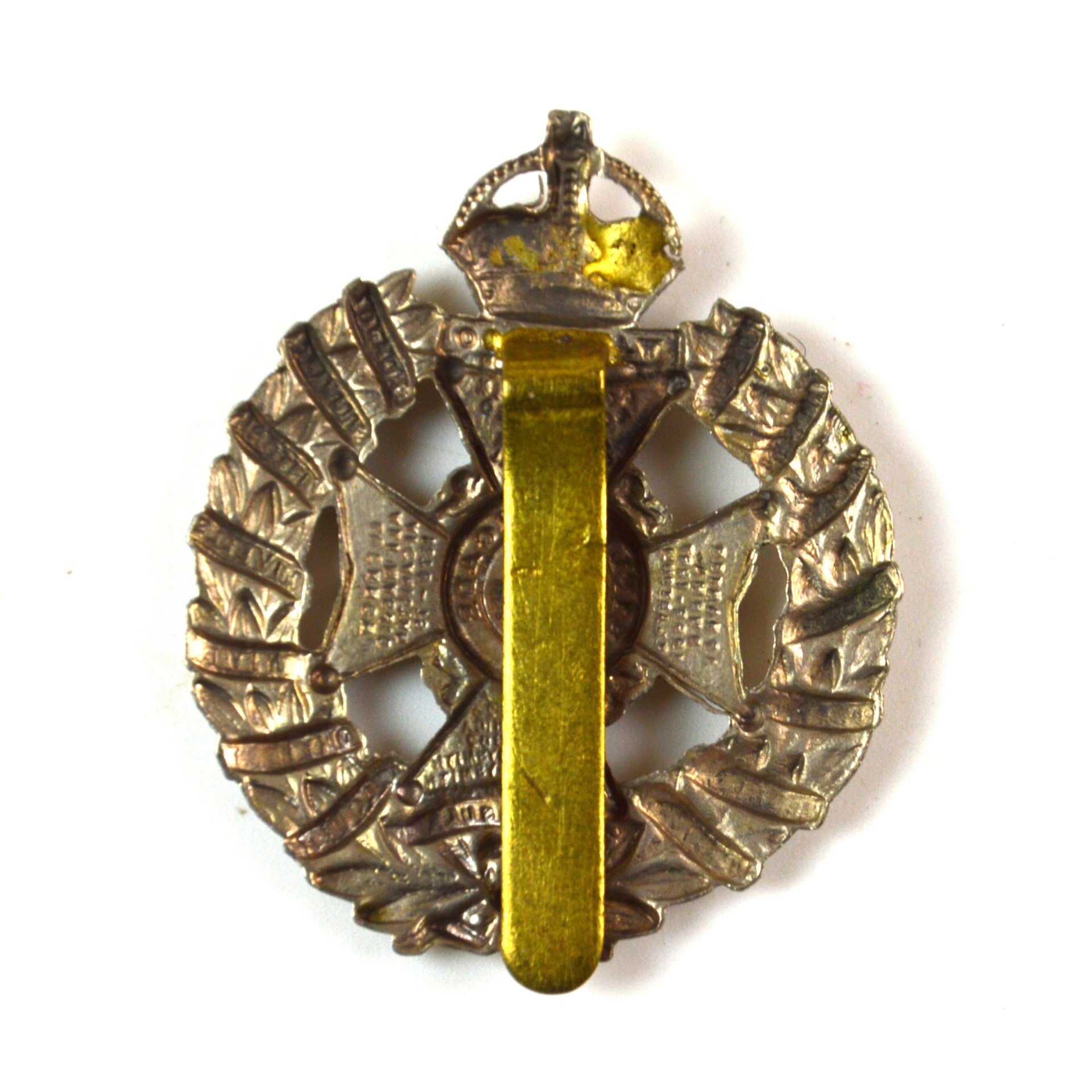 An original British Army cap badge of the Rifle Brigade (The Prince Consort’s Own), conforming to the 1910-1927 pattern and featuring the King’s Crown, indicating issue during the reign of George V. This First World War era and early 20th-century Rifle Brigade cap badge is executed in white metal with sharp, well-defined relief detailing, displaying the regiment’s distinctive maltese star with battle honours, surrounded by a wreath, also intertwined with various battle honours. Designed for wear on service dress headdress, it represents a desirable example of British Army WW1 militaria, Rifle Brigade insignia, and collectable Commonwealth military badges. The reverse retains the original hook slider for secure attachment, consistent with period manufacture.