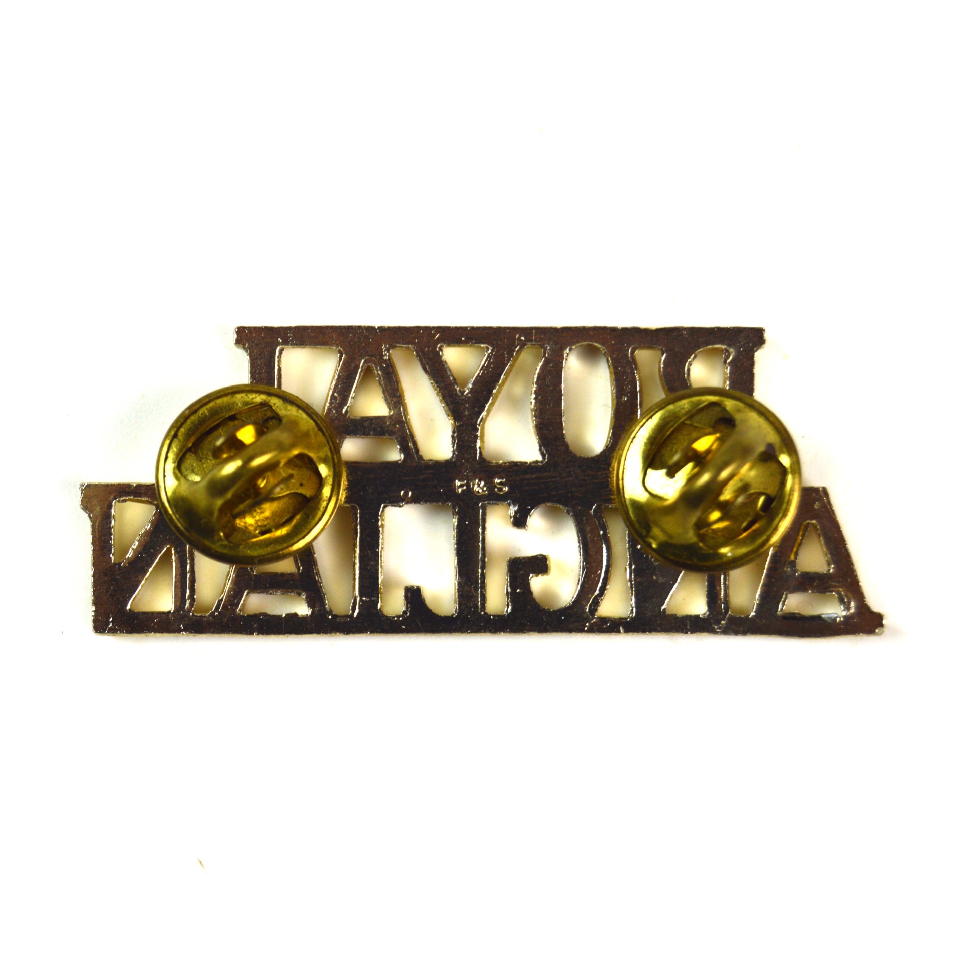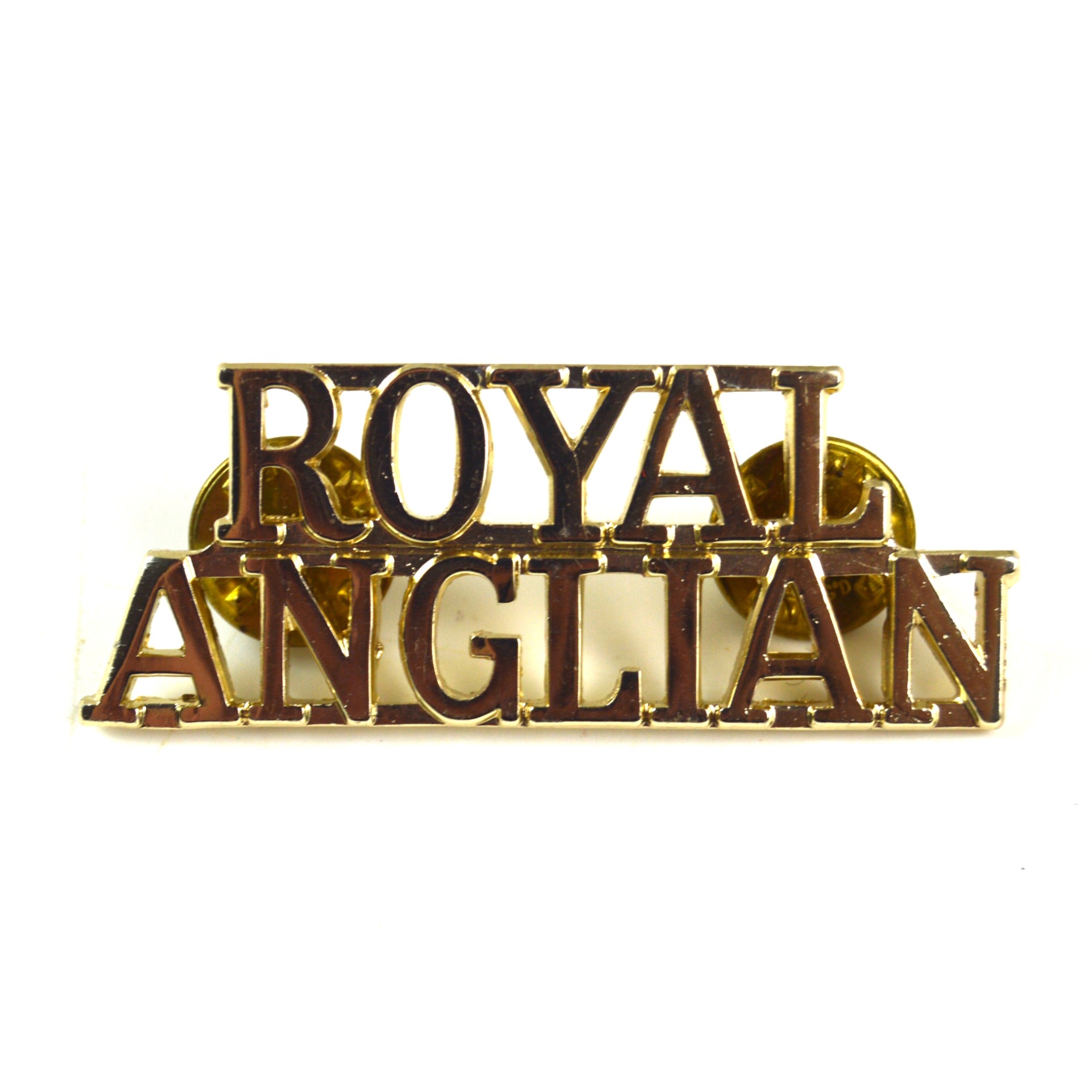 An original anodised aluminium (Staybrite) shoulder title for the Royal Anglian Regiment, introduced following the regiment’s formation in 1964 through the amalgamation of several East Anglian regiments. This post-1964 pattern features the two-line designation “ROYAL / ANGLIAN” in bold block capitals. Lightweight and bright in finish, this Staybrite title was worn on the No. 2 Service Dress and other uniforms by all ranks throughout the Cold War era and into modern service. It replaced the older brass shoulder titles of the predecessor regiments, such as the Royal Lincolnshire, Northamptonshire, and Suffolk Regiments.