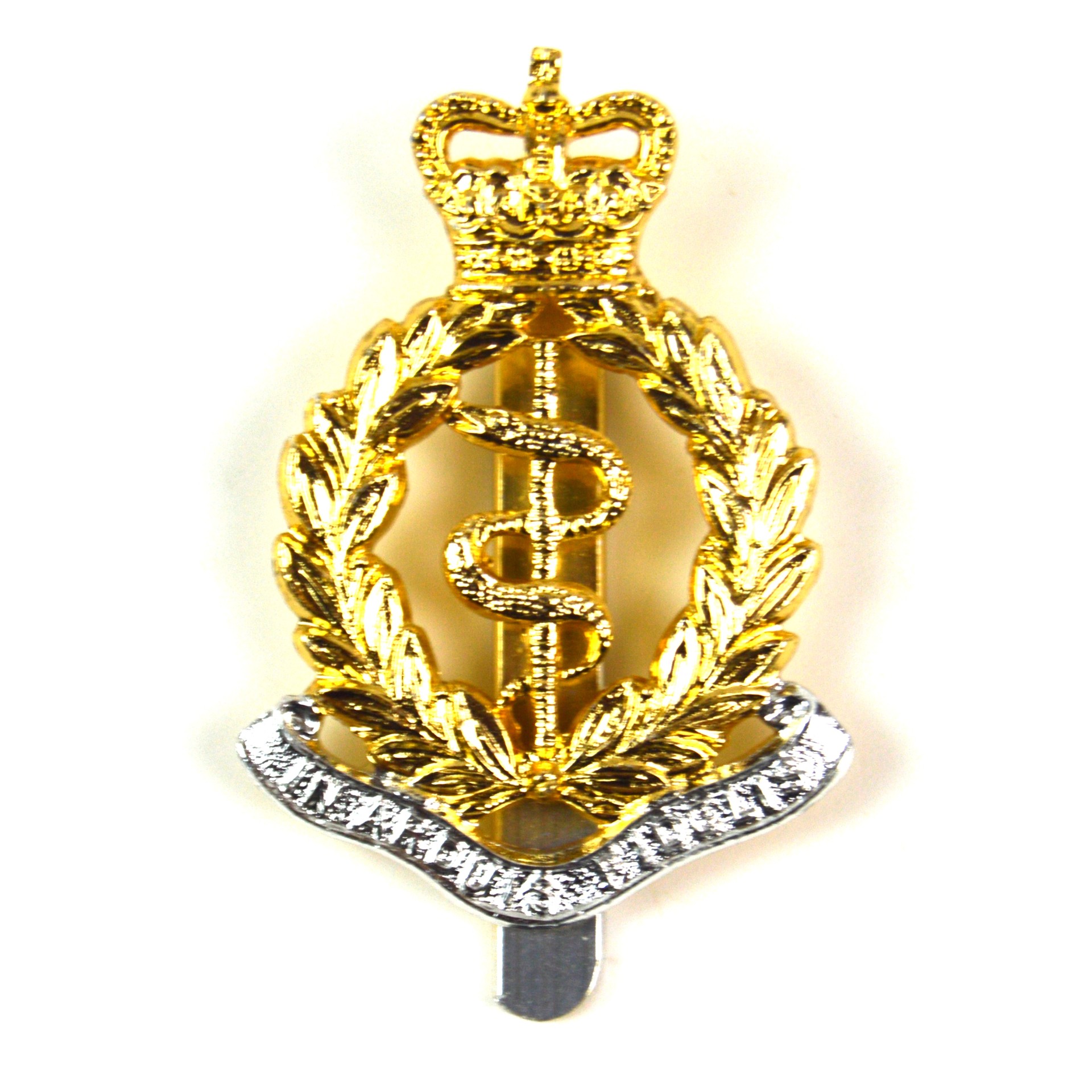 The design consists of the traditional Rod of Asclepius—the symbol of medicine—encircled by a laurel wreath and surmounted by the St Edward’s (Queen’s) Crown, signifying service under Queen Elizabeth II. The scroll below reads “In Arduis Fidelis” (Faithful in Adversity) . The anodised finish retains its bright silver and gold anodised aluminium.
