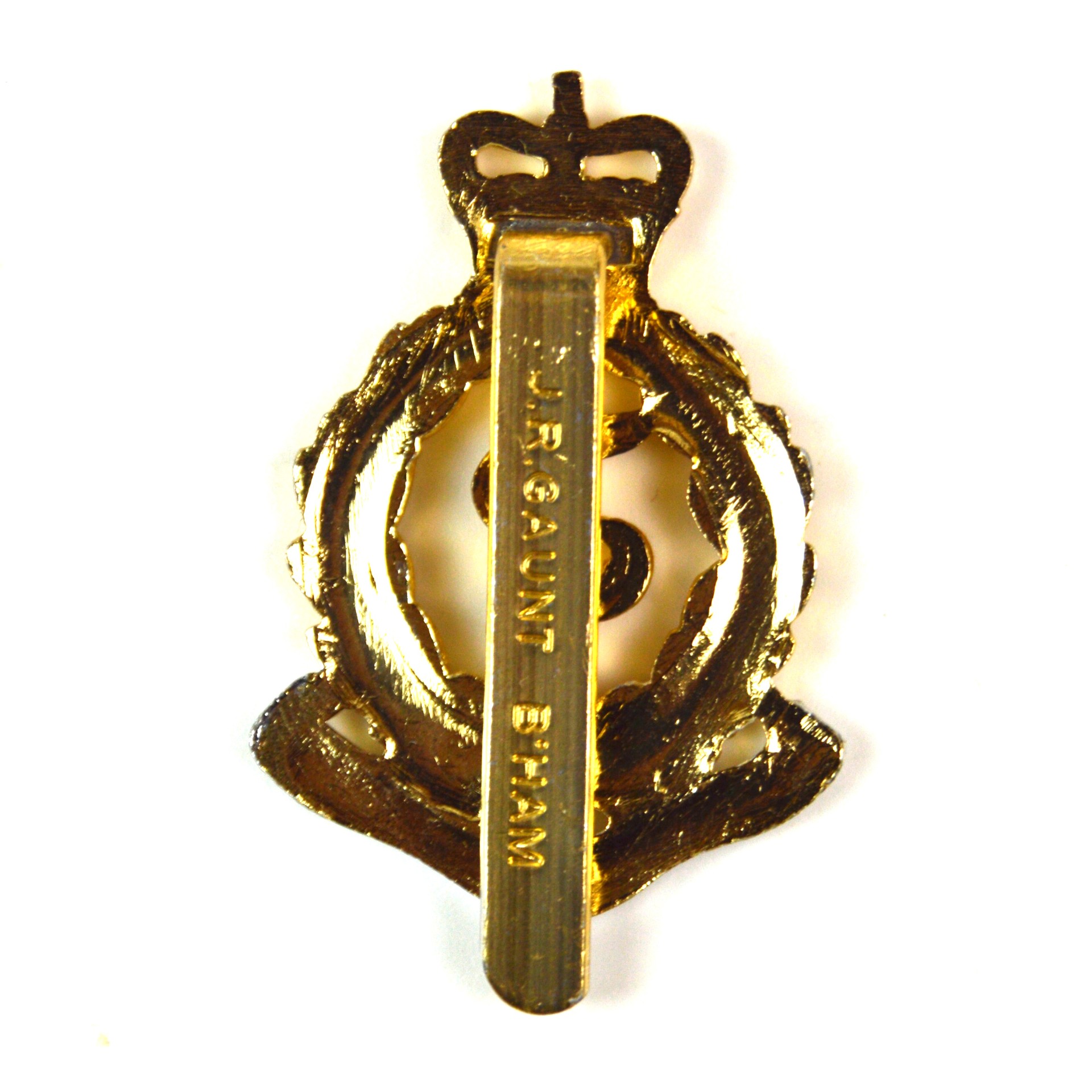 An anodised aluminium cap badge to the Royal Army Medical Corps (RAMC), featuring the Queen’s Crown, as introduced in the early 1950s and worn throughout the latter half of the 20th century. This lightweight staybrite badge was standard issue for RAMC personnel, replacing earlier brass and bi-metallic versions post-WWII.
