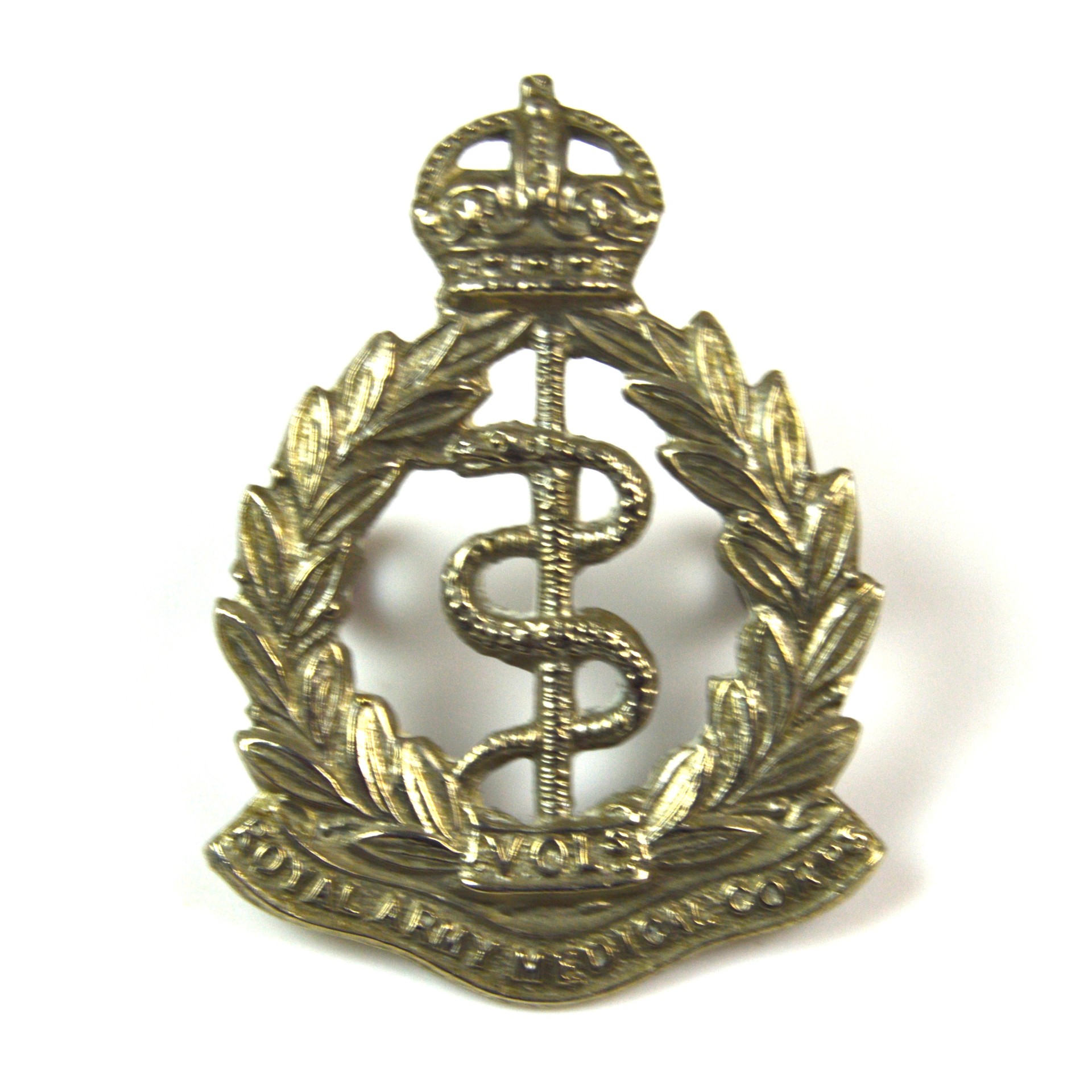 Struck in white metal, this badge features the iconic Rod of Asclepius — a serpent-entwined staff — encircled by the inscription: “Royal Army Medical Corps” below a laurel wreath, and surmounted by the King’s Crown (Tudor Crown). Distinctively, this version is inscribed with “VOLs” at the bottom of the laurel, identifying it as a Volunteer Force issue before their reorganisation into the Territorial Force in 1908.