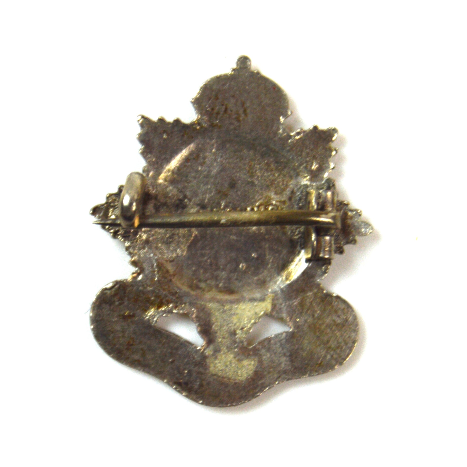 This brooch displays the early pattern RASC badge — crowned garter belt design surrounding the initials “ASC” and scroll that reads “Army Service Corps”, finished with fine coloured enamel. Marked on the reverse “sterling” and fitted with a pin and simple clasp, perfect for wearing on a blouse, lapel, or dress.