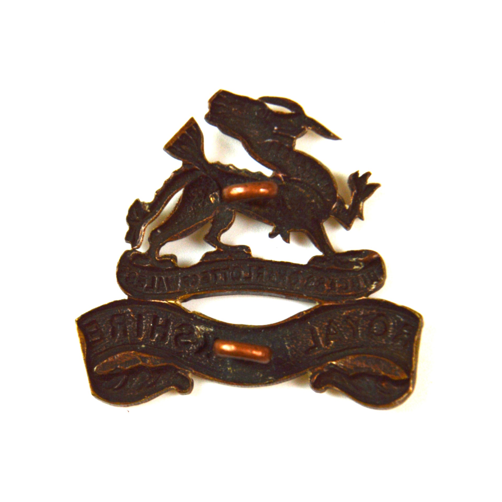 An original 1902–1934 pattern officer’s service dress collar badge for the Royal Berkshire Regiment. Struck in bronze for officer wear, the design features the regiment’s heraldic dragon surmounting a 2-line scroll bearing the title Princess Charlotte of Wales’s Royal Berkshire. This pattern was introduced following the adoption of service dress in the early 20th century and worn up until 1934, when the design was changed to match the design of the cap badge. Reverse retains original north-south eyed lug fittings for attachment.