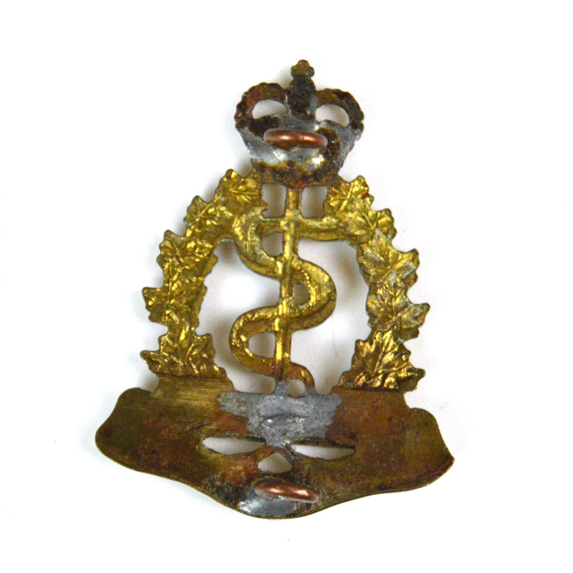 An original cap badge. Royal Canadian Army Medical Corps Queens Crown Cap Badge, Repaired. A quality addition to any Canadian badge collection.
