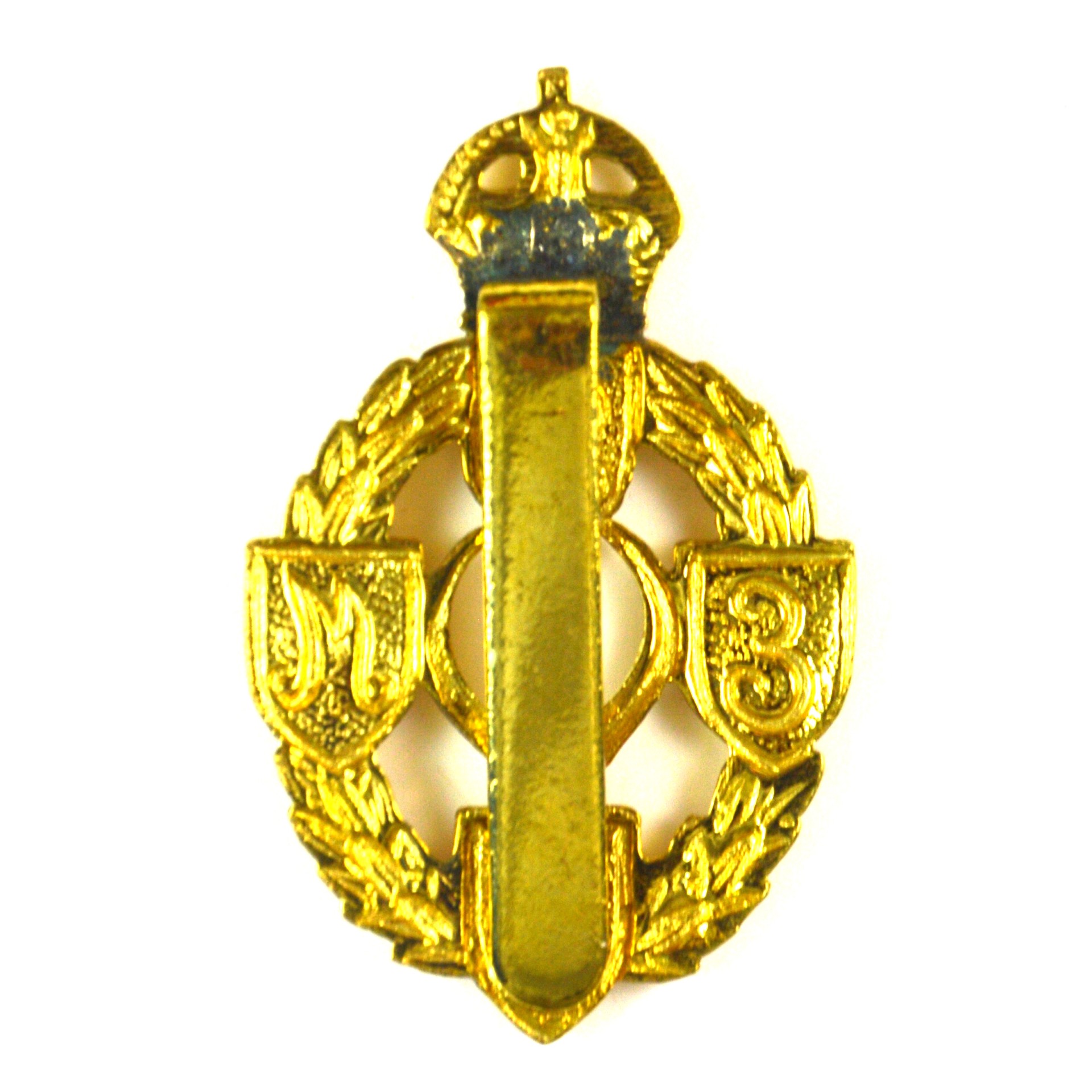 The Royal Electrical and Mechanical Engineers were established in 1942 to bring together the maintenance, recovery, and repair functions of the British Army’s equipment and vehicles. The king’s crown used on this pattern reflects the reign of King George VI, placing it firmly within the wartime and immediate post-war period. Cap badges of this type were worn on headdress, identifying corps affiliation during its formative years.
