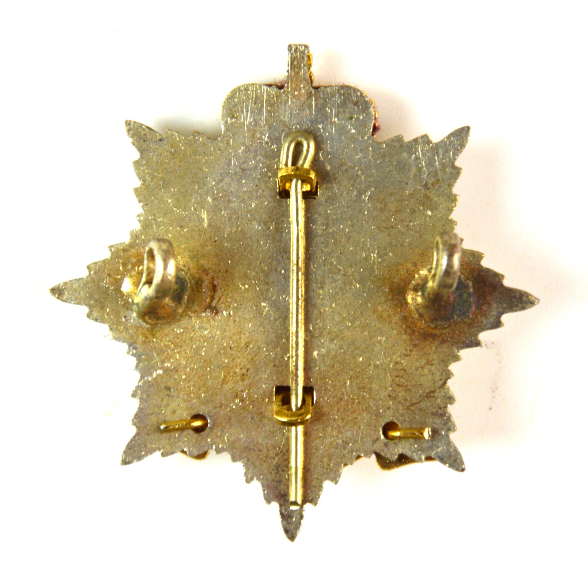 This is the classic post-1953 officer-quality pattern combining silver plate, gilt, and enamel—distinct from the all-brass or anodised OR versions.