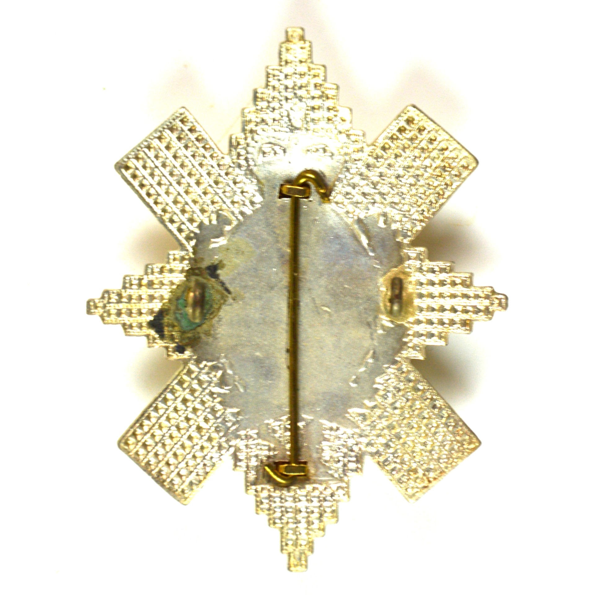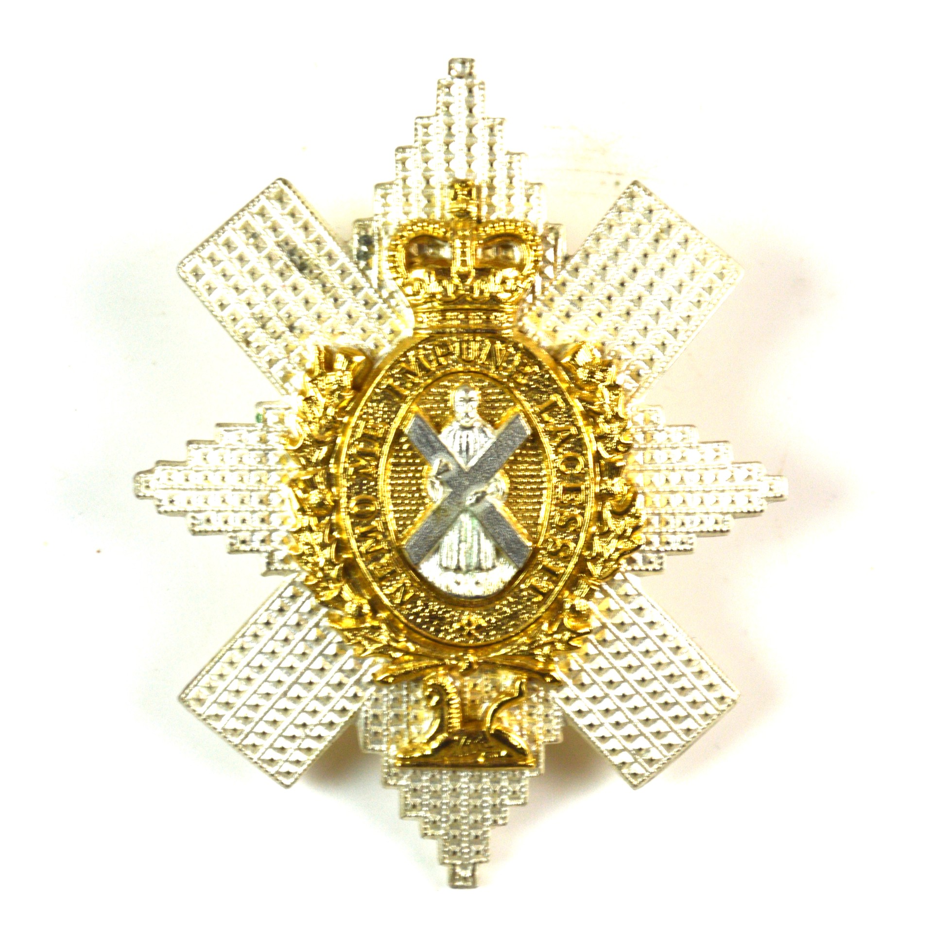 Officer’s silver plate and gilt glengarry badge for the Royal Highlanders (Black Watch), produced to the post-1953 pattern incorporating the Queen’s Crown. The badge features the prominent St Andrew with a cross within a cirlcet bearing the motto “Nemo me impune lacessit” (Latin: No One Provokes Me with Impunity), with the star of the Order of the Thistle, thistle sprays with finely finished gilt highlights to the central device and silver plate to the surrounding star. Worn on the glengarry cap by officers, this badge reflects the Black Watch’s strong Highland identity and long regimental tradition, continuing the lineage of one of the British Army’s most distinguished infantry regiments.