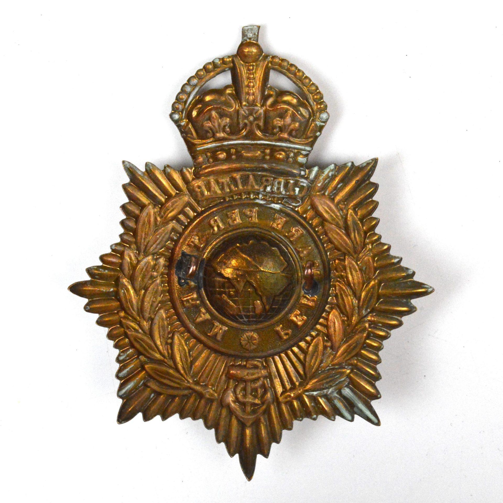 Royal Marine Blue Cloth Helmet Plate, Other Rank’s King’s Crown, Gilding metal. worn on the white ‘Parade Helmet’ 1922-1952.