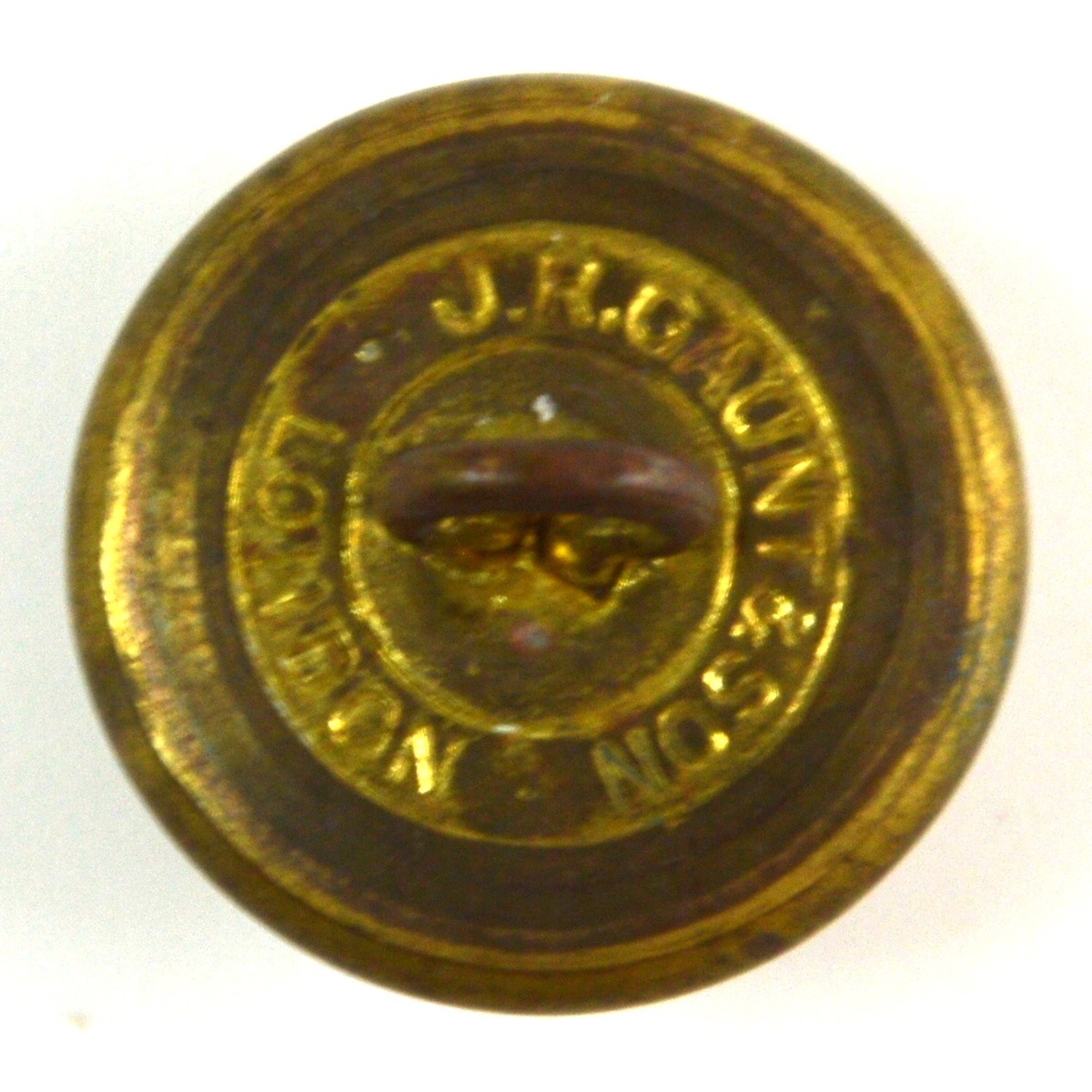 Royal Tank Regiment brass button, King’s Crown, measuring 25mm in diameter. Introduced in 1939 after the regiment’s renaming, the face displays the Royal Tank Regiment cypher of the initials “RTR” in running script surmounted by the King’s Crown. This 19mm size was standard issue for tunics and service jackets.