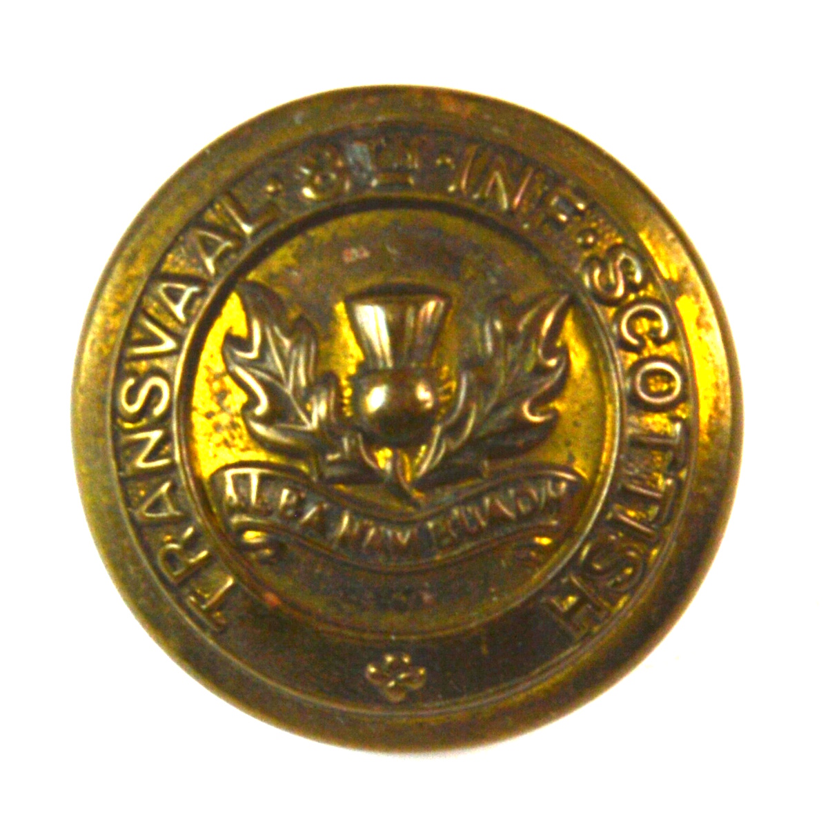 Manufactured in brass with a loop shank fitting to the reverse, this example provides a well-defined representation of South African military insignia. Transvaal Scottish buttons are collected as examples of Commonwealth militaria, Scottish-influenced regimental insignia, and twentieth-century infantry uniform components.