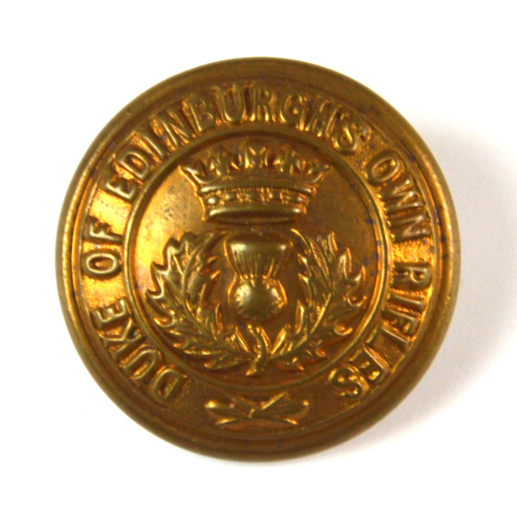Duke of Edinburgh’s Own Rifles uniform button in brass finish, produced in the pattern worn by the Duke of Edinburgh’s Own Rifles of the South African Army. This South African Army rifle regiment uniform button displays the recognised regimental device in clear relief, incorporating a thistle as the principal device, with the regiment’s title encircling a central thistle, surmounted by a Royal Ducal Coronet at the topmost point. The reverse carries a shank loop for attachment. The composition reflects the Scottish volunteer heritage of the regiment and the personal patronage of Prince Alfred, Duke of Edinburgh, after whom the regiment was named.